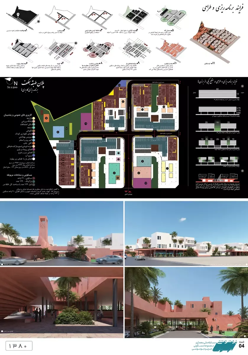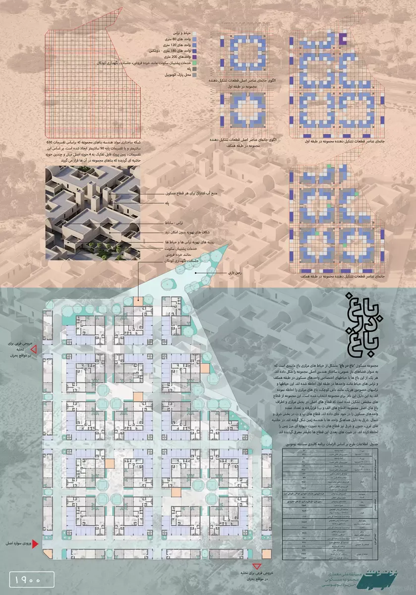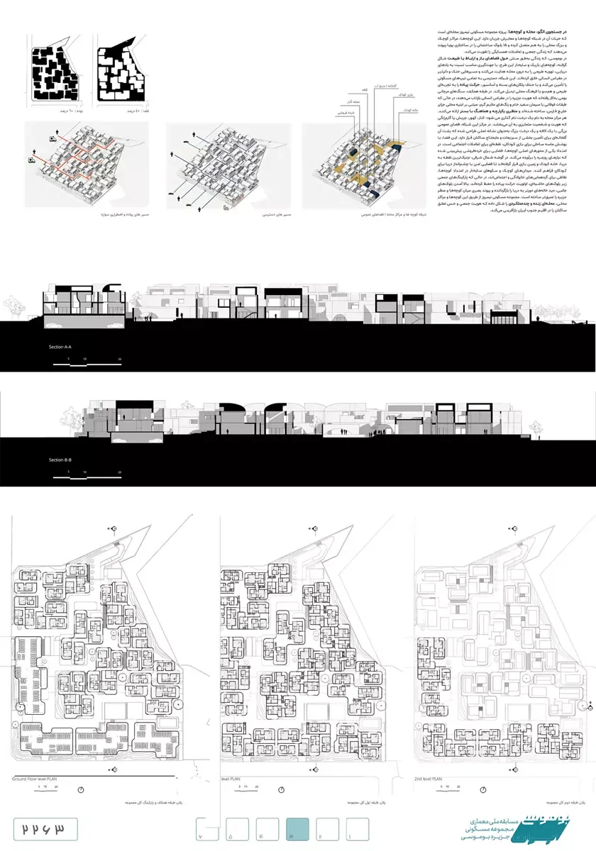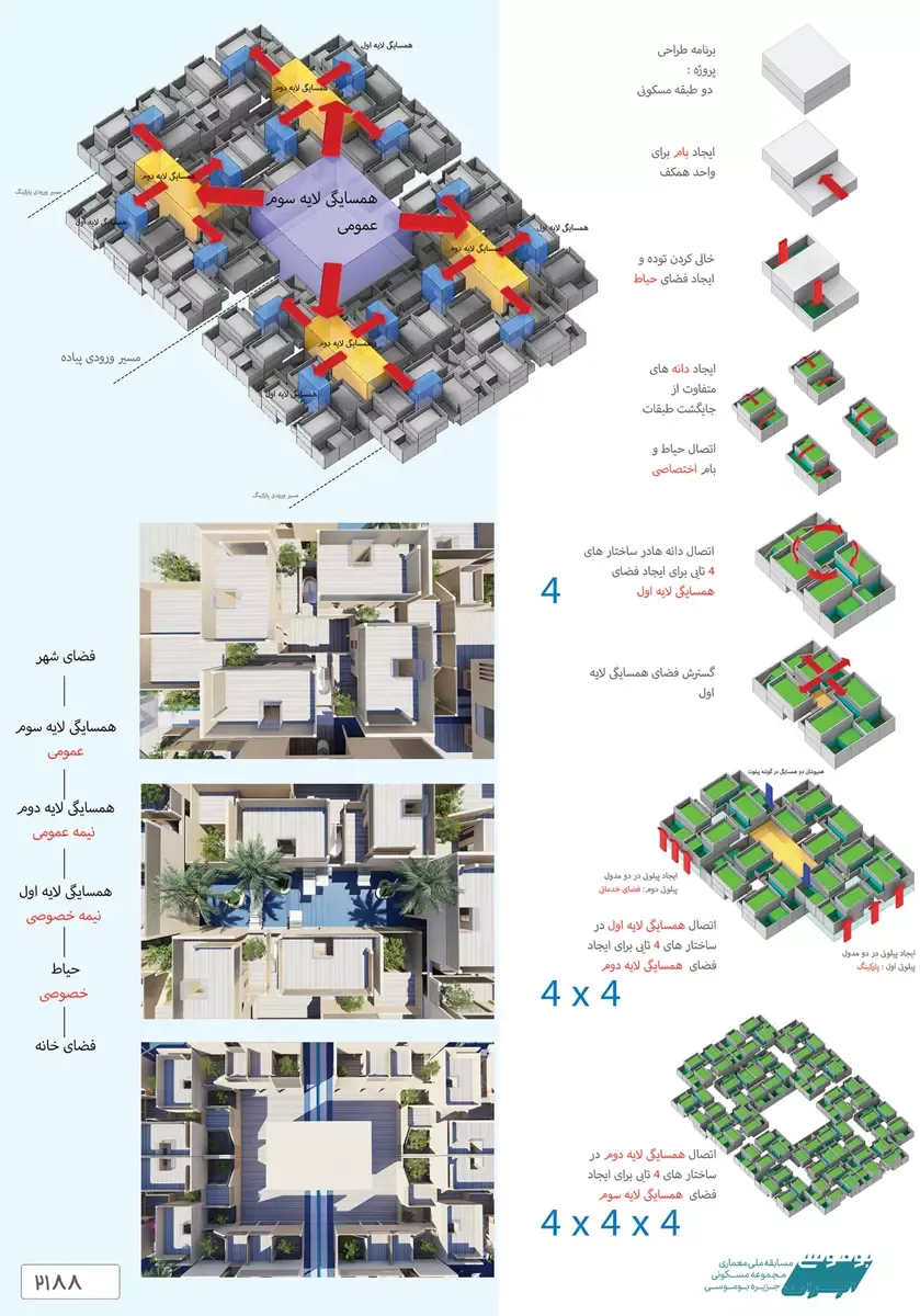 توده گذاری: ابتدا سایت پروژه به 5 بخش بلوک مسکونی (برزن) تقسیم شد و با ایجاد گشایش هایی در این بلوک ها، میدان گاه هایی درون آن شکل گرفت و حول این میدان ها کوچه هایی در تراز اول برای رسیدن به خانه ایجاد شد. کوچه‌های باریک و منظم با حداکثر سایه‌اندازی و بهینه‌ترین کوران هوا. کوچه هایی مناسب برای بازی کودکان و نشستن و صحبت کردن همسایه ها و به دور از آلودگی اتومبیل ها.