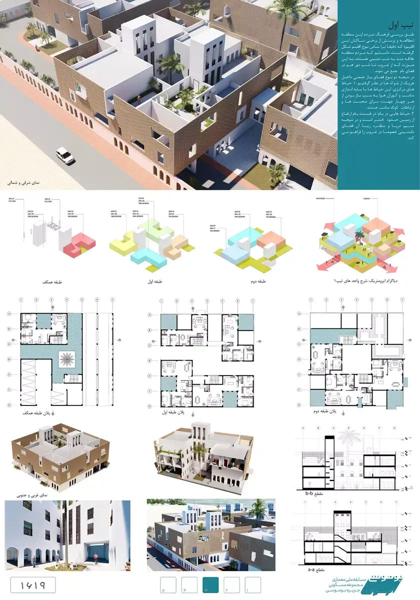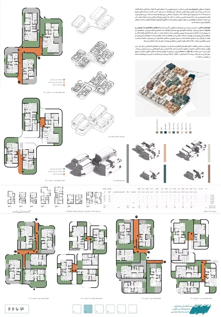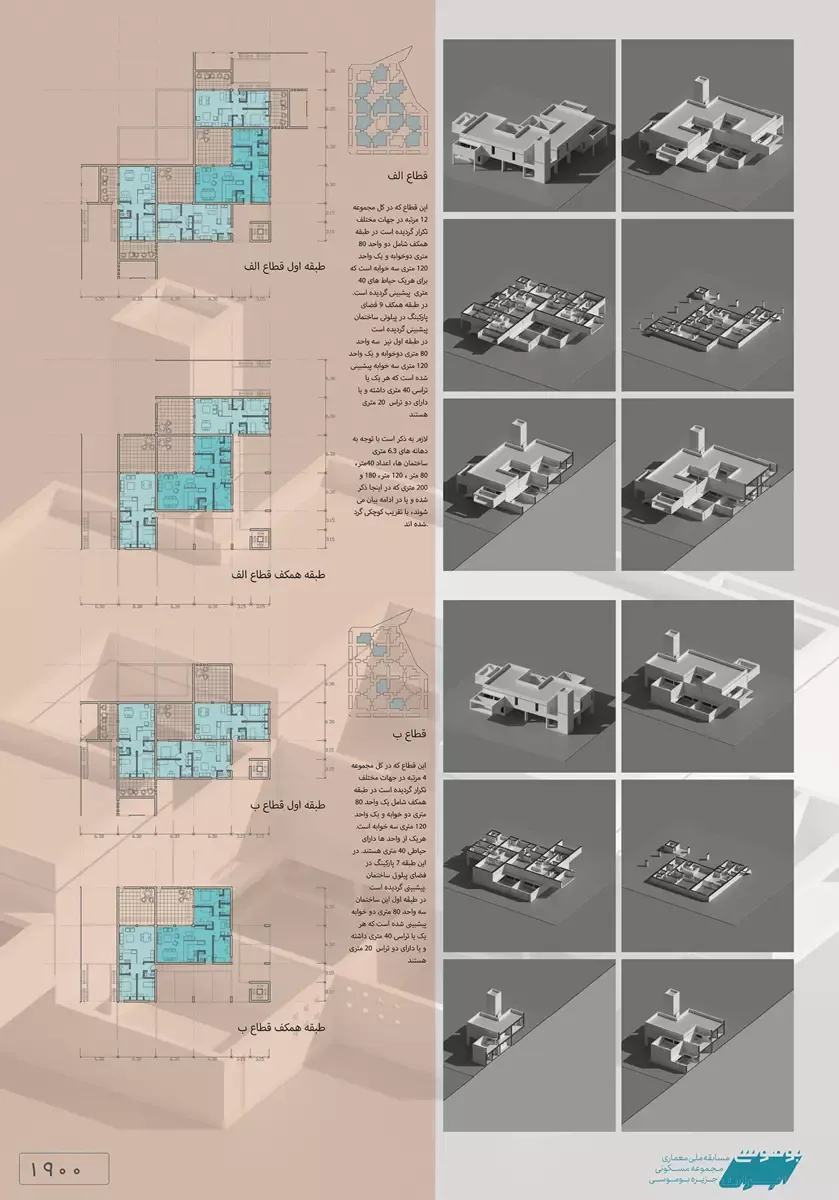 این مجموعه برای تأمین مسکن، از 15 بلوک ساختمانی تشکیل شده که بر پایه 5 تیپ اصلی طراحی شده‌اند. این بلوک‌ها شامل 7 تیپ خانه با مساحت‌های 95 تا 190 مترمربع هستند که به‌صورت متنوع درون بلوک‌ها چیده شده‌اند. این سازمان‌دهی، نظم و قابلیت گسترش را در ساخت تضمین می‌کند، اما با حفظ تنوع، هویت متمایزی به هر واحد می‌بخشد. کوچه‌های داخلی، دسترسی میان واحدها را فراهم کرده و شبکه‌ای از فضاهای باز خصوصی و مشترک را شکل می‌دهند. بلوک‌ها طوری روی هم قرار گرفته‌اند که خانه‌های پایین‌تر حیاط‌های باز یا سرپوشیده داشته باشند و طبقات بالاتر از تراس‌های روباز بهره‌مند شوند. این چیدمان با دقت تنظیم شده تا از دید مستقیم میان حیاط‌ها و تراس‌ها جلوگیری کند و حریم خصوصی را حفظ نماید، ضمن اینکه تهویه و نورگیری بهینه را تضمین می‌کند.
