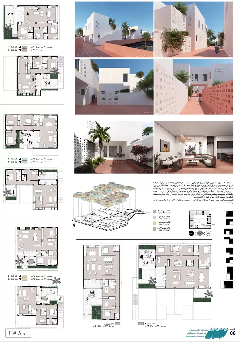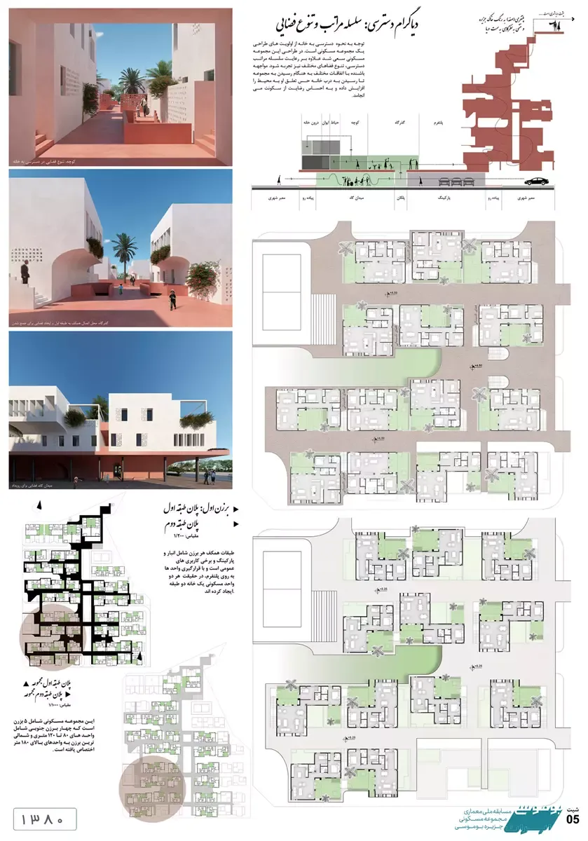 خانه و دسترسی: با توجه به تنوع باشندگان از افراد بومی و غیربومی، سعی شد در طراحی خانه ها، فضایی برای سکونت کردن، در خانه بودن و خیال کردن برای سلایق و عادات مختلف طراحی گردد. به این ترتیب 8 تیپ واحد مسکونی طراحی گردید. این تنوع کنترل شده در پلان ها باعث تنوع در فرم و در نهایت افزایش خوانایی و آدرس پذیری مجموعه می شود. از طرفی تلاش شد جهت حفظ حریم و عدم مشرفیت، قابی در اطراف تراس ها تعبیه شود تا باشنده ی خانه بصورت منعطف امکان باز و بسته کردن حریم خود را داشته باشد.
