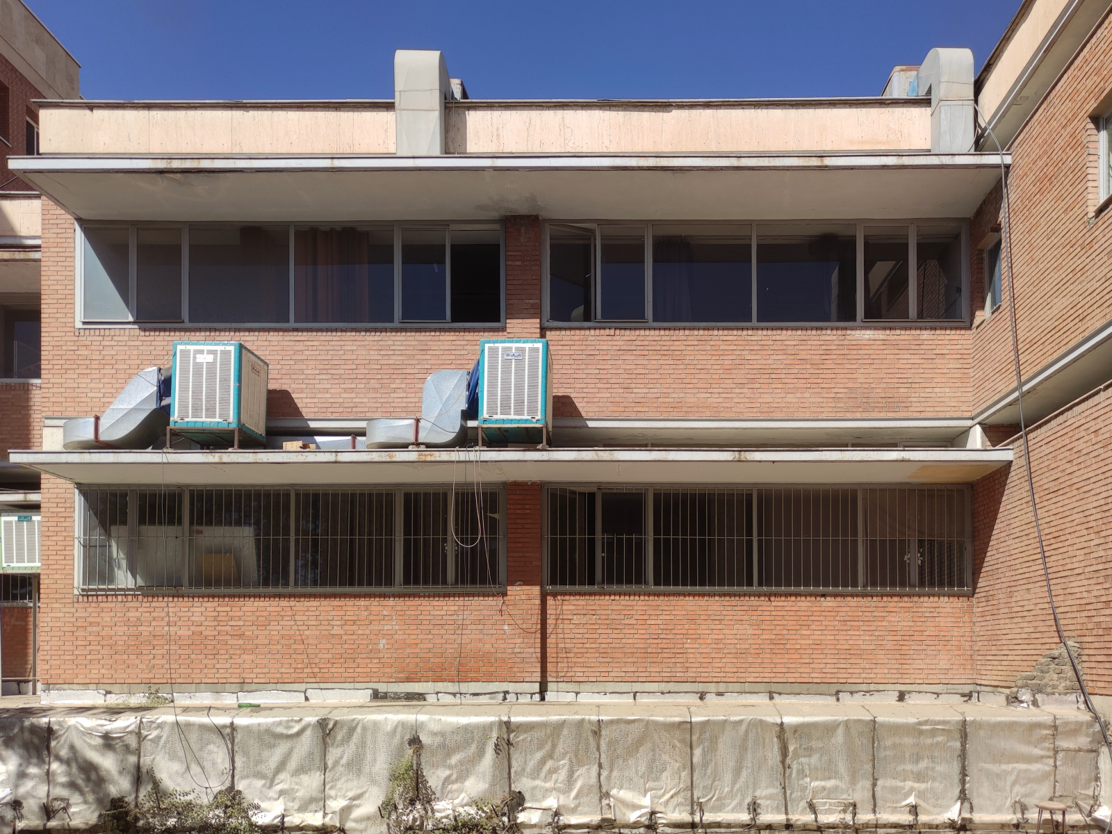 پلان طبقه همکف دانشکده معماري و شهرسازي دانشگاه شهید بهشتی. سالن دفاع با رنگ زرد مشخص شده است.