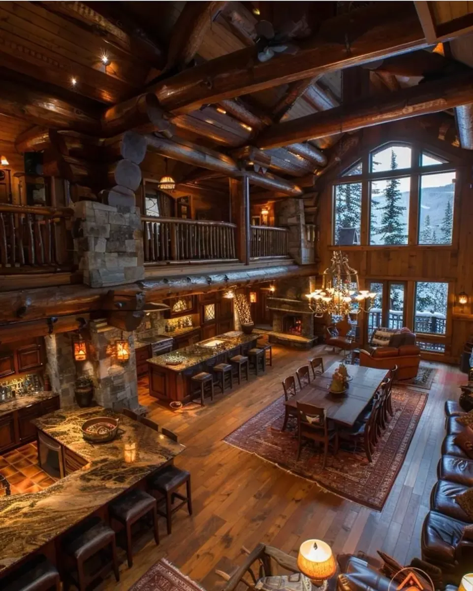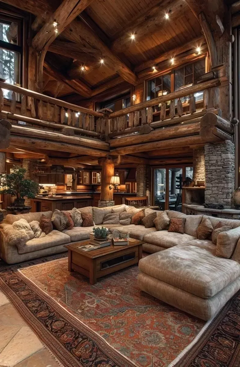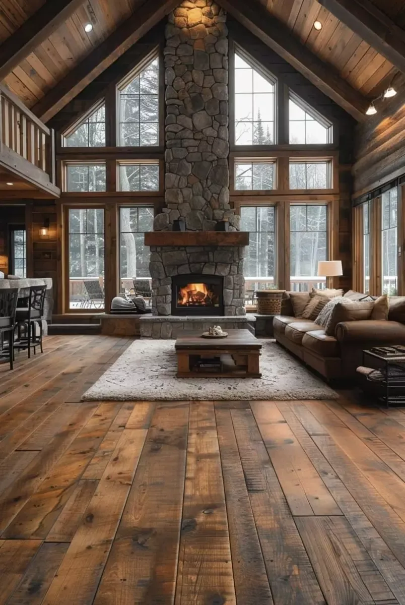 در این نمونه یک اتاق نشیمن روستیک دوطبقه دیده میشود. پنجرههای بزرگ نور طبیعی فراوان را وارد میکنند و از چوب زیاد در ساخت سقف و دیوارها استفاده شده است. مبلمان چوبی ساده با روکش چرمی و فرشهای پشمی، همهچیز را در فضایی گرم و گرمفام کنار هم نگه داشتهاند. شومینهٔ سنگی مرکزی نیز تضاد جذابی با خطوط صاف مبلمان ایجاد کرده و حس پایداری و اصالت را برجسته میسازد.
