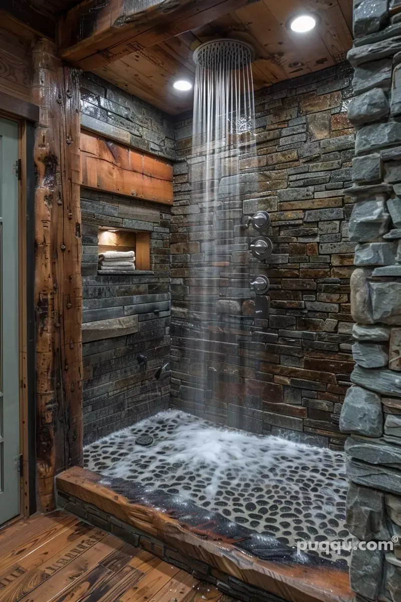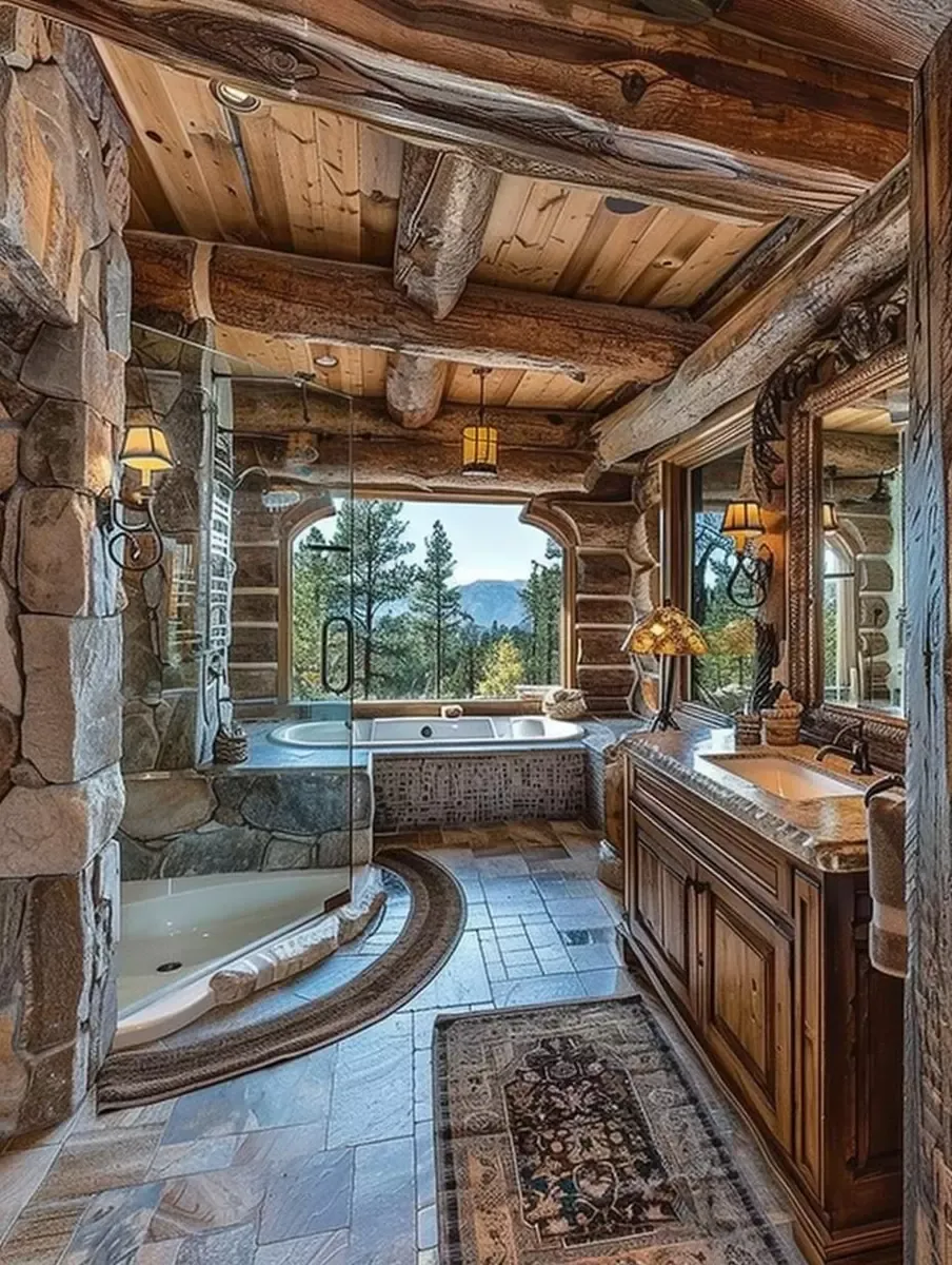 هرچند شاید حمام کمتر با سبک روستیک تداعی شود، اما استفاده از این سبک در طراحی سرویس بهداشتی میتواند نتیجهای چشمگیر داشته باشد. به گفته طراحان، یک حمام روستیک میتواند فضای سرد و ساده را به محیطی گرم و آرامشبخش تبدیل کند. در چنین حمامی معمولاً از چوب طبیعی برای پوشش دیوارها یا سقف استفاده میشود؛ بهعنوان مثال دیوارپوشهای چوبی طرح نردهای یا تایلهای شبیه چوب جلوهای خام و دلپذیر ایجاد میکنند. همچنین کفپوش حمام میتواند از جنس کاشیهای سنگی، آجری یا سرامیک با طرح چوب باشد تا حس گرمی و باستانی فضا را تشدید کند. بهعنوان مثال، یک روشویی چوبی ساده همراه با شیرآلات قدیمی و چوبپنجرههای تیره یا در گلولک (درب طویلهای) میتواند رنگ و بوی روستیک را به دستشویی ببخشد. در مجموع، حمام روستیک با ترکیب سنگ و چوب خام، حالتی از آرامش و نزدیکی به طبیعت را بهوجود میآورد.