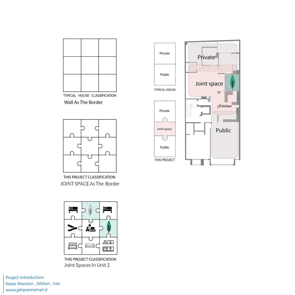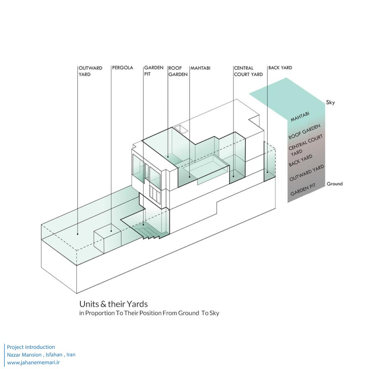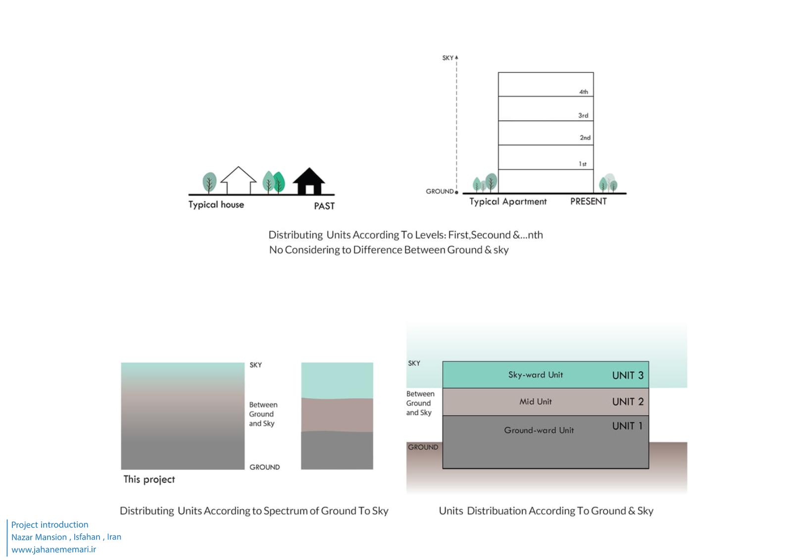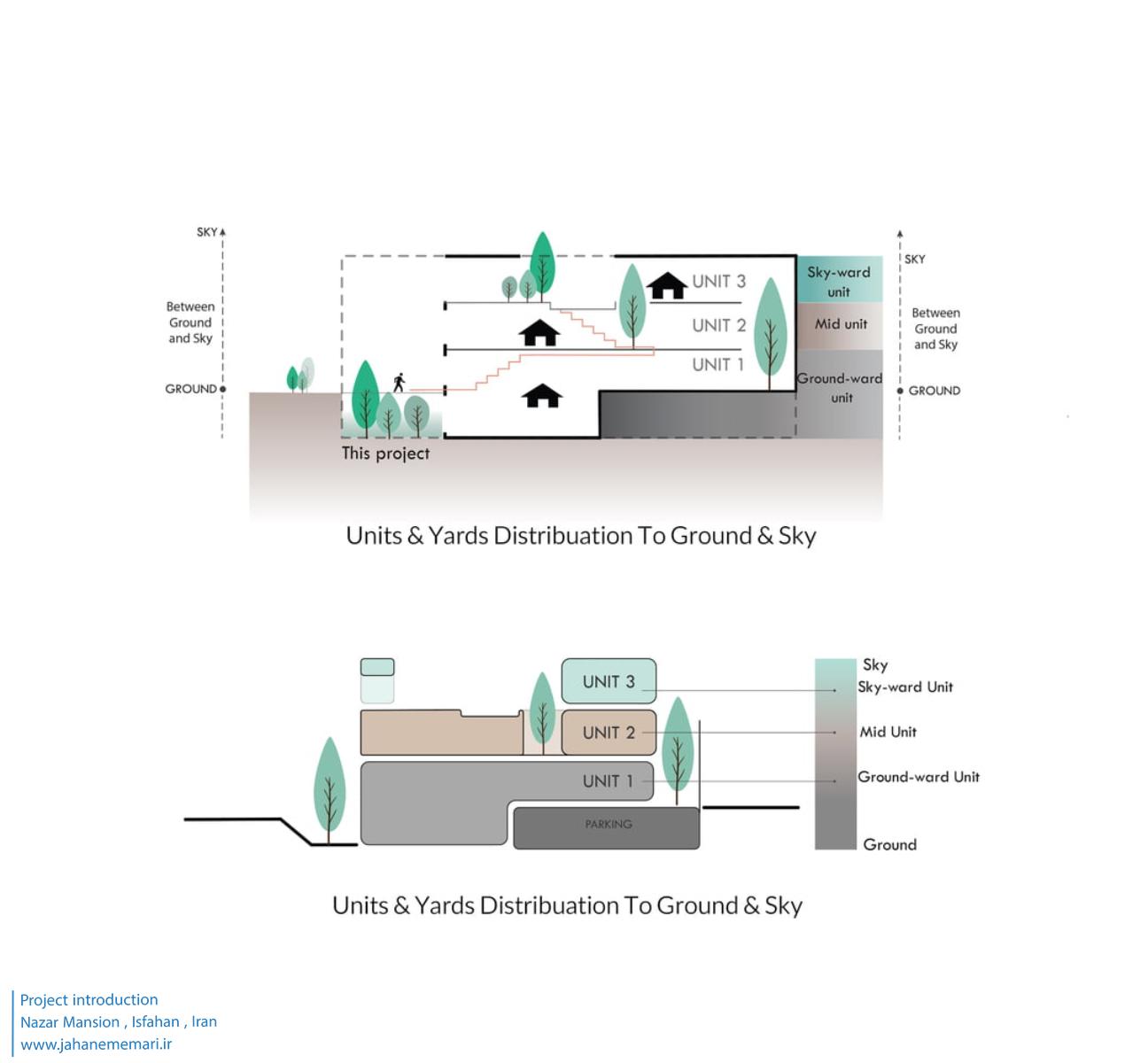 در چهار طبقه مورد اشاره، مجموعاً ۳ واحد مسکونی طراحی شده است. این سه واحد بر اساس نسبتی که با زمین و آسمان دارند، کیفیتی متفاوت یافتهاند. از جمله آنکه واحد اول که شامل همکف و بخشی از طبقه زیرزمین است (بخش دیگر زیرزمین به پارکینگ و تأسیسات و انباری ها اختصاص یافته است.) با زمین پیوند یافته و در کنار گودال باغچه ای در جنوب و حیاط خلوتی در شمال قرار گرفتهاست. در مقابل، بالاترین واحد (واحد سوم) پیوندی با آسمان یافتهاست و دارای بام سبز و دیدی به آسمان است. واحد میانی هم ویژگیهای خاص خود را با حیاطی اختصاصی در میانهاش یافتهاست.