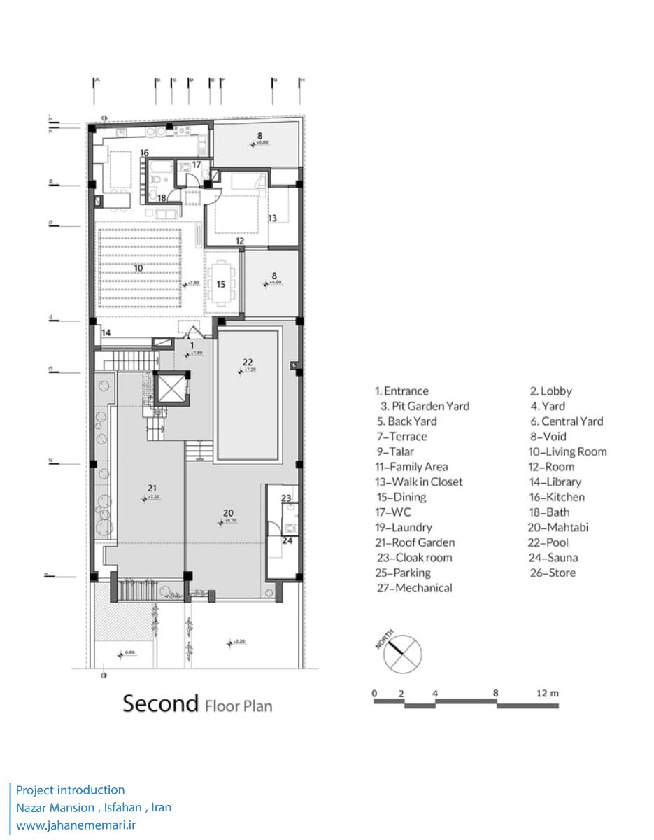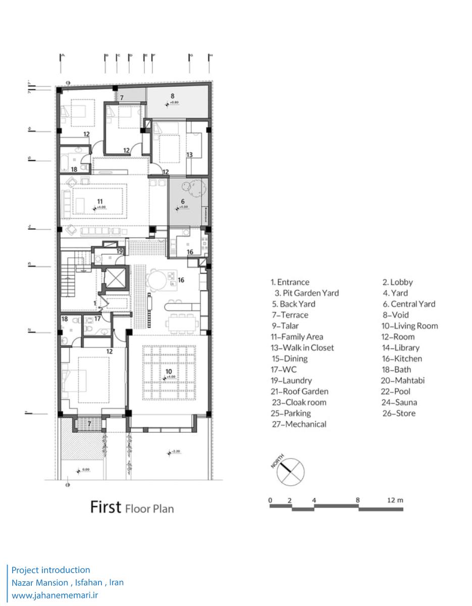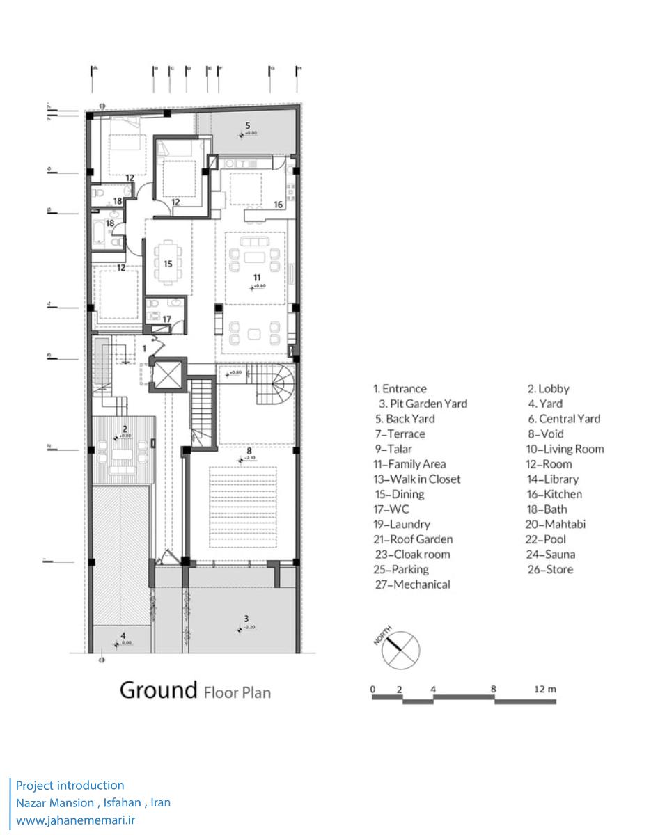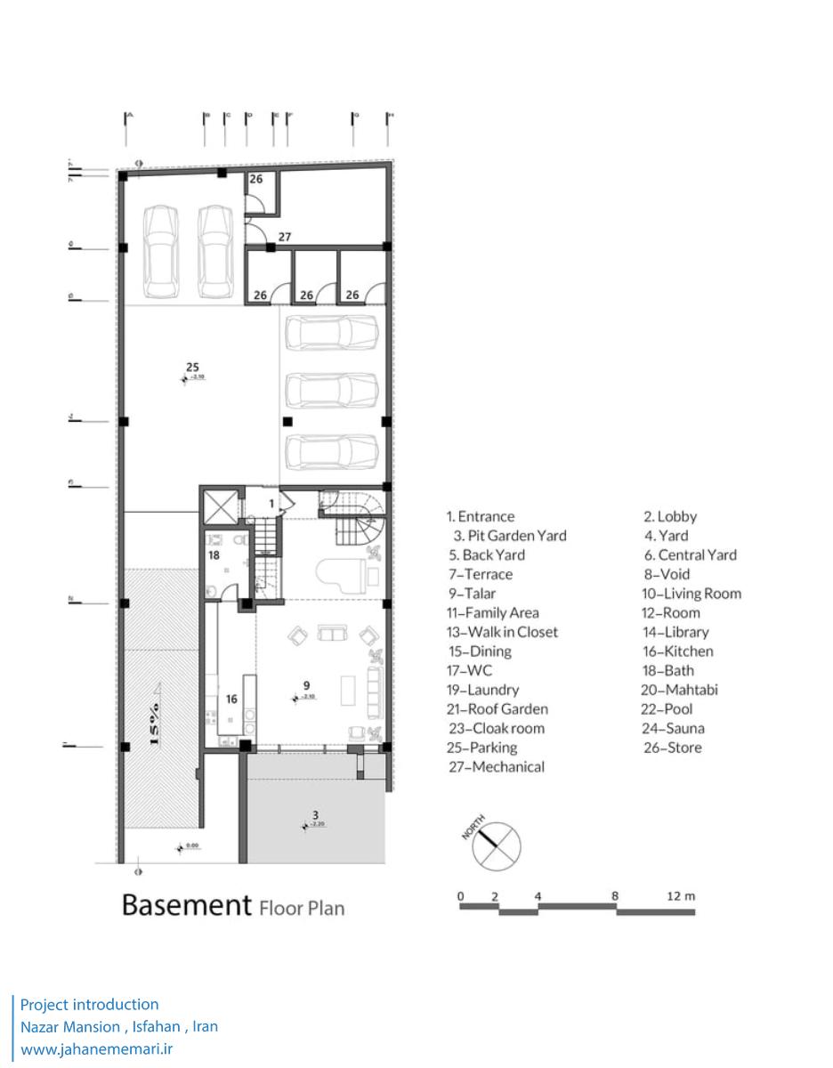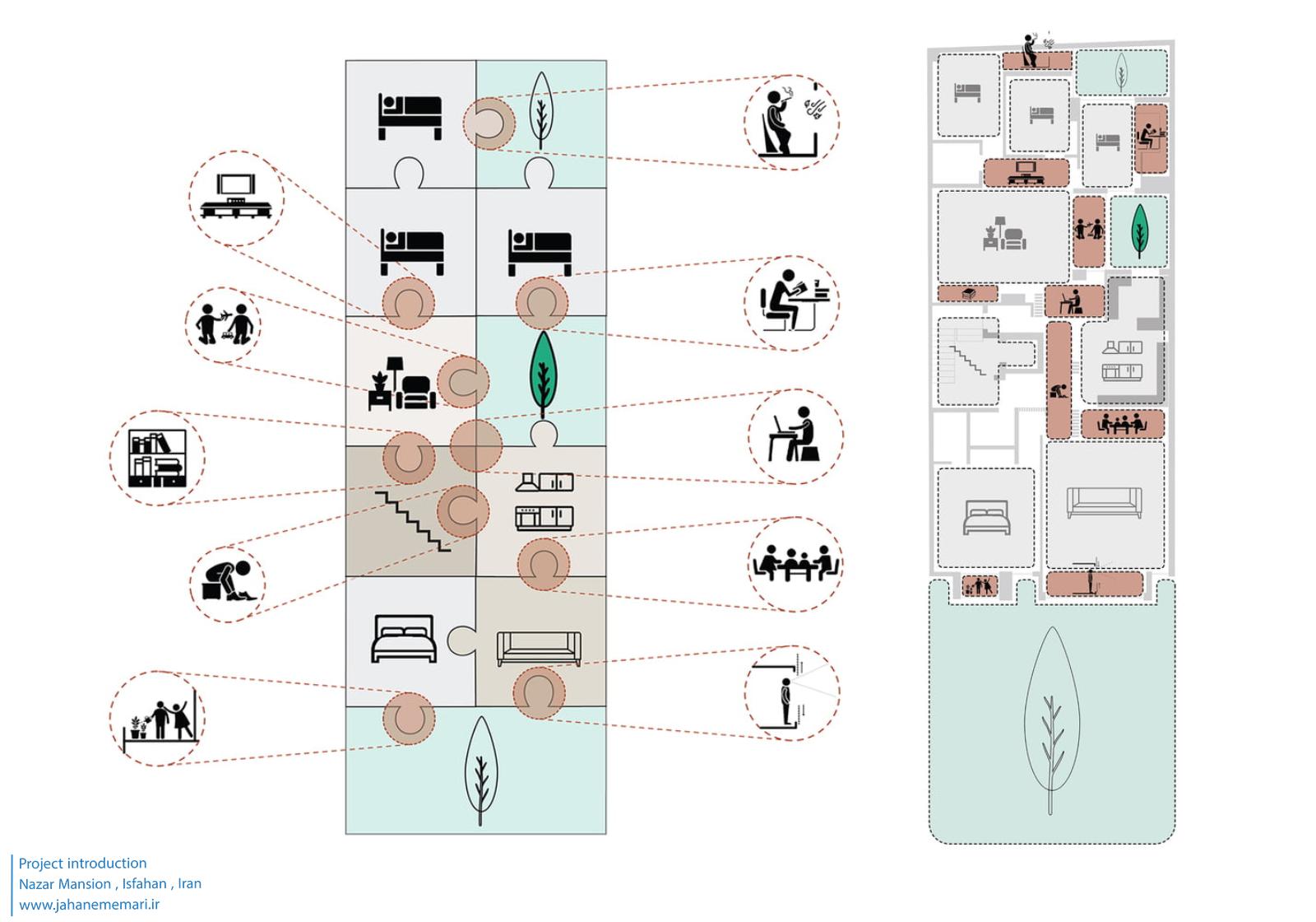در چهار طبقه مورد اشاره، مجموعاً ۳ واحد مسکونی طراحی شده است. این سه واحد بر اساس نسبتی که با زمین و آسمان دارند، کیفیتی متفاوت یافتهاند. از جمله آنکه واحد اول که شامل همکف و بخشی از طبقه زیرزمین است (بخش دیگر زیرزمین به پارکینگ و تأسیسات و انباری ها اختصاص یافته است.) با زمین پیوند یافته و در کنار گودال باغچه ای در جنوب و حیاط خلوتی در شمال قرار گرفتهاست. در مقابل، بالاترین واحد (واحد سوم) پیوندی با آسمان یافتهاست و دارای بام سبز و دیدی به آسمان است. واحد میانی هم ویژگیهای خاص خود را با حیاطی اختصاصی در میانهاش یافتهاست.