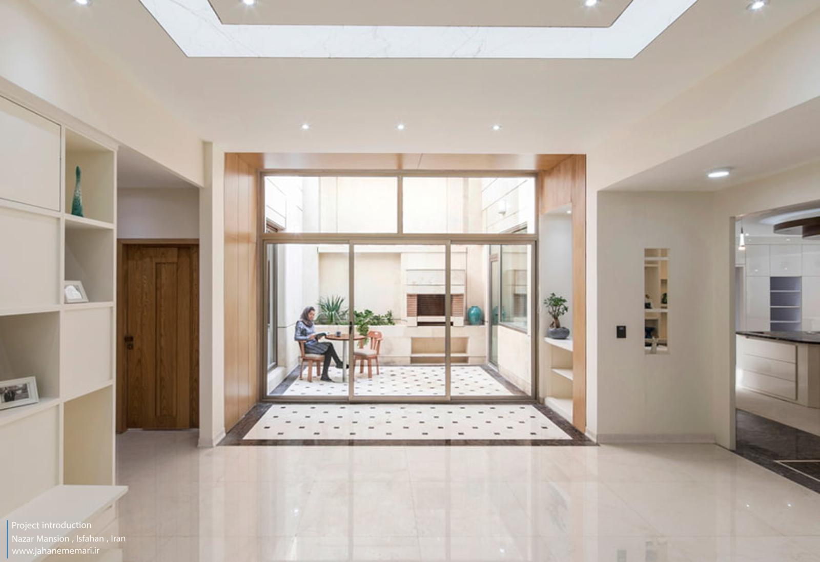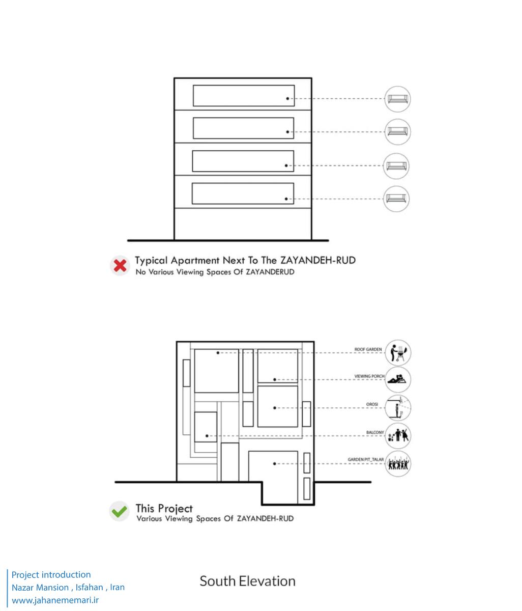 اگرچه جمع شدن فضاهایی از واحد همکف و اول روبه فضاهای باز میانی، موجب آن نیز نشده که منظرهای زیبای محیطی فراموش شود. چنان چه از از ایدههای مهم در طراحی، ایجاد «کیفیتهای نظرگاهی متنوع» از فضاها و طبقات مختلف به منظرهای زیبای محیط است؛ همچون منظرهای تماشایی رواق جنوبی و مهتابی کنار استخر واقع در بام سبز، منظر آرام نیمه غربی بام سبز که تراز پایینتری دارد، منظر محجوب بالکن اتاق اصلی طبقه اول، منظر فاخر پنجرهگاه پذیرایی طبقه اول و در نهایت، منظر باشکوه و در عین حال، دلنشین تالار بلند مشرف به گودال باغچه که منظر درختان بلند حاشیه زایندهرود را از ارتفاع پایین و به نحوی خاص دارد. بر خلاف تیپ غالب آپارتمانهای معمول که معمولاً به دلیل تکرار در طبقات تنها یک نوع فضا و یک نوع کیفیت نظرگاهی را تجربه میکنند.