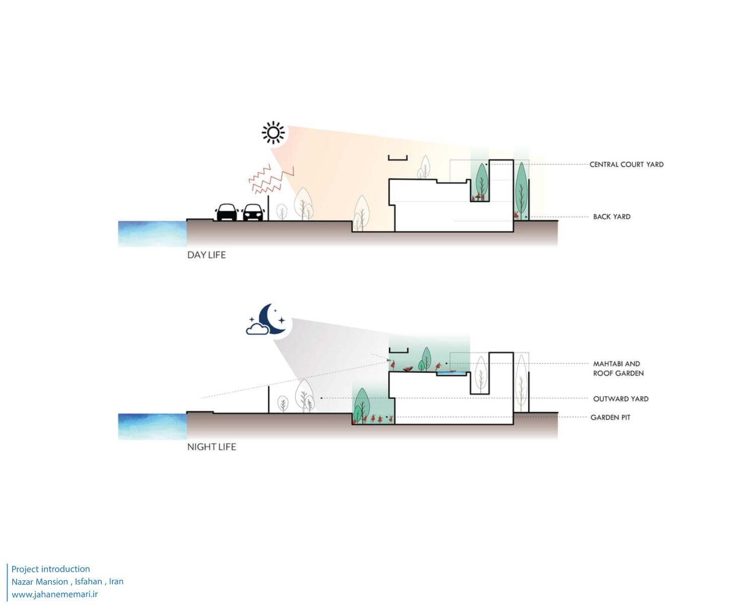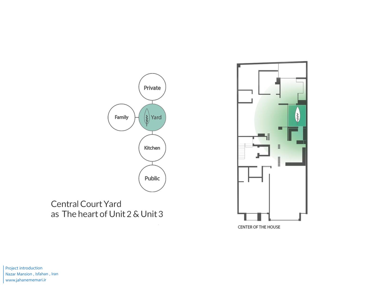 در پاسخ به این مسأله در این پروژه، در عین آنکه فضاها و امکانهای متنوعی برای بهره بردن از منظر رودخانه فراهم شده است، «حیاطهایی در دل بنا» هم ایجاد شده است که میتواند امکان لمس روشنایی و هوای آزاد بدون آلودگی صوتی را فراهم کند. در طول روز، حیاط پشتی که از منظر درختان کاج بلند همسایه بهره میبرد و حیاط میانی که ارتباط زندهای میان نشیمن خانواده، اتاق و آشپزخانه فراهم میکند و پیوندی قابل کنترل هم میان واحد میانی و واحد فوقانی (واحد ۲ و ۳) برقرار میکند، جایگزین خوبی برای فضاهای باز و نیمه باز رو به رودخانه است. در طراحی این حیاط تناسبات جدارههای آن به گونه ای کنترل شده که به صورت وید یا نورگیرهای معمول در نیاید و کیفیتی حیاطگونه (Central Court Yard) داشته باشد.