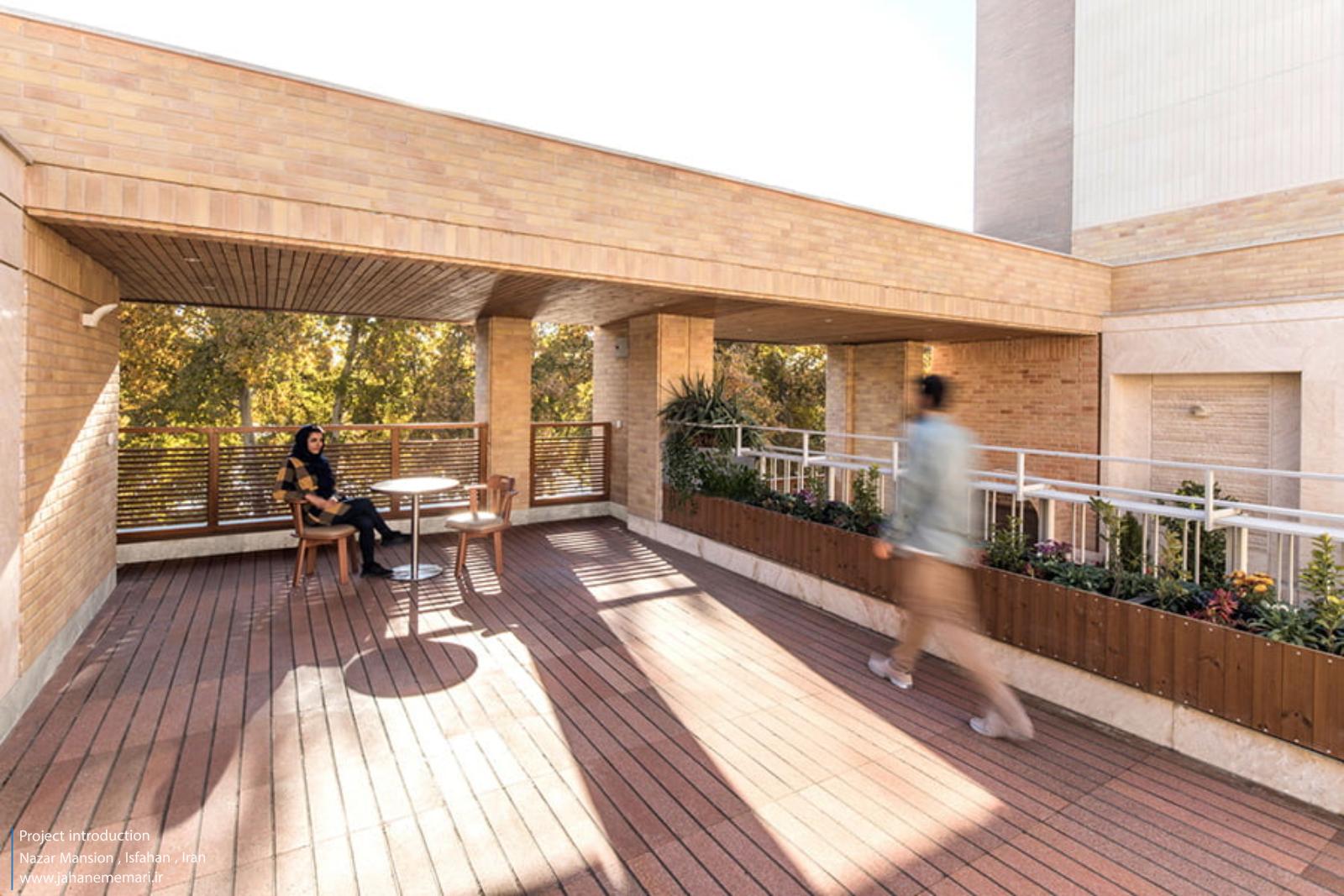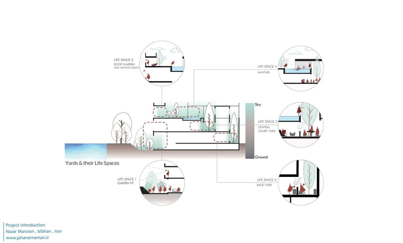 در تناسب با نحوه قرارگیری طبقات در نسبت با زمین و آسمان، در ترازهای مختلف «حیاط ها و فضاهای باز و نیمه بازی» قرار گرفتهاست که از یک طرف متناسب با فضاهای پیرامونشان فضاهای برای زندگی (مکان-رفتار) را شکل دادهاند و از طرفی نسبتی با موقعیت و شرایط سایت پروژه دارند. از جمله آنکه در این پروژه با وجود دید و منظر بسیار مناسب به رودخانه زایندهرود و فضاهای سبز پیرامون آن، آلودگی صوتی قابل ملاحظهای هم در طول روز وجود دارد. از این رو تراسها و پنجرههایی که سایر آپارتمانهای موجود کنار زایندهرود تنها بهرهشان از هوای آزاد را منوط به آن دانستهاند، به دلیل آلودگی صوتی آن، در همه ساعات قابل استفاده و کیفیتبخش نیستند.