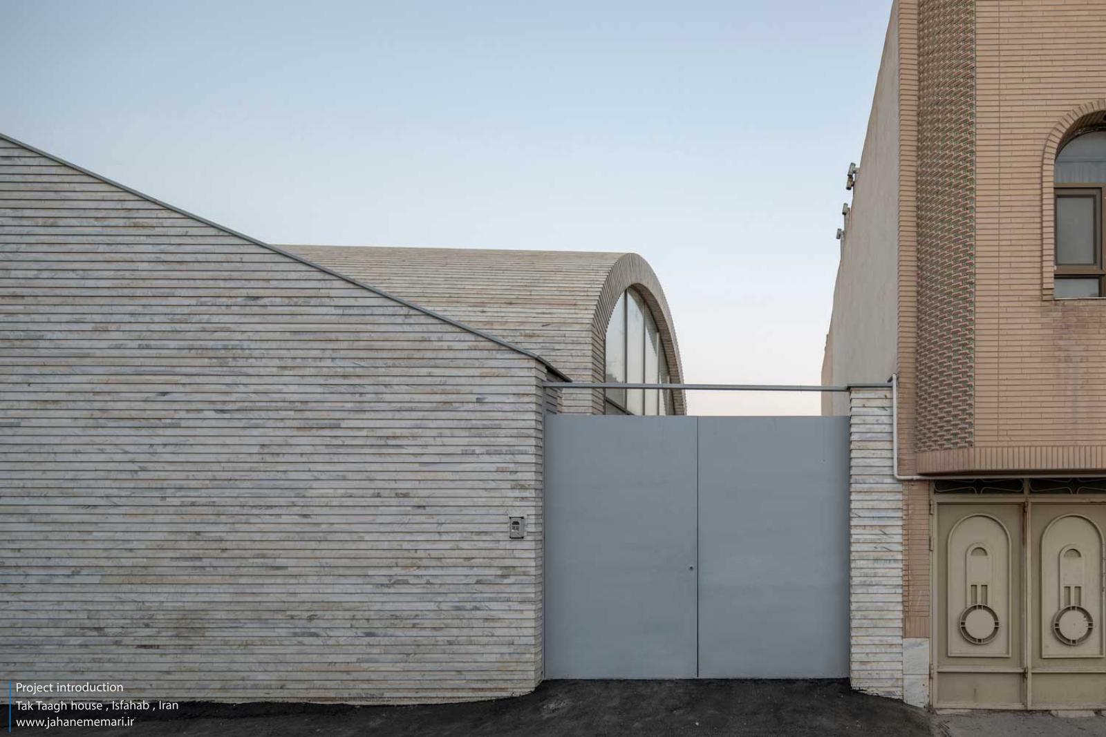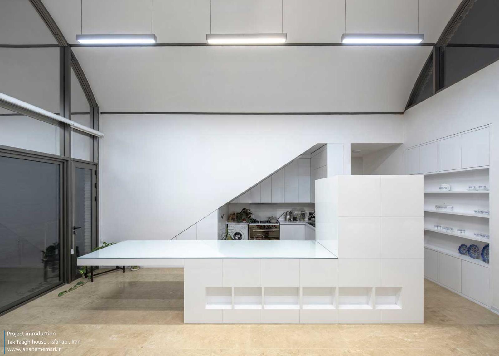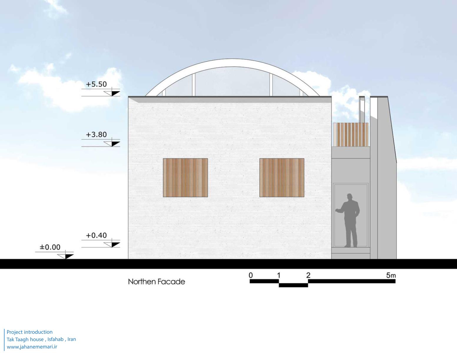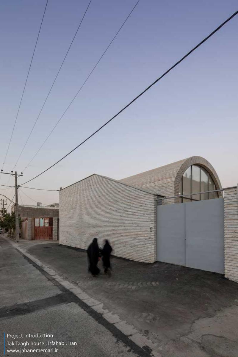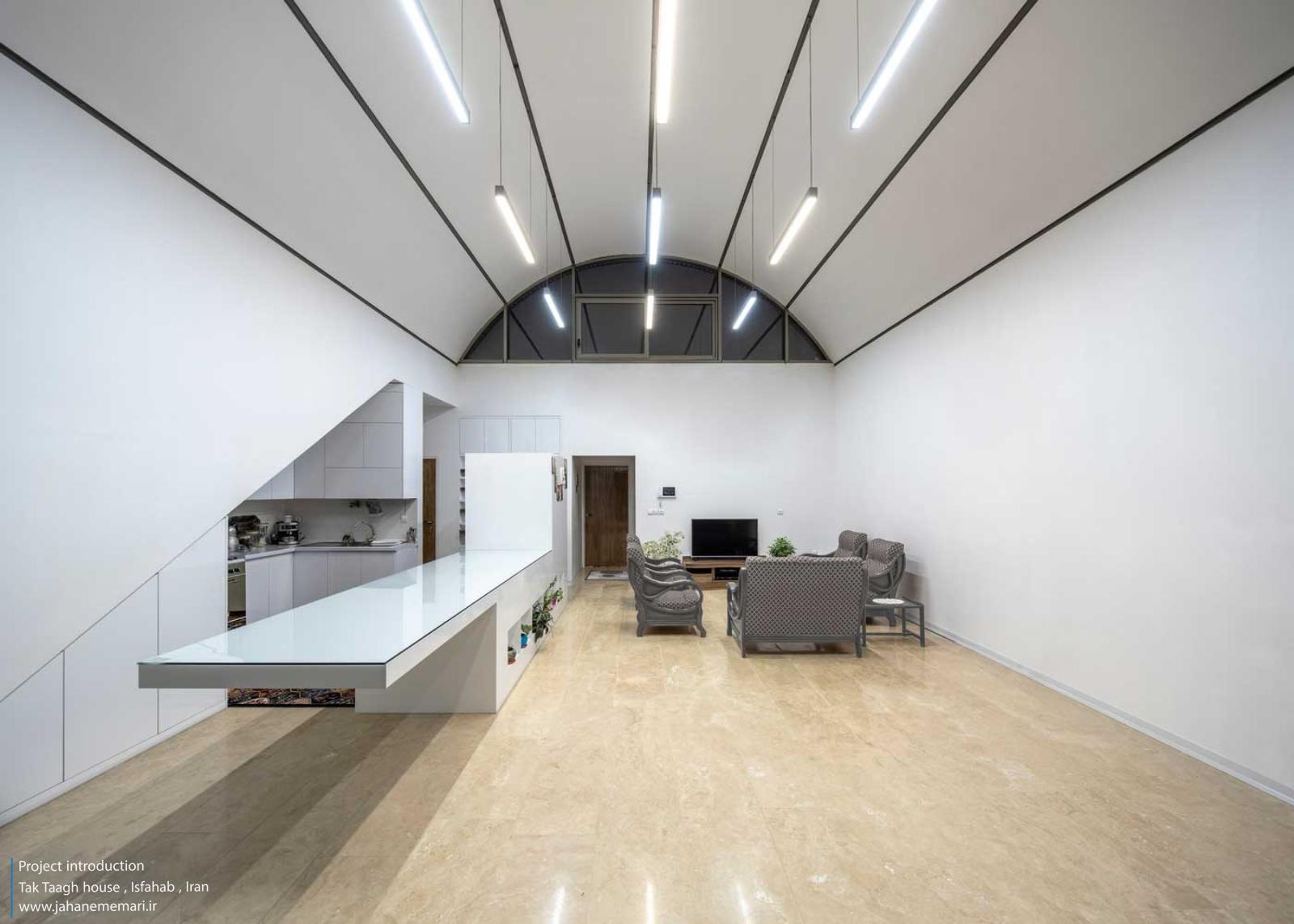 در خانۀ تكطاق، كوچك بودن ابعاد زمين و تقاضاى كارفرما براى ارزان ساختن در يك طبقه، چالشى بود كه طراح را به مدد گرفتن از الگوي تاريخى طاق چشمه واداشت. با توجه به توافق كارفرما با شهردارى و فضاهاي مورد نظر او، حدود هشتاد درصد از زمين به ساخت اختصاص يافت. پلان خانه ساده است؛ نشيمن و پذيرايي در سمت جنوب، آشپزخانۀ نوارىِ باريكى در غرب، همه در زير يك طاق. همچنين دو اتاق خواب در سمت شمال با ارتفاع كمتر، با حياطكى بر بام آن.