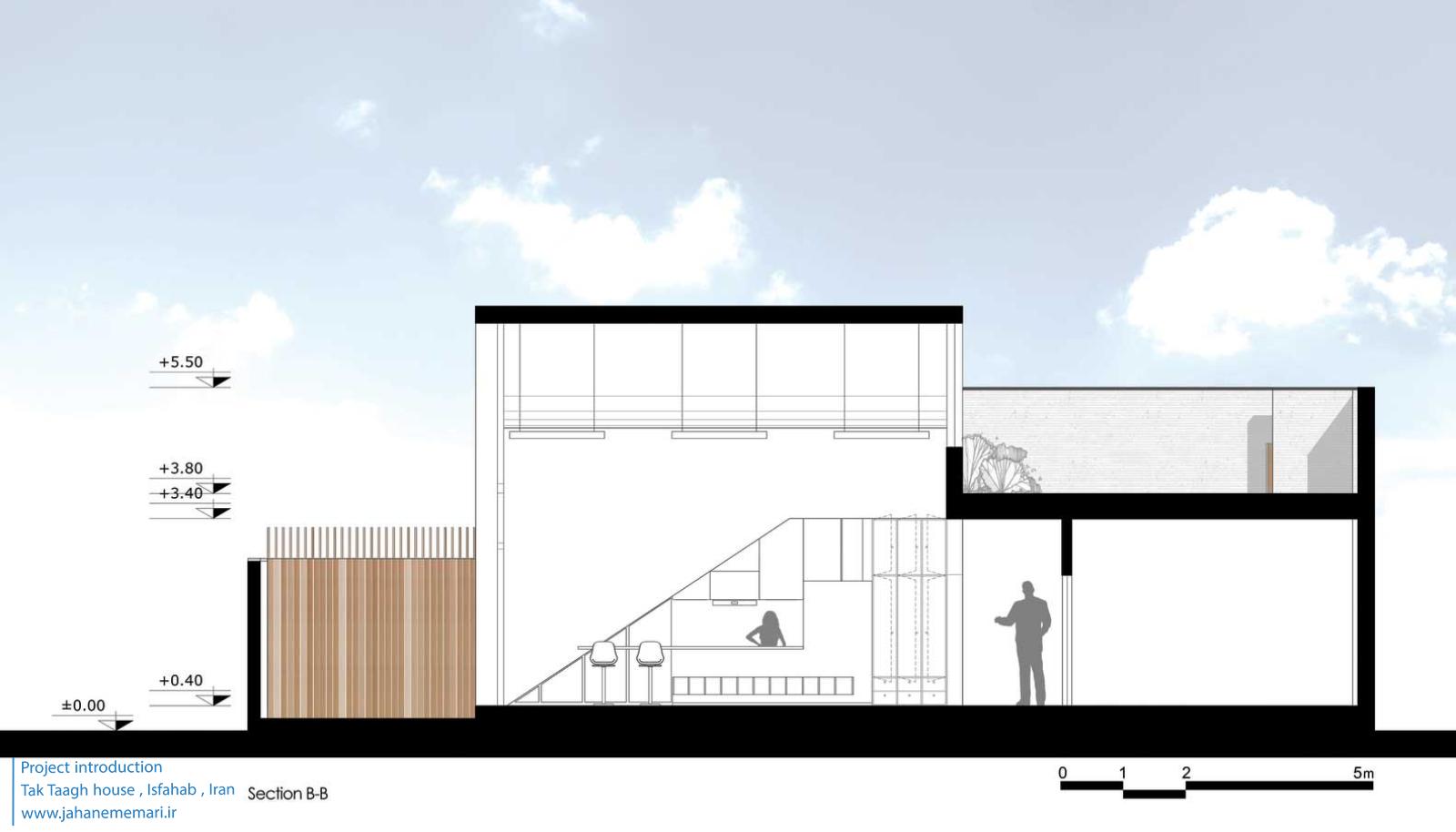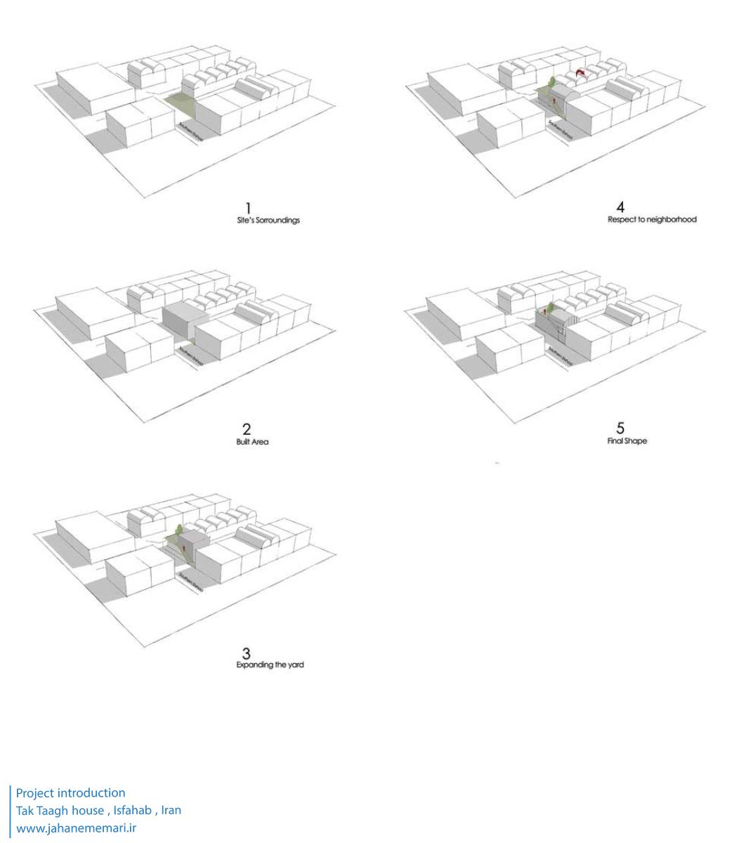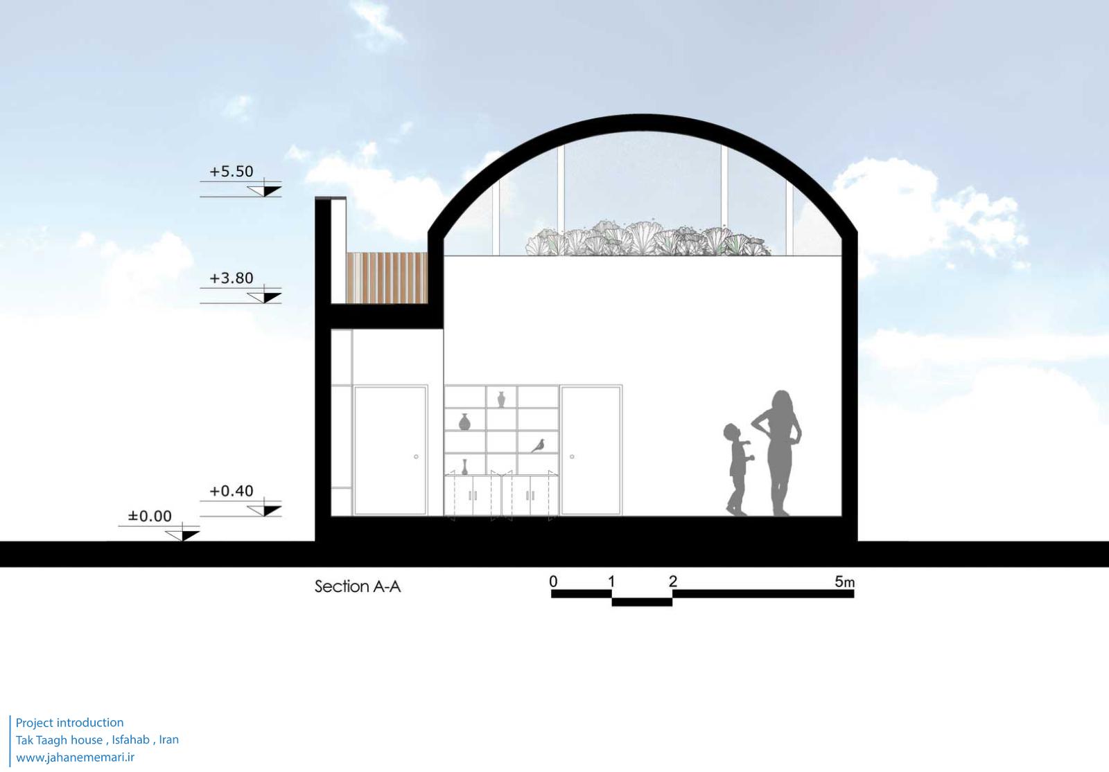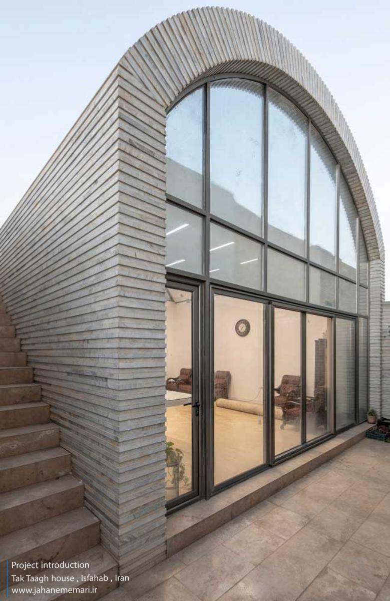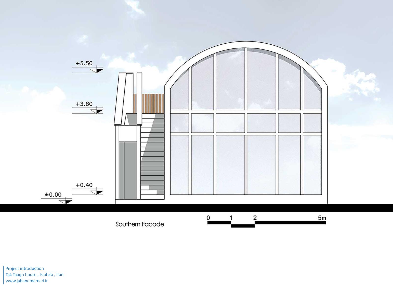 در خانۀ تكطاق، كوچك بودن ابعاد زمين و تقاضاى كارفرما براى ارزان ساختن در يك طبقه، چالشى بود كه طراح را به مدد گرفتن از الگوي تاريخى طاق چشمه واداشت. با توجه به توافق كارفرما با شهردارى و فضاهاي مورد نظر او، حدود هشتاد درصد از زمين به ساخت اختصاص يافت. پلان خانه ساده است؛ نشيمن و پذيرايي در سمت جنوب، آشپزخانۀ نوارىِ باريكى در غرب، همه در زير يك طاق. همچنين دو اتاق خواب در سمت شمال با ارتفاع كمتر، با حياطكى بر بام آن.