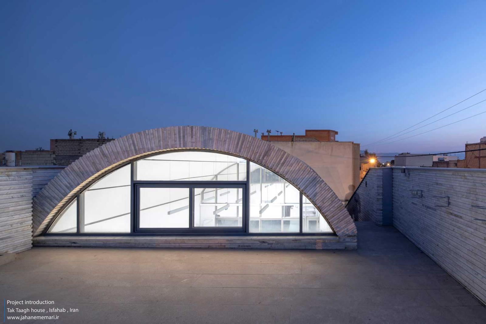 طاق اصلى تا جايي ارتفاع گرفته كه فضاى داخلى، از سمت شمال به حياط بالا (روى بام بخش خصوصى خانه) هم ديد داشته باشد. اين حياط و پلۀ دسترسى به آن، بهواسطۀ ديوارِ مجاورِ معبرِ غربى كه قناسى زمين خانه نيز در پسِ آن حل شده، از ديد رهگذران محفوظ مانده است.