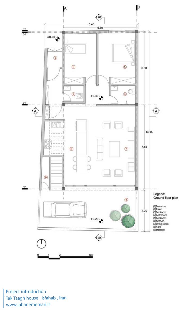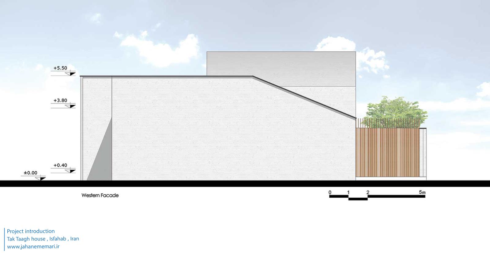 از آنجا كه زمين باقيمانده براى حياط جنوبى بسيار كوچك و ساختْ يك طبقه است، بخشى از بام بهعنوان فضايي زنده در امتداد حياط، در شمال زمين، نقش بازى مىكند. پلهاى در غرب ساخت و مجاور معبر، براى دسترسي به بامِ اتاقها قرار دارد. ازآنجاكه لازم بوده گوشۀ شمال غربىِ ساخت به خاطر قرارگيرى در نبش كوچه، پَخ بخورد، با عقبنشينى در آن نقطه ورودى خانه ايجاد شده است. بهاينترتيب ورودى از فاصلۀ بين بخش خصوصى و عمومى به خانه وارد مىشود.