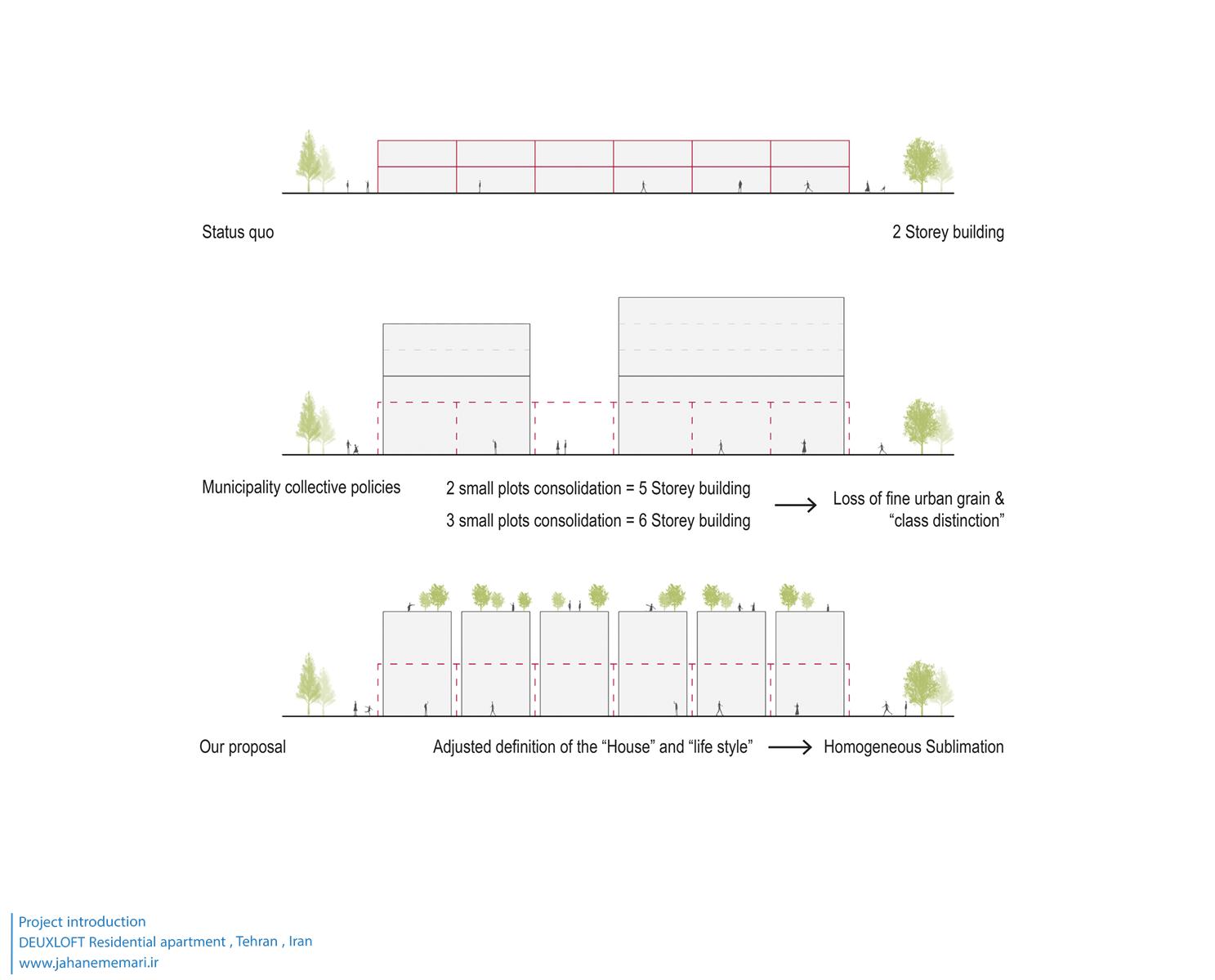 هدف ما برای ارتقای زندگی شهروندان از طریق حرفه معماری، همراه با مسئولیت پذیری اجتماعی، تاکید بر قدرت ناشی از فروتنی و پرورش گفت و گو بین ضرورت و سرمایه گذاری، دفتر ما را بر آن داشت تا در ۱۵ سال گذشته سه پروژه را دنبال کند که به شکل ویژه طبقه متوسط را هدف قرار می دهد. اولین پروژه (دولت ۱) در مسابقه معتبر معمار موفق به کسب مقام اول شد. پروژه دولت ۲، علاوه بر برنده شدن در مسابقه معمار، به فهرست نهایی مسابقه آقاخان راه یافت. پروژه دولت 3 اخیرا در فهرست نهایی مسابقه WAF قرار گرفته است. هر سه پروژه در تضاد با سیاست های رسمی غالب هستند که از طریق ارائه امتیاز تشویقی برای تجمیع قطعات کوچک زمین، ساخت مجتمع های مسکونی بزرگ را ترویج می کنند. بی شک، از میان رفتن بافت ریزدانه شهری، بر تکثر اجتماعی محلات تاثیر گذاشته و به بحران های اجتماعی و اقتصادی دامن می زند.