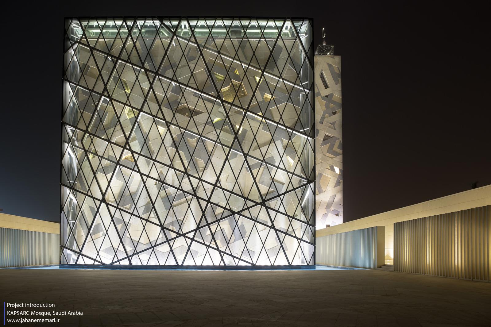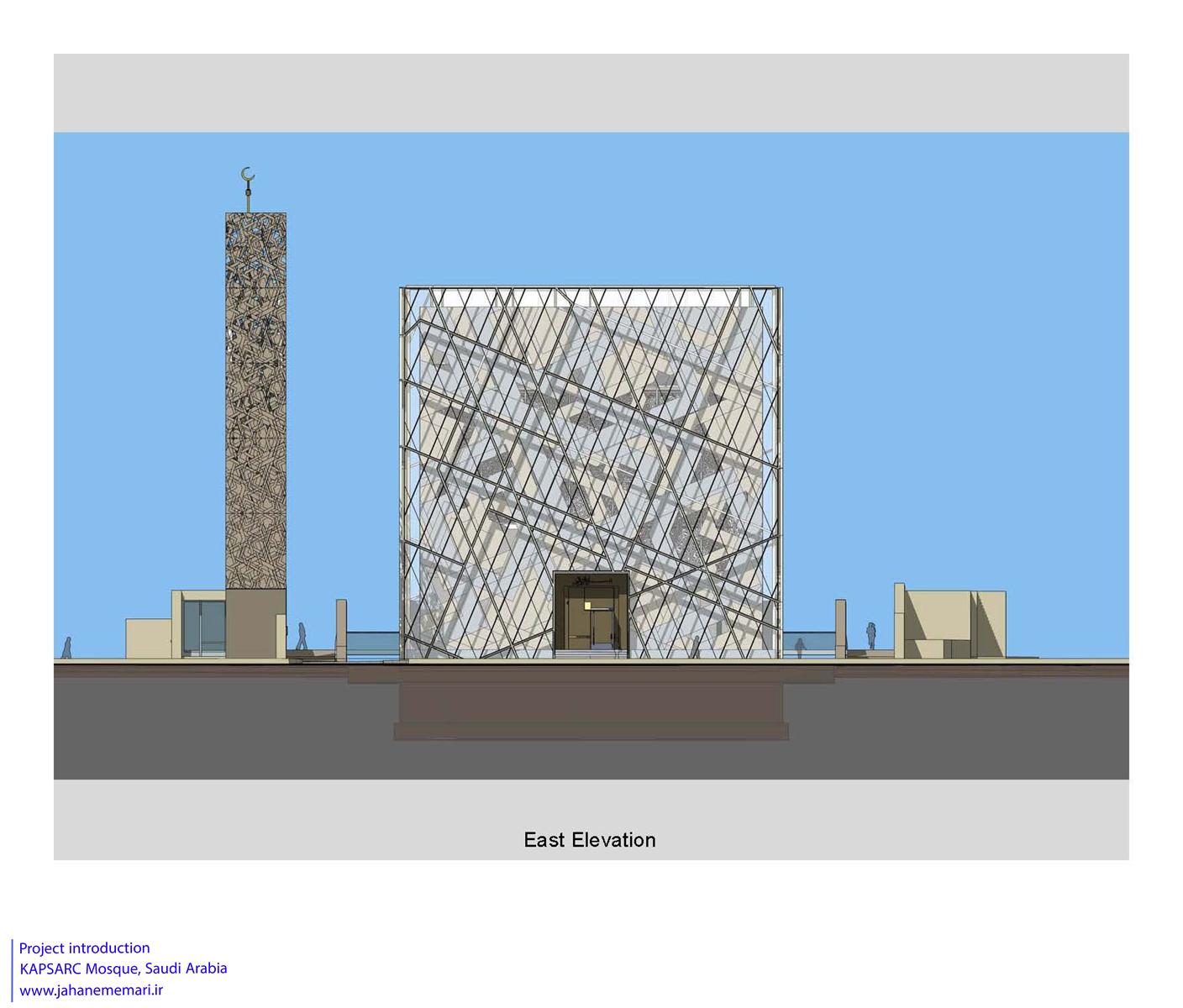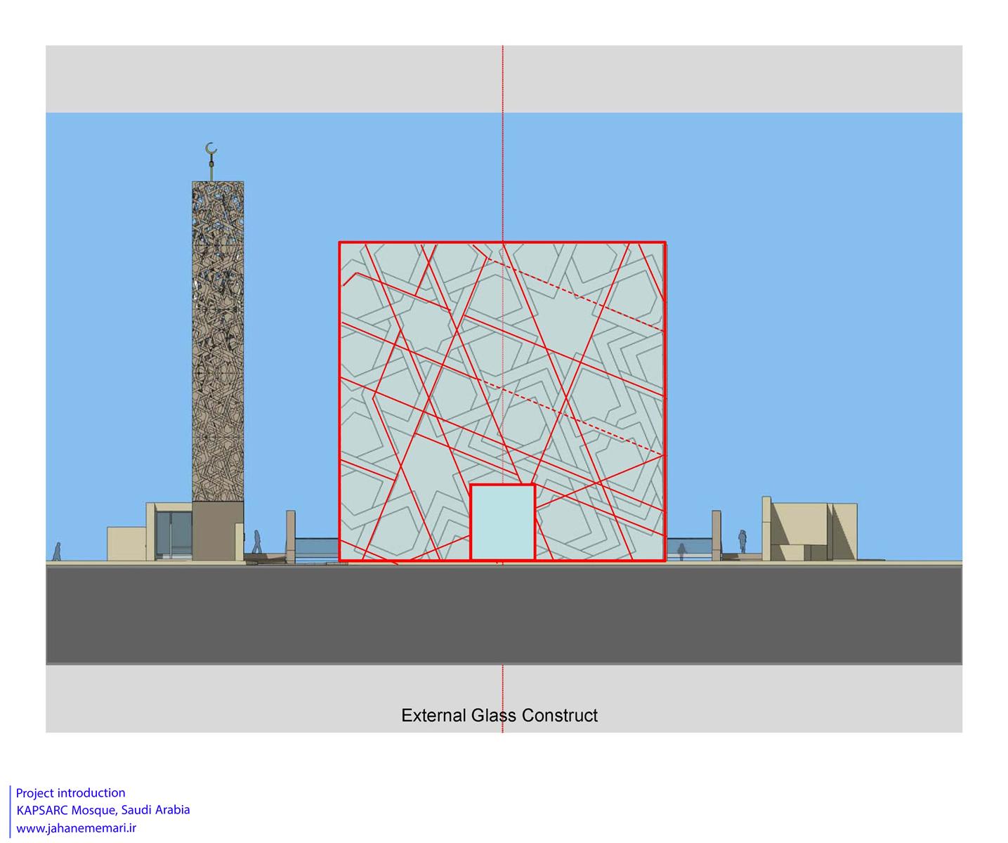 سالن اصلی نماز بهصورت یک مکعب ۷۵ فوتی طراحی شده که با پوستهای دینامیک و لایهلایه پوشانده شده است. لایه بیرونی شیشهای از لایه داخلی بتن پوشیدهشده با سنگ، به اندازه سه فوت فاصله دارد. مناره ۱۱۵ فوتی طراحی شده است تا با الگوهای مشابه سنگپوشی و پنجرهها، مسجد را تکمیل کند.