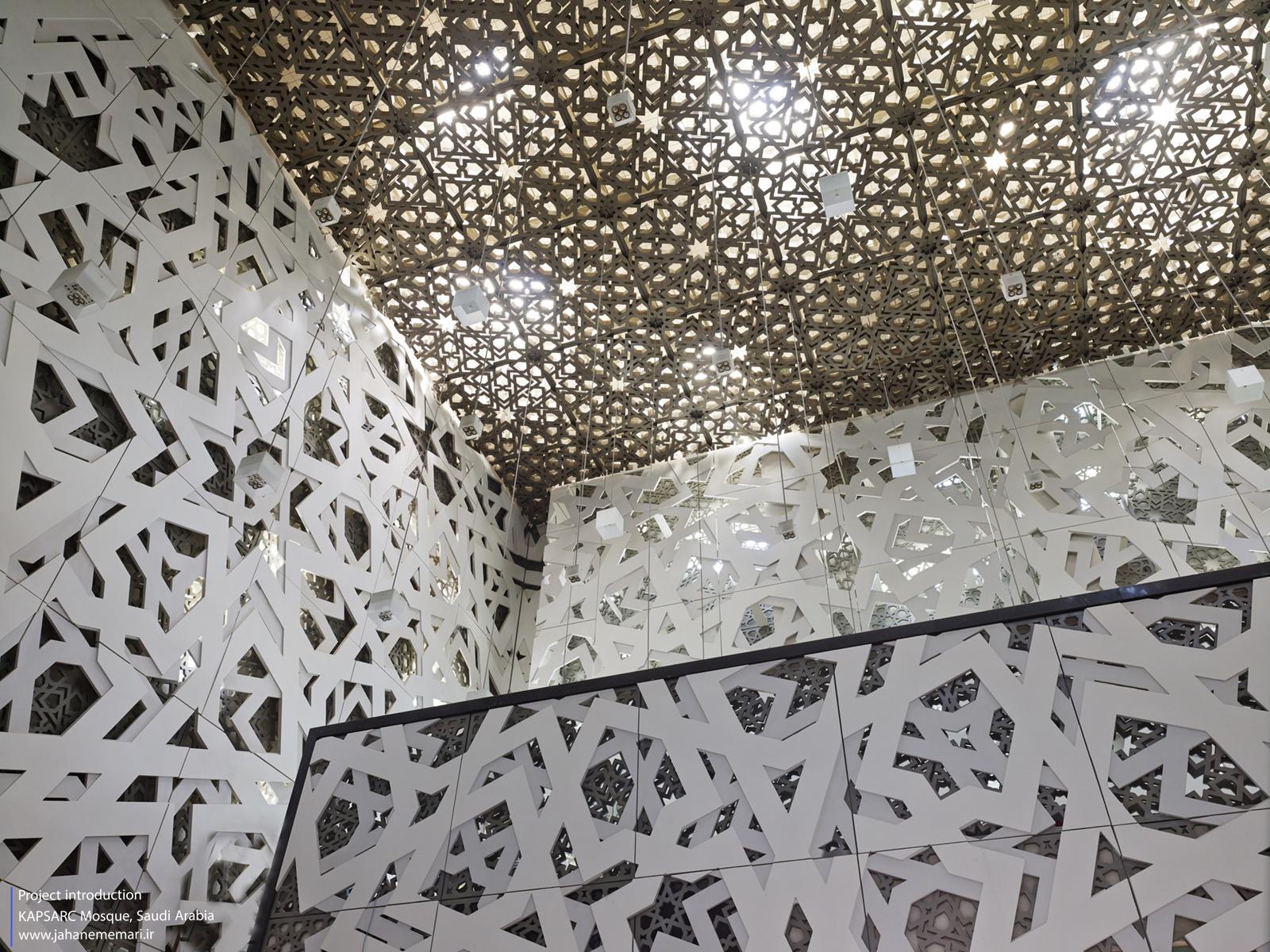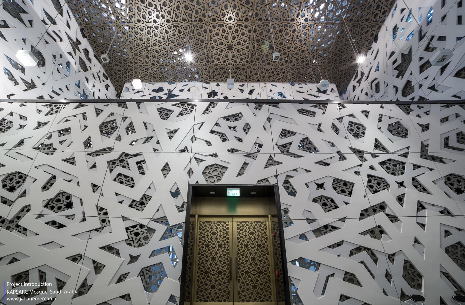سالن اصلی نماز برای ۲۰۰ مرد طراحی شده است، در حالی که یک سطح میانه برای ۱۰۰ زن فراهم شده است. دیوارها و سقف سالن اصلی نماز با یک تفسیر مدرن از دیوار پردهای عربی (مشرابیه) پوشانده شده که با نور طبیعی از پنجرهها و پنجرههای سقفی روشن میشود تا فضای مدرن را روشن کند. اشکال همپوشان دیوارها را زنده میکنند، در حالی که سقف طراحی سنتیتری را به نمایش میگذارد.