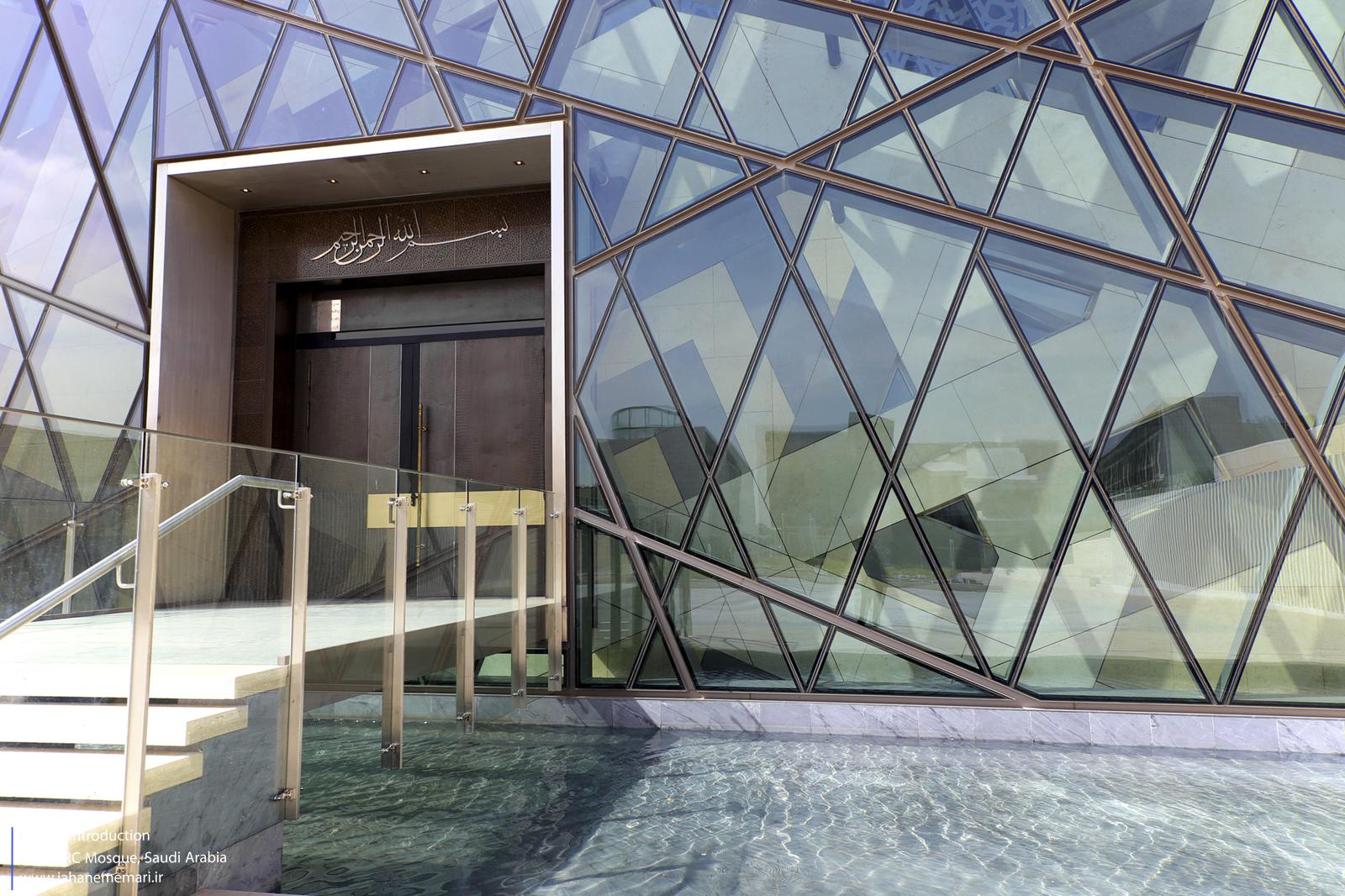 سالن نماز در داخل یک حوض بازتابی قرار دارد و از طریق پلهای شیشهای مرتفع به ورودیهای آن دسترسی پیدا میشود. این حرکت نماد گذار از دنیای مادی به دنیای مقدس است. حوض بازتابی شبها درخشان میشود و تصویری ایجاد میکند که گویی کل ساختمان بر روی آب شناور است. در دو طرف سالن نماز، دیوارهای منحنی وظیفه پنهان کردن فضاهای پشتیبانی از جمله فضای وضو و دفتر امام را به عهده دارند.
