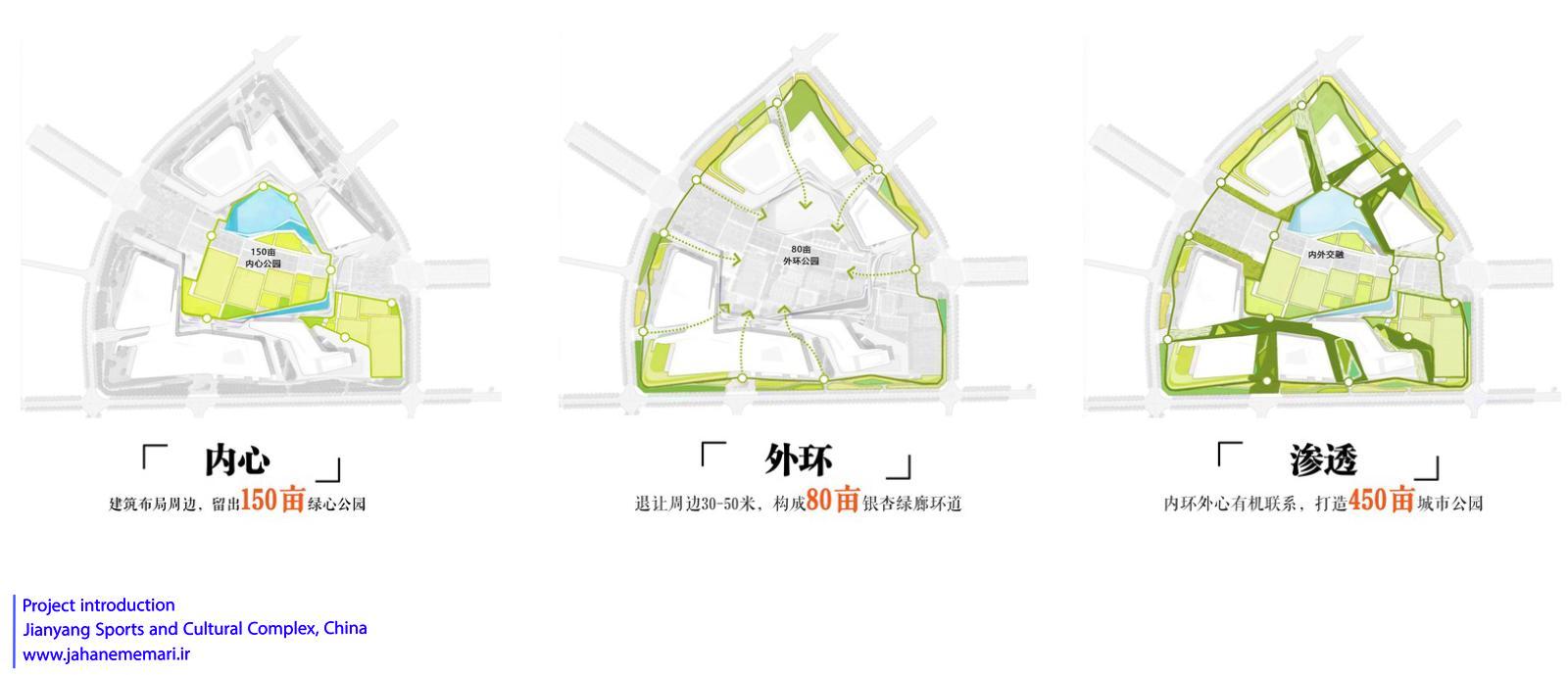 ایدهی اصلی طراحی بر پایهی مفهوم «پارک سهبعدی» استوار است. یک نظام سبزراه چندسطحی در شبکهی سبز شهری جای گرفته و با اتصال به رود تووجیانگ و پارک آئوشان، پیوستاری از مناظر طبیعی ایجاد میکند. ساختار سبز دوحلقهای شامل یک ناحیهی مرکزی سبز به مساحت صد و پنجاه مو و کمربندی منظر به وسعت هشتاد مو است که از طریق محورهای شعاعی در پارک ورزشی مرکزی چهارصد و پنجاه موئی ادغام شده و فضایی باز، پیوسته و اشتراکی برای شهروندان به وجود میآورد.