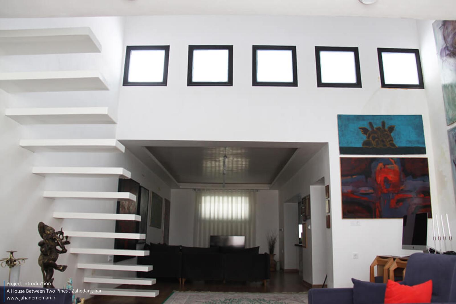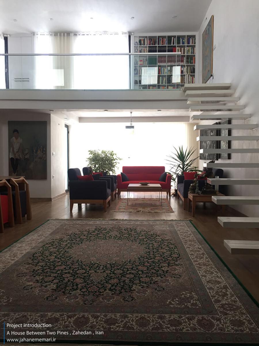 با برداشتن بخشی از سقف خانه در طبقه همکف این امکان فراهم شد تا سالن طبقه اول به سالن طبقه همکف اشراف داشته باشد و به کمک یک پله تعبیه شده در دیوار جانبی، یکپارچگی فضای پذیرایی از دست نرفت.