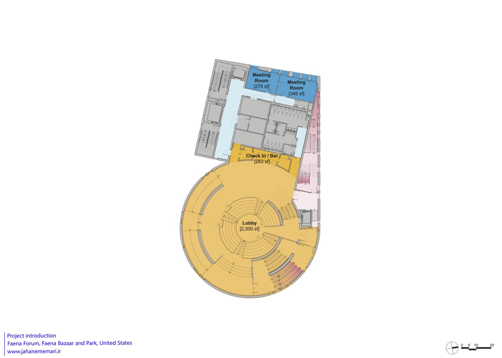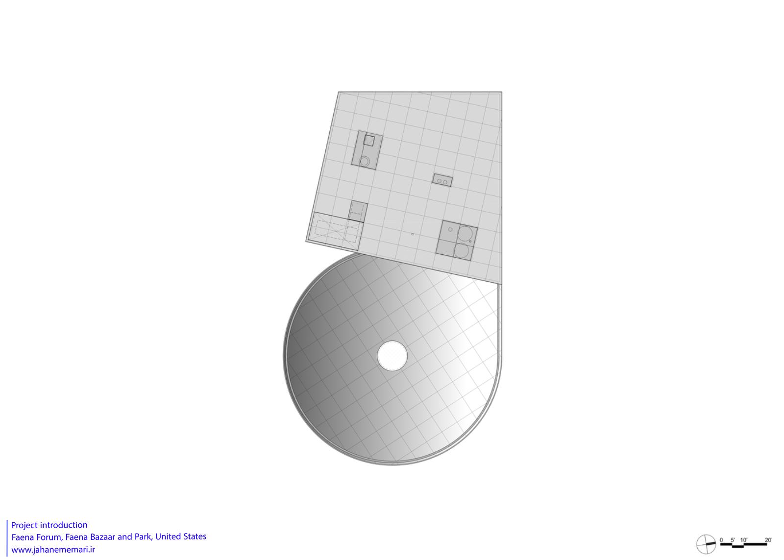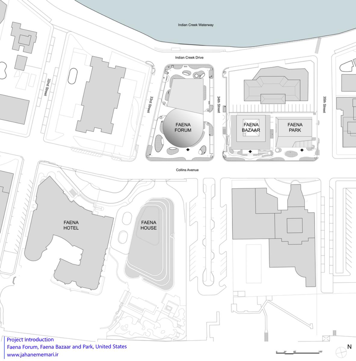 سایت موجود، سه وضعیت کاملاً متمایز برای سه عملکرد متفاوت ارائه میکرد: سایتی بزرگ و گوهایشکل برای فوروم، یک هتل تاریخی و حفاظتشده به سبک آرتدکو برای بازار، و زمینی خالی برای پارکینگ. اگرچه ناحیهی فائنا از موقعیتی منحصربهفرد برخوردار است که میان دو جبههی آبی قرار دارد، اما اجزای فرهنگی آن در بخش آرامتر و مسکونیتر در امتداد ایندین کریک (Indian Creek) جای گرفتهاند، نه در جبههی پرتحرک ساحل اقیانوس اطلس.