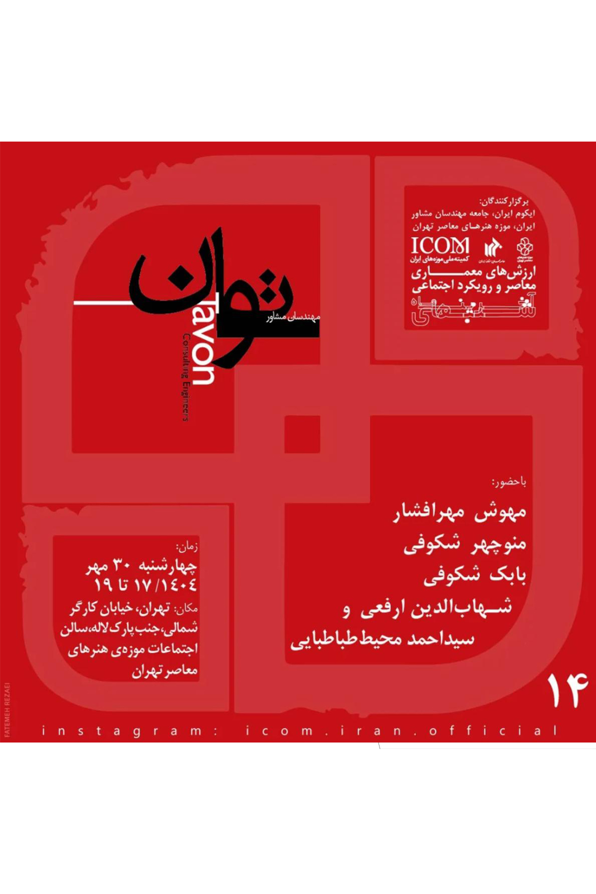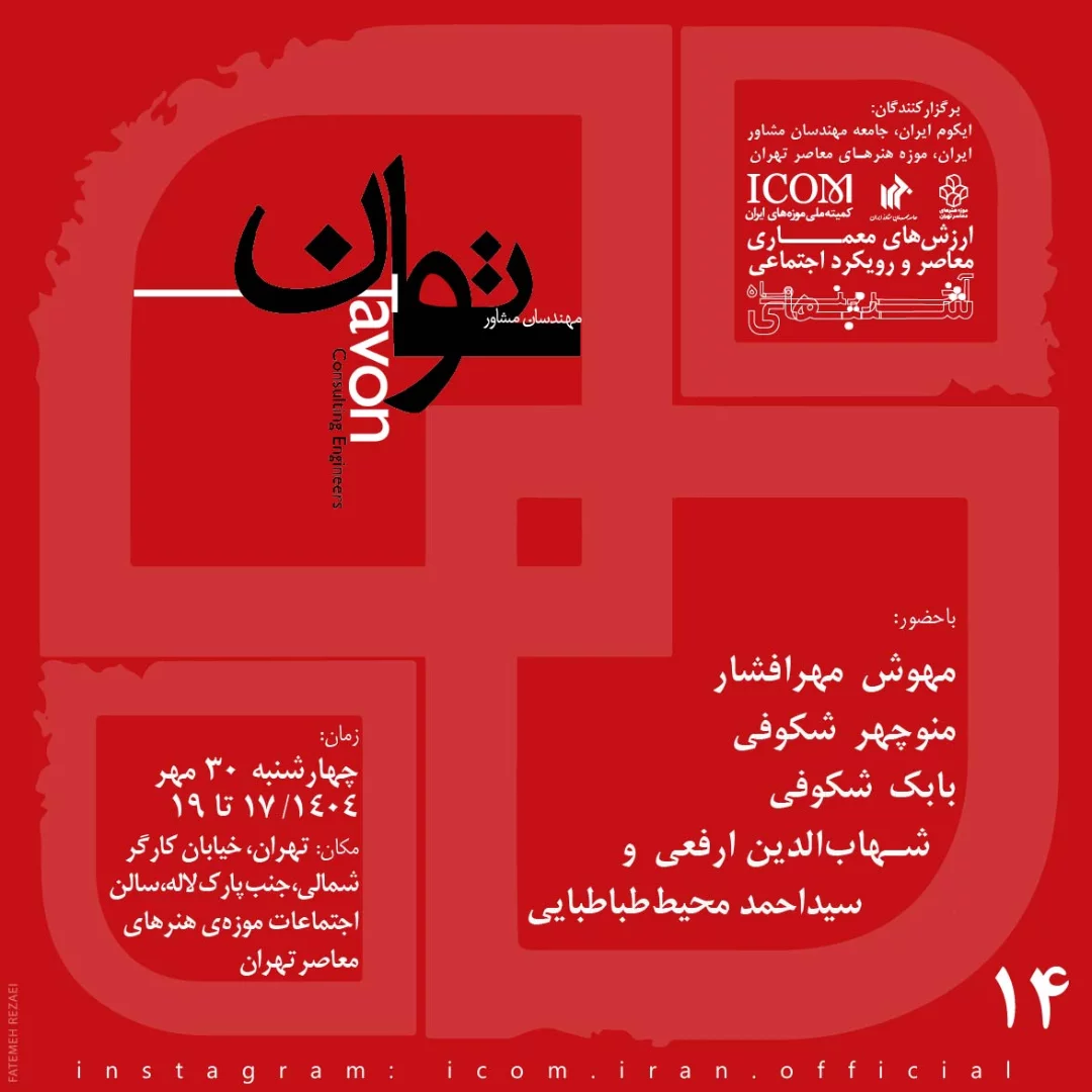 چهاردهمین مراسم از مجموعه نشستهای «ارزشهای معماری معاصر و رویکرد اجتماعی» کمیته ملی موزههای ایران (ایکوم ایران)، با موضوع «مهندسین مشاور توان» روز چهارشنبه ۳۰ مهرماه ۱۴۰۴ در سالن اجتماعات موزه هنرهای معاصر تهران برگزار خواهد شد.