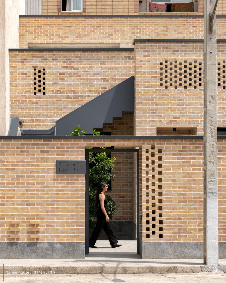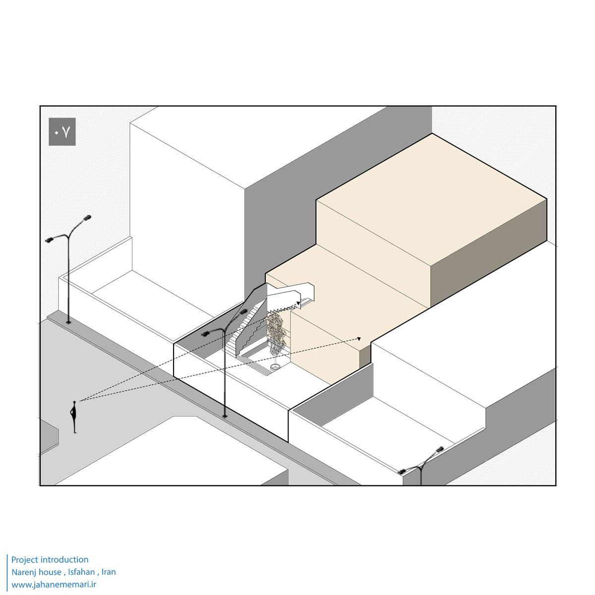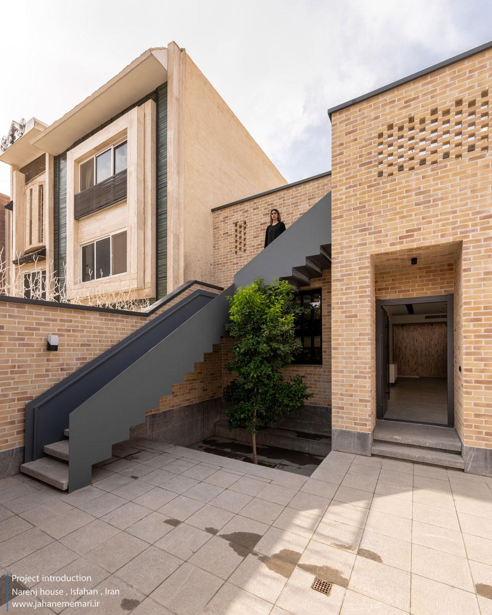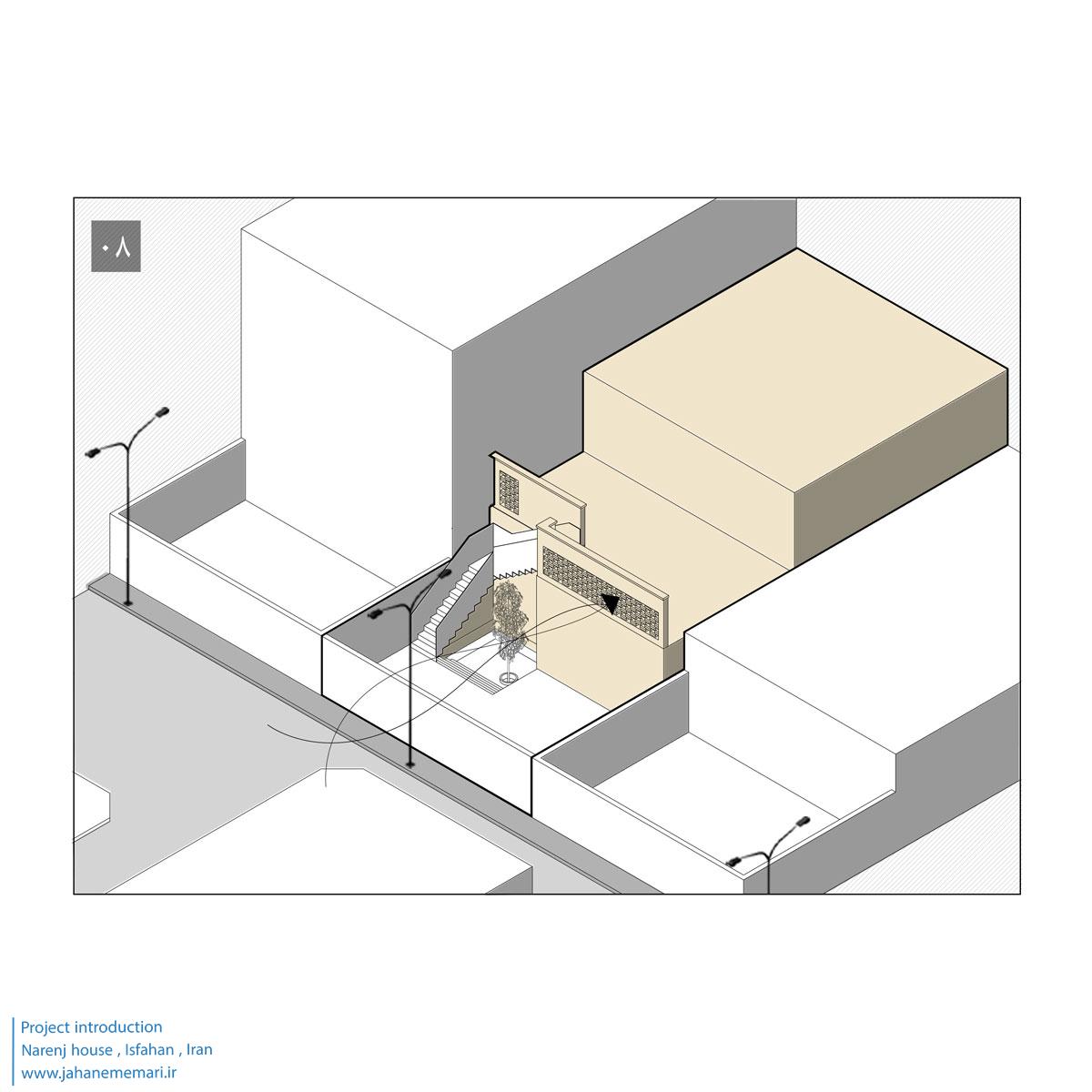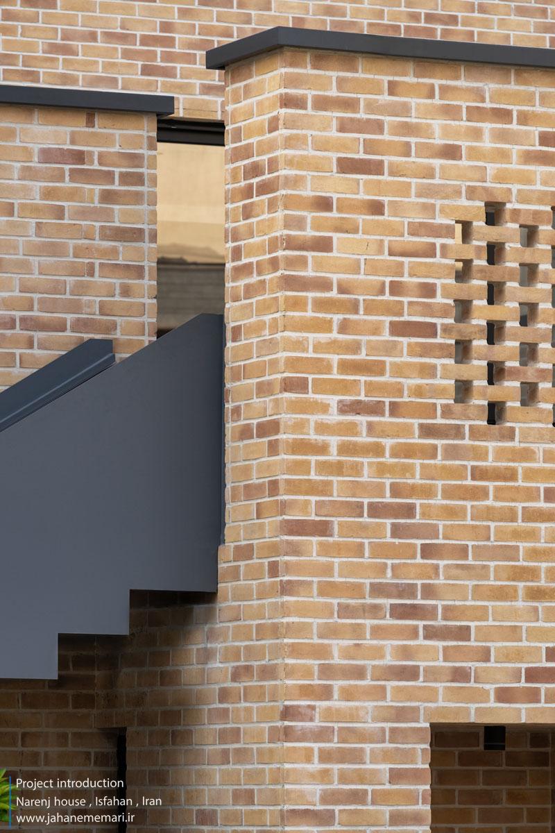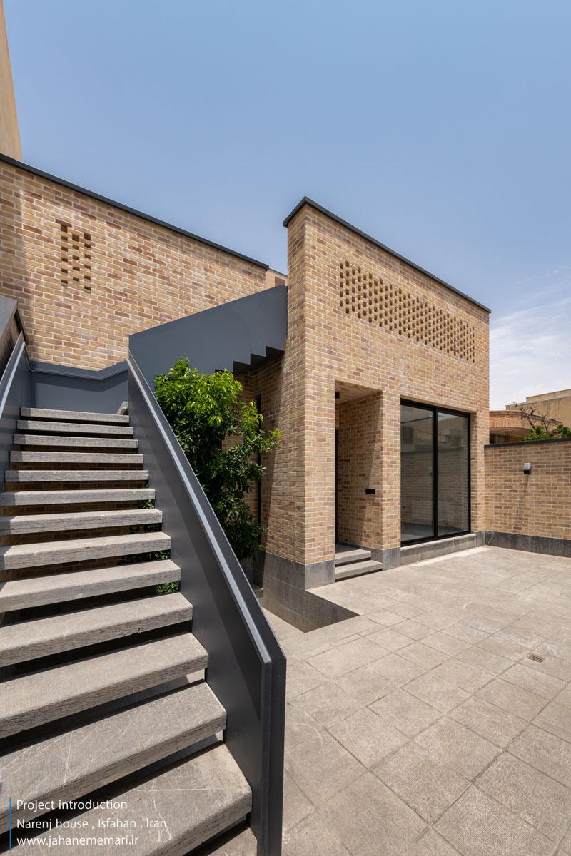 وجود درخت نارنج 10 ساله ای که در موقعیت مناسبی قرار داشت، بسیاری از خطوط فکری حاضر را برای ما ترسیم میکرد. خواست کارفرما خانه ای دلباز و کاربردی به همراه یک سوییت با دسترسی مجزا بود که مزاحمتی برای واحد اصلی نداشته باشد. واحد اصلی در همکف و سوییت در بالا، تعبیه شد. پله ای فلزی، به دور درخت میچرخد و حجم آجری را میشکافد تا به بالا برسد. حیاط بالا، فضایی است برای مهمانی ها و شب نشینی های تابستانه، و حیاط پایین، خلوتگاهی است درون گودال باغچه زیر سایه ی نارنج با عطر بهار و پاییز! در داخل نیز، نشیمنی تماما از آجر طراحی شد برای دورهمی ها در شب های سرد زمستان برای کنار هم بودن!
