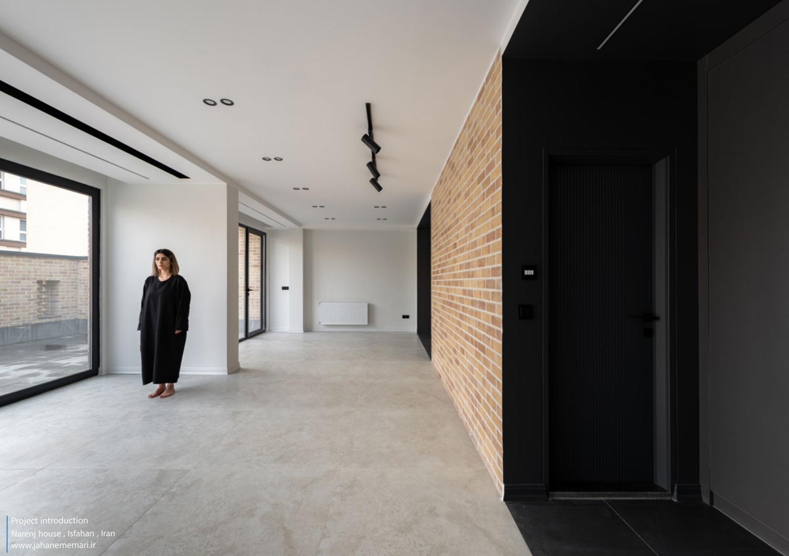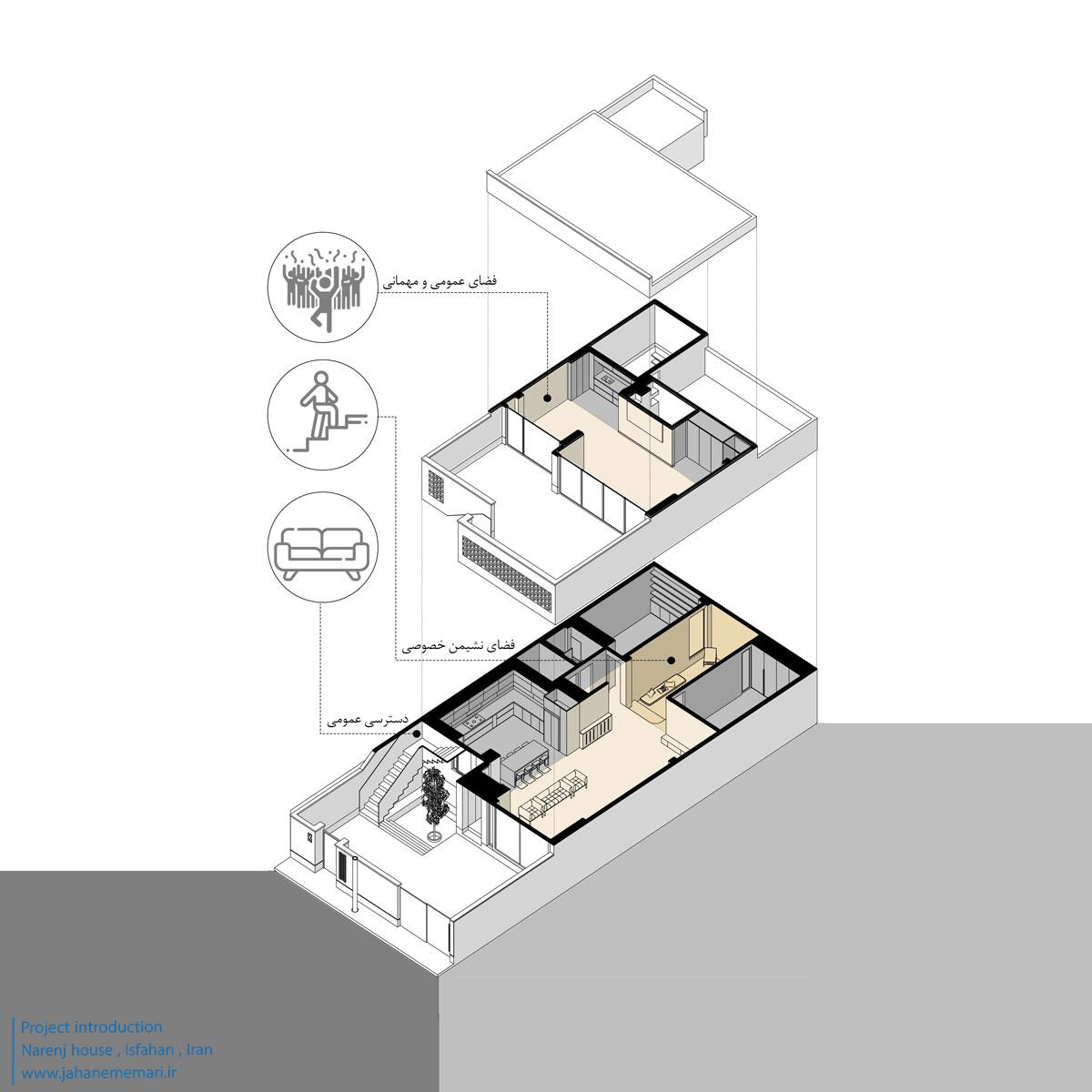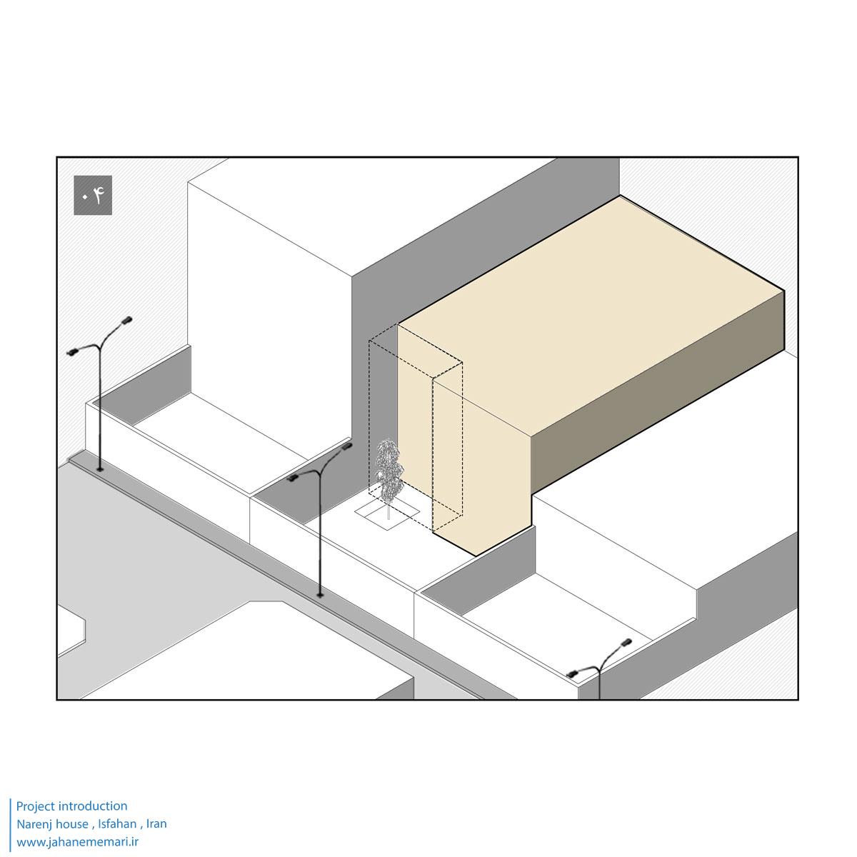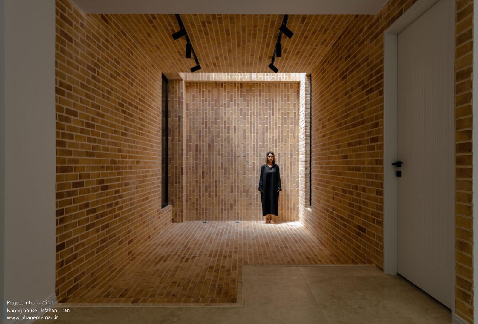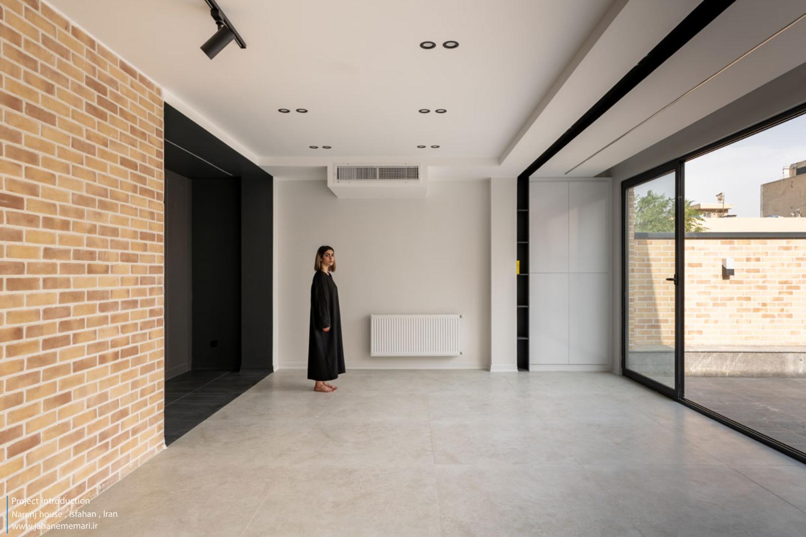 وجود درخت نارنج 10 ساله ای که در موقعیت مناسبی قرار داشت، بسیاری از خطوط فکری حاضر را برای ما ترسیم میکرد. خواست کارفرما خانه ای دلباز و کاربردی به همراه یک سوییت با دسترسی مجزا بود که مزاحمتی برای واحد اصلی نداشته باشد. واحد اصلی در همکف و سوییت در بالا، تعبیه شد. پله ای فلزی، به دور درخت میچرخد و حجم آجری را میشکافد تا به بالا برسد. حیاط بالا، فضایی است برای مهمانی ها و شب نشینی های تابستانه، و حیاط پایین، خلوتگاهی است درون گودال باغچه زیر سایه ی نارنج با عطر بهار و پاییز! در داخل نیز، نشیمنی تماما از آجر طراحی شد برای دورهمی ها در شب های سرد زمستان برای کنار هم بودن!
