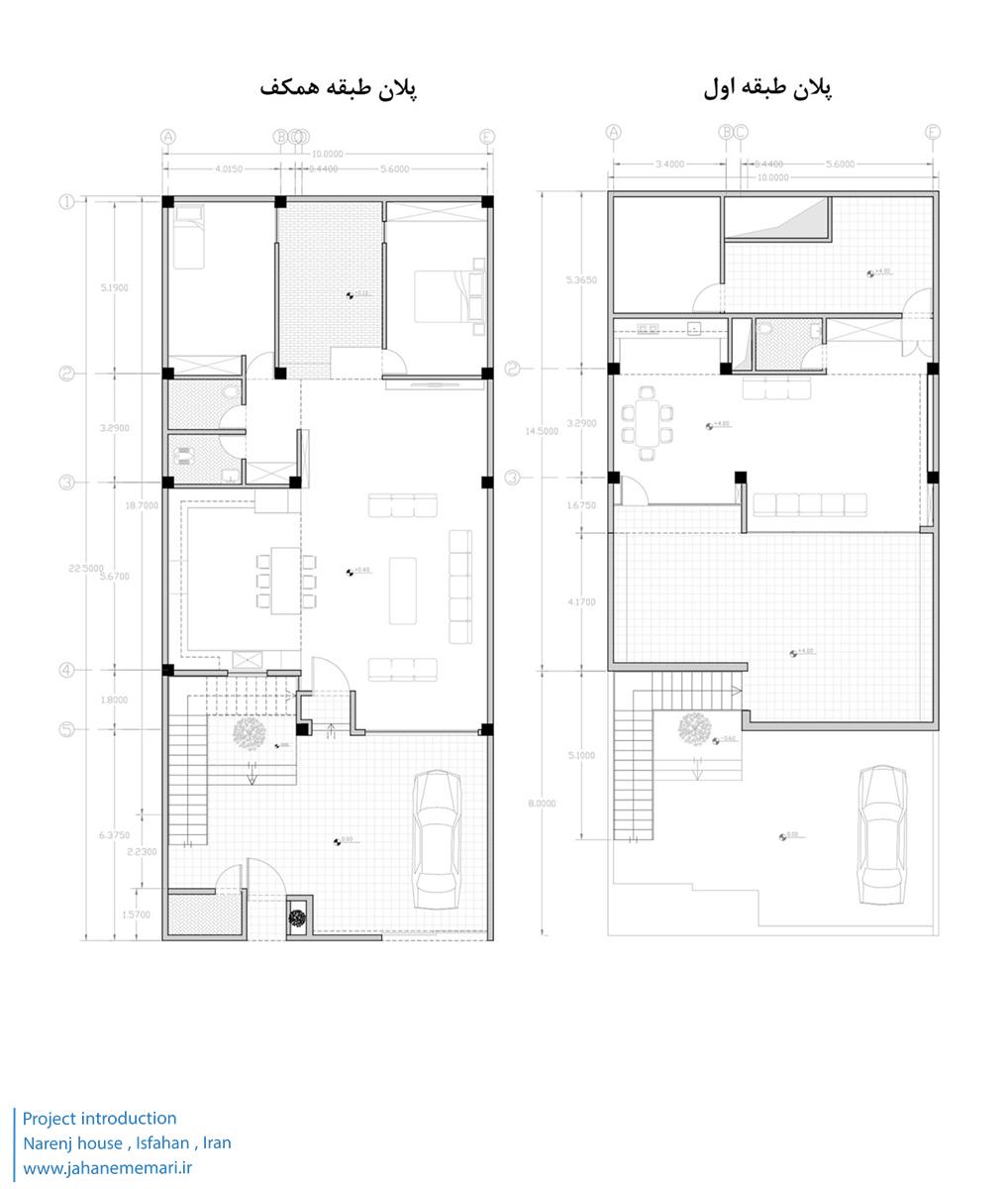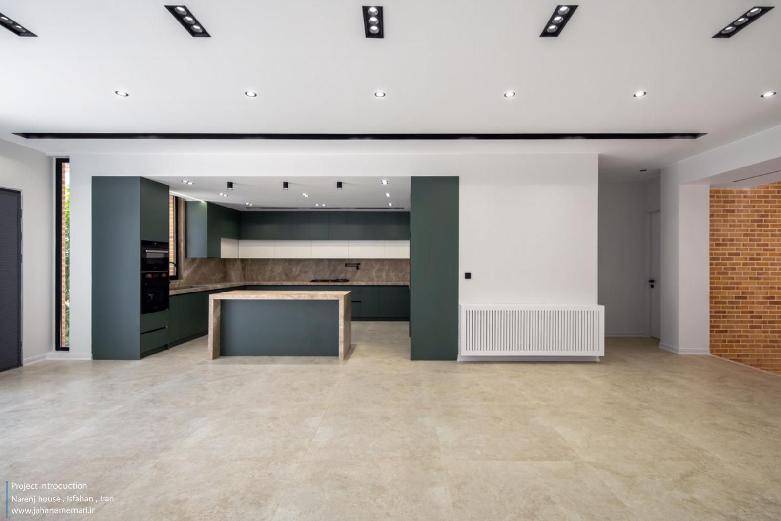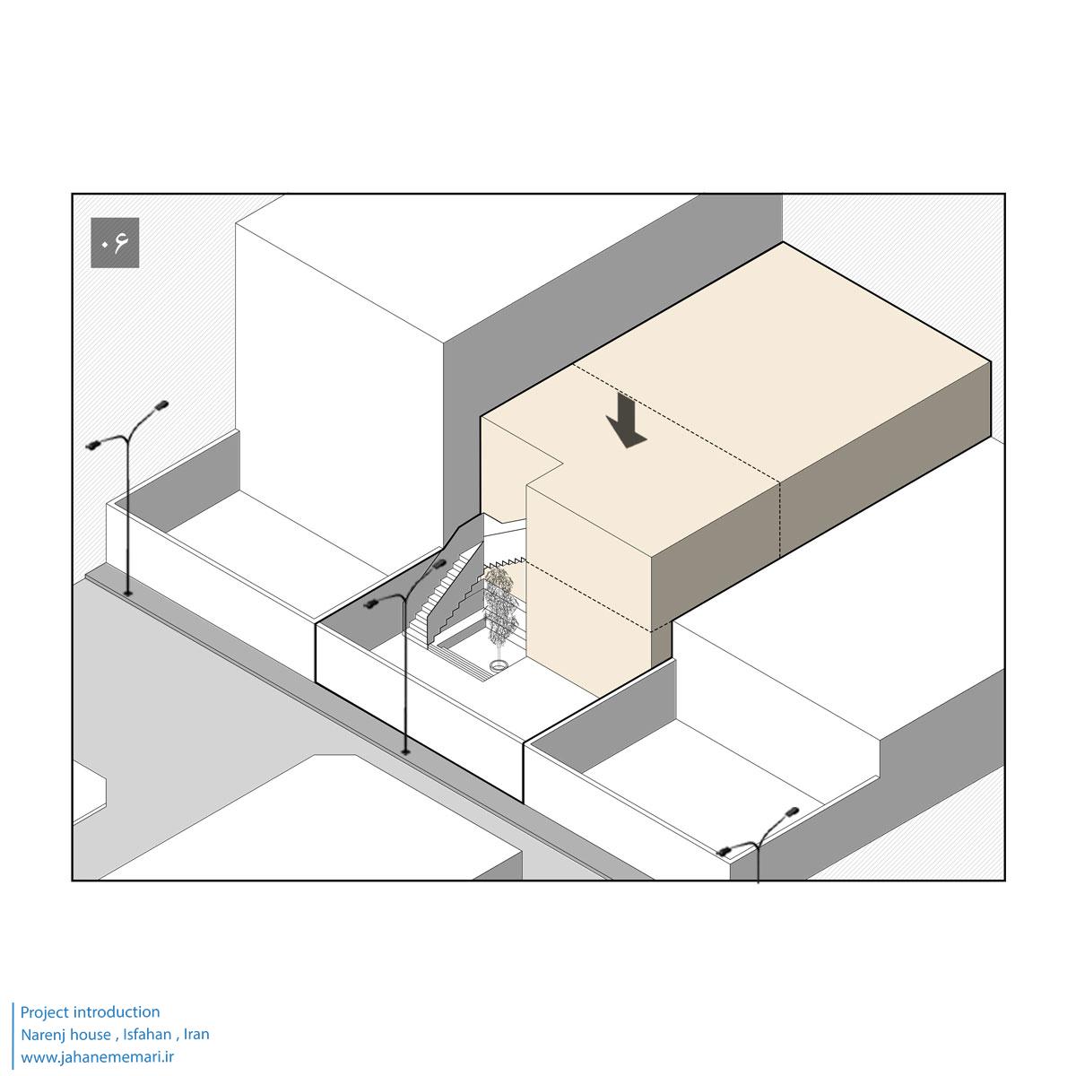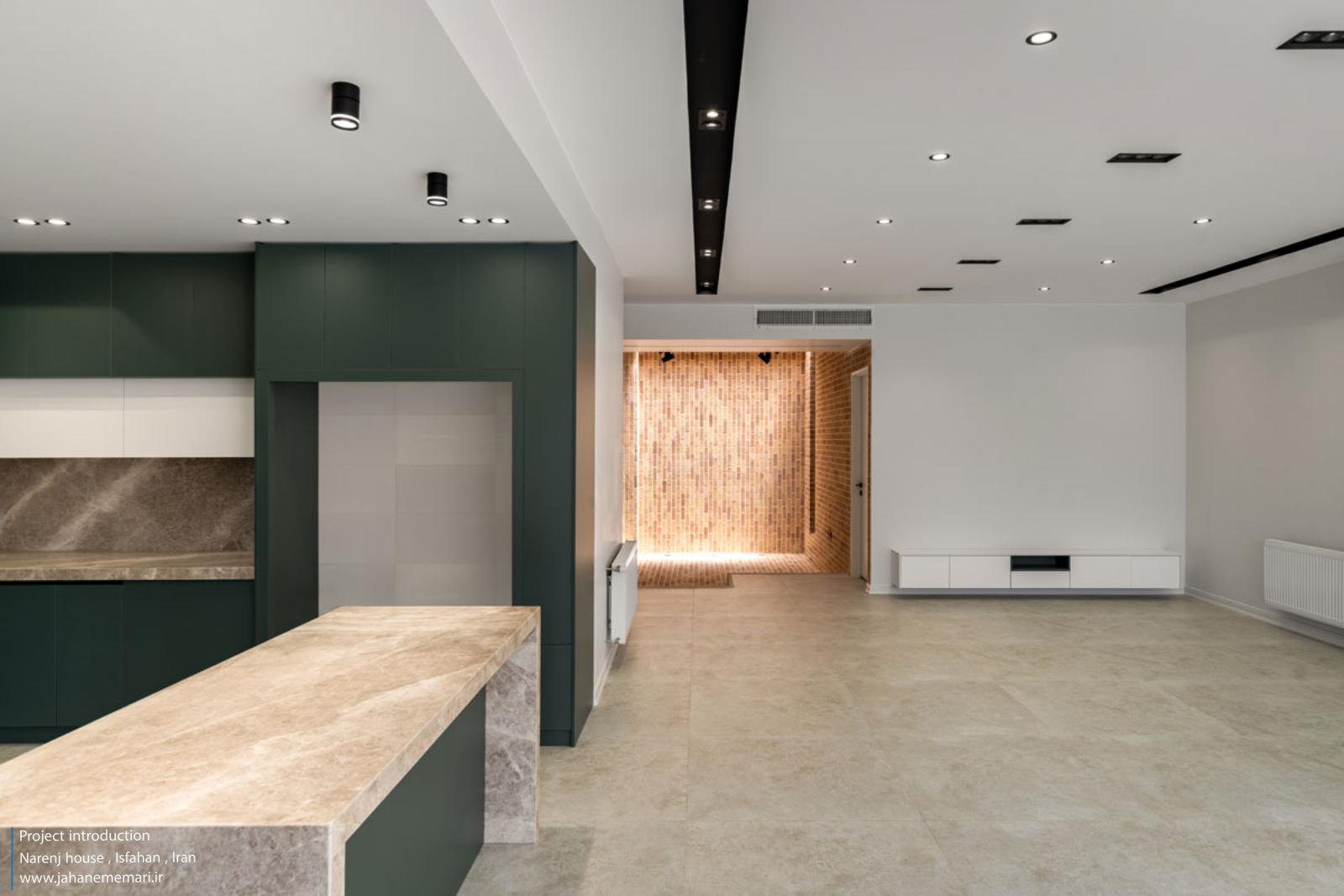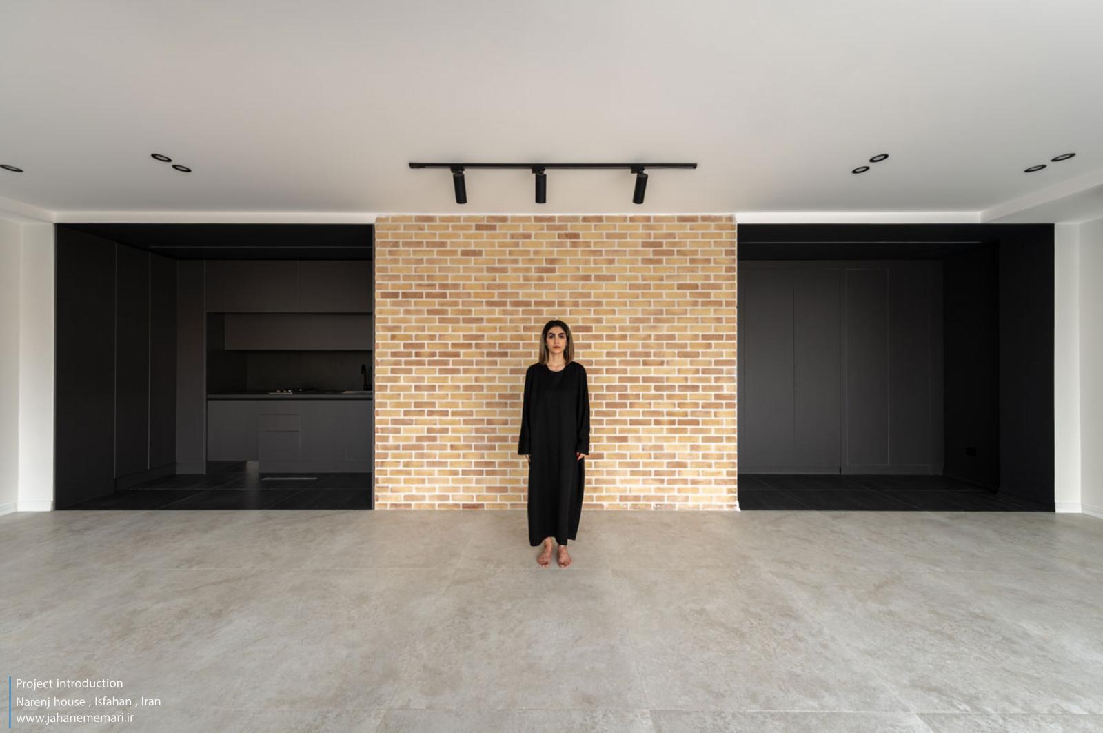 وجود درخت نارنج 10 ساله ای که در موقعیت مناسبی قرار داشت، بسیاری از خطوط فکری حاضر را برای ما ترسیم میکرد. خواست کارفرما خانه ای دلباز و کاربردی به همراه یک سوییت با دسترسی مجزا بود که مزاحمتی برای واحد اصلی نداشته باشد. واحد اصلی در همکف و سوییت در بالا، تعبیه شد. پله ای فلزی، به دور درخت میچرخد و حجم آجری را میشکافد تا به بالا برسد. حیاط بالا، فضایی است برای مهمانی ها و شب نشینی های تابستانه، و حیاط پایین، خلوتگاهی است درون گودال باغچه زیر سایه ی نارنج با عطر بهار و پاییز! در داخل نیز، نشیمنی تماما از آجر طراحی شد برای دورهمی ها در شب های سرد زمستان برای کنار هم بودن!