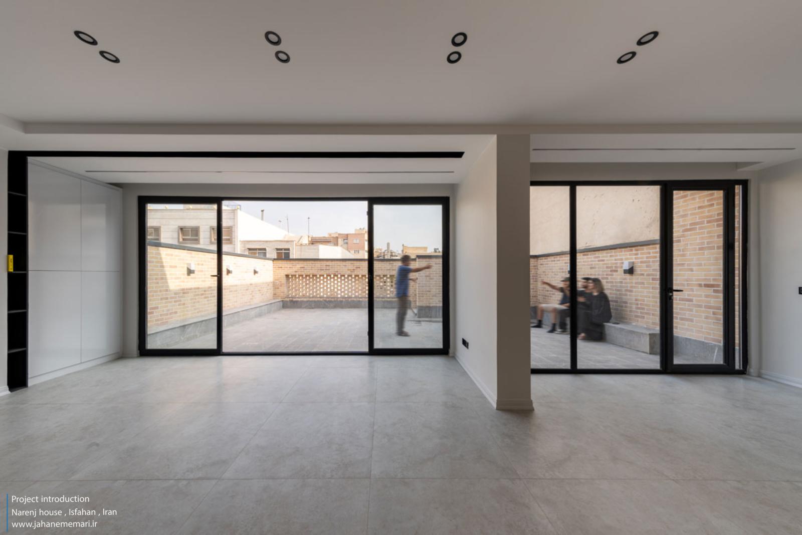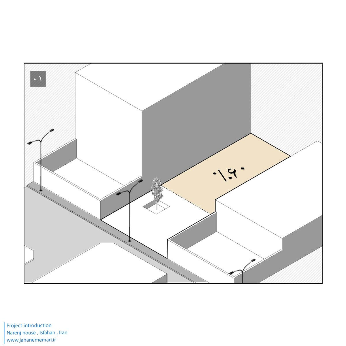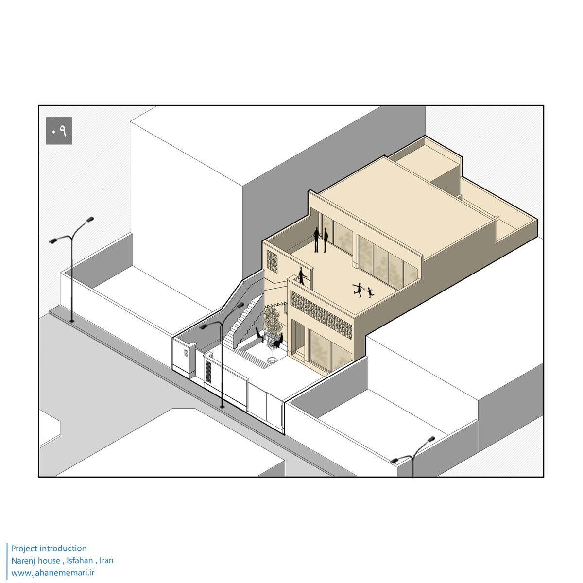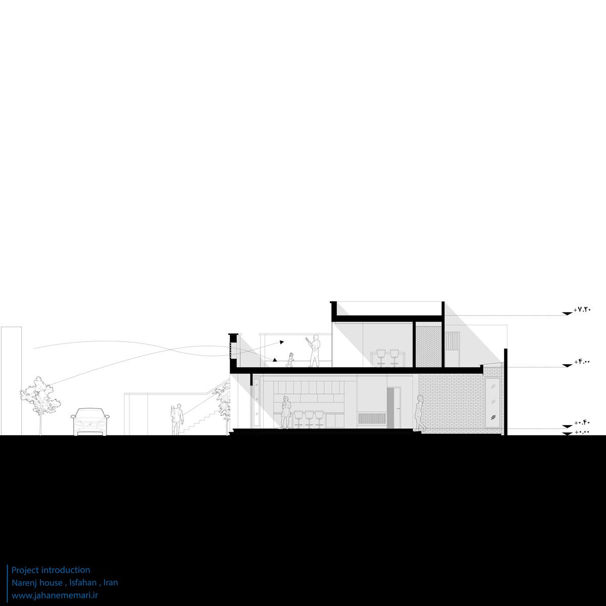 خانه ایست برای اعتراض! اعتراض به اوضاع و احوال شهرهای کوچک امروزی با جداره های ناهمگن و بی ربط در بافت و بدنه ها که هر یک، ساز خود را میزنند. خانه نارنج، پاسخی است به وضعیت موجود. حجمی آجرپوش که دیوارهایش با بافتی زبر و جزئیاتی ساده، حریمی آرام اما قاطع برای درون و بیرون، میسازد. پشت این مرز، فضایی قرار دارد که بر اساس شیوه زیست کارفرما، طراحی شده است. برای جلوگیری از صلب بودن حجم، دریچه ها و روزنه هایی خالی شد تا هم از بیرون دیده نشویم و هم گاهی از آن ها سرک بکشیم و نسیمی ملایم در آن، بوزد.