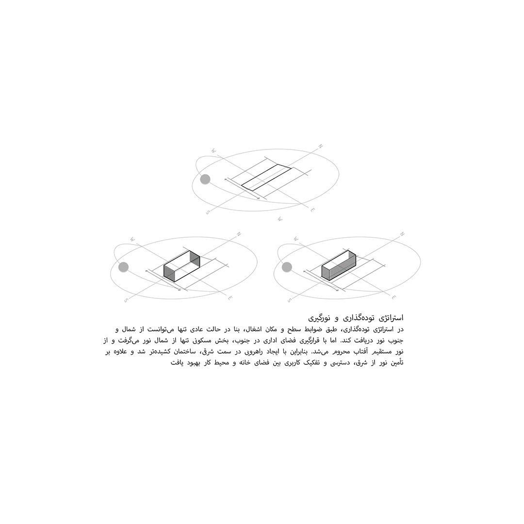 این جدایی فضایی درعینحال نوعی پیوند میان دو وضعیت متفاوت ــ کار/زندگی و اجتماع/خلوت ــ را در قالب یک کالبد مشترک بازنمایی میکند. کنسول ۳.۲۰ متری ورودی که برای عبور خودرو و دسترسی به حیاط پشتی شکل گرفته است، صرفاً پاسخی عملکردی نیست، بلکه ژستی مفهومی است که این دوگانگی را برجسته میسازد.