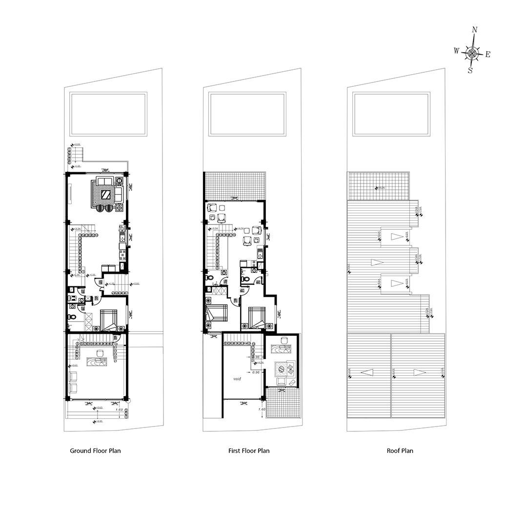 • بخش جلو بهعنوان فضای تجاری/دفتر کار در یک و نیم طبقه، رو به جاده و اجتماع محلی گشوده شده است. مساحت همکف این بخش ۴۰ مترمربع است و سقف بلند آن باعث میشود فضای کوچک همکف تجاری بزرگتر بهنظر برسد. فضای دفتر در نیمطبقه بهصورت معلق قرار گرفته تا تفکیک فضایی و خوانایی عملکردی آن تقویت شود.