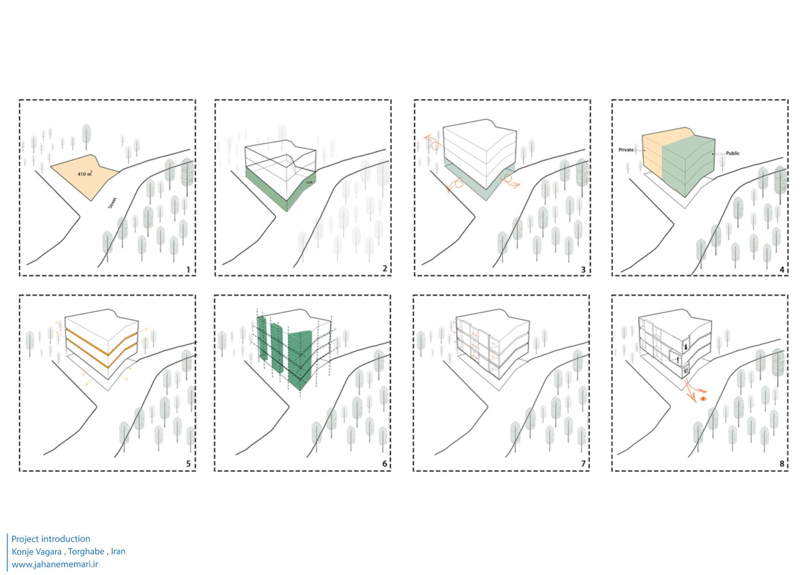 در ادامه سعی کردیم چند “دیاگرام فضایی” (Spatial diagram) و “ساختاری” (Structural diagram) مختص به پروژه طراحی کنیم. فضاهای عمومی و خصوصی را به صورت شمالی و جنوبی جدا کردیم و فضاهای خواب را از هیاهوی پارک دور کردیم. “پاکت فضایی” (Space Pocket) پروژه را در سه نوع فضای نیمه باز دیدیم که شامل: تراس‌های نشیمن، تراس‌های اتاق خواب و تراس‌های آشپزخانه است.