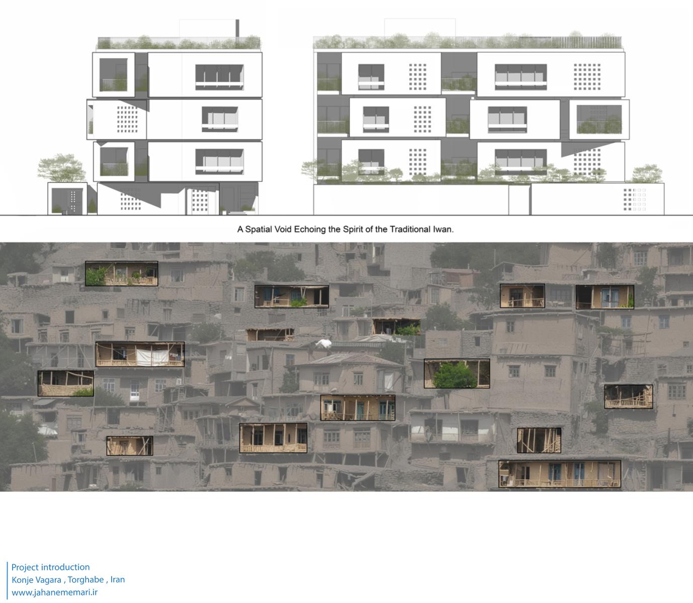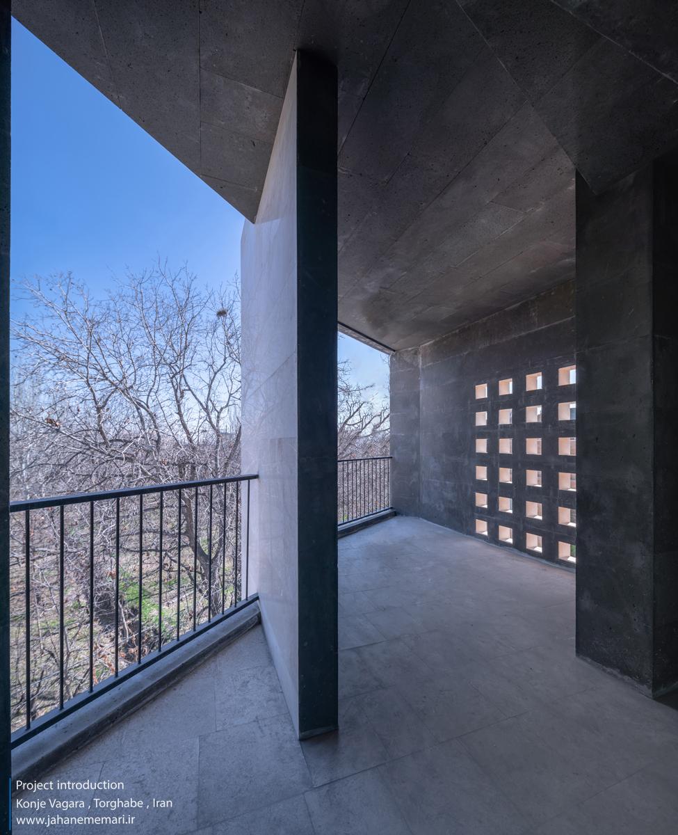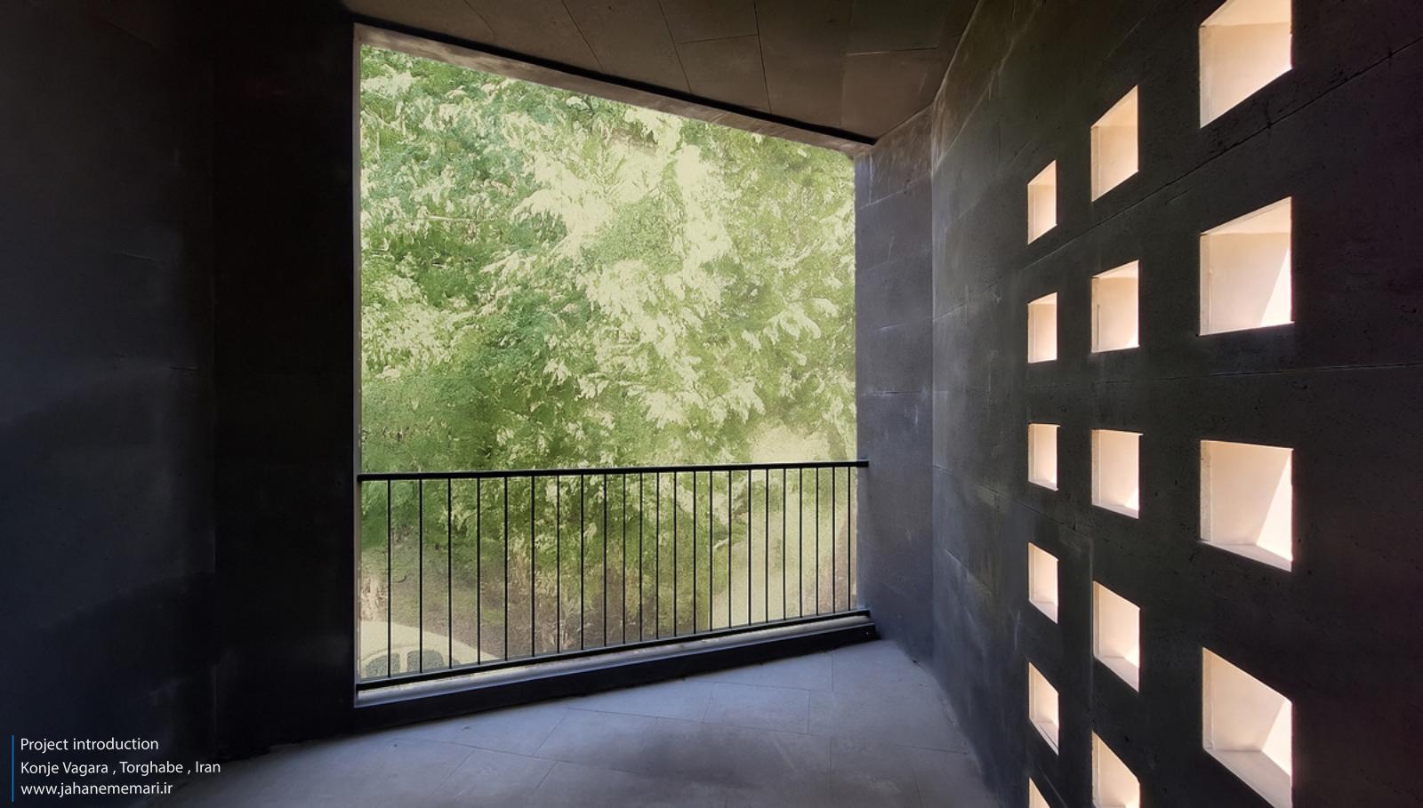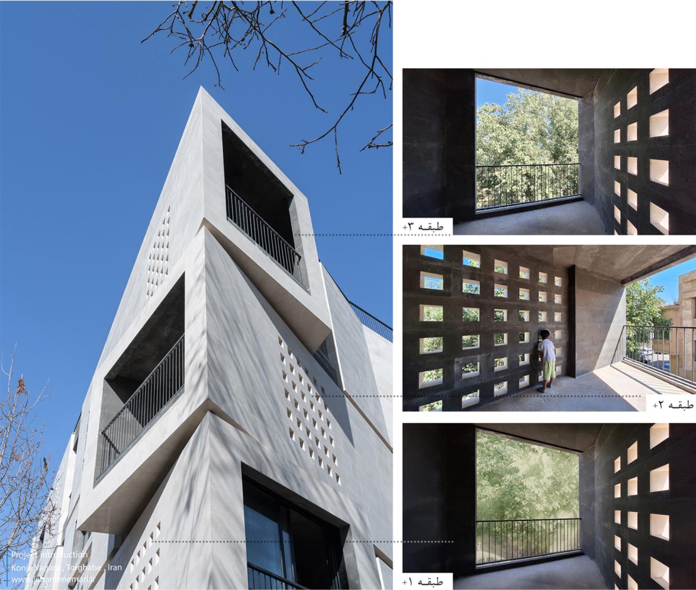 در واقع ایده ی اصلی این پاکت فضایی برگرفته از” ایوان ” خانه های قدیم در بافت منطقه بوده است . ناگفته نماند جهت‌گیری این تراس‌ها در کنج، با توجه به مواجهه با آفتاب و پارک در طول ساخت اسکلت ساختمان چندین مرتبه توسط پدر و دختر تغییر کرد و بر اساس طبع هر خانواده، جهت گیری، طراحی شد.