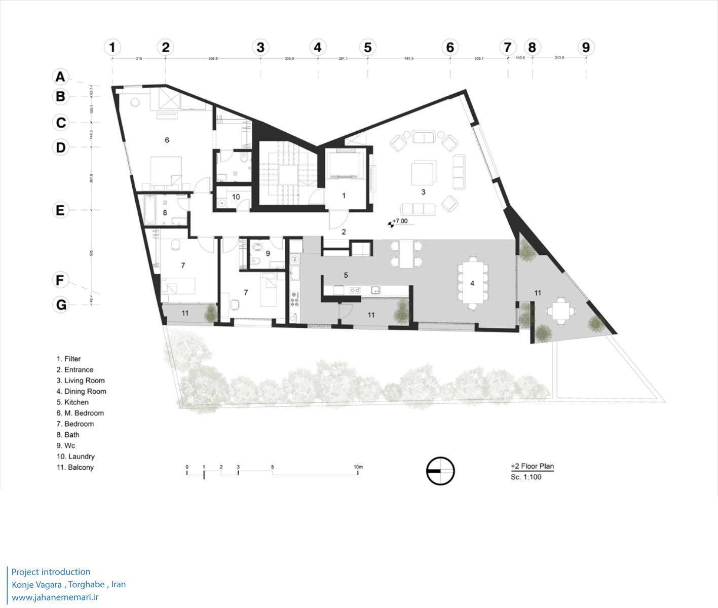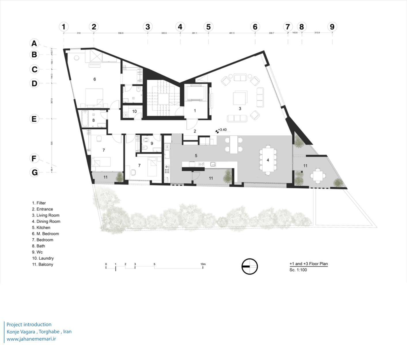 حد میان خانه و آپارتمان همیشه به عنوان چالش اصلی طراحی در سکونت‌گاه‌ها محسوب می‌شود. قاب‌های متعدد و با حس و حال متفاوت در این اثر معماری باعث شده که حس و حال‌های مختلفی(atmosphere) در هر طبقه برای سه نسل کاربر ( پدر، پسر و دختر) بوجود بیاید.