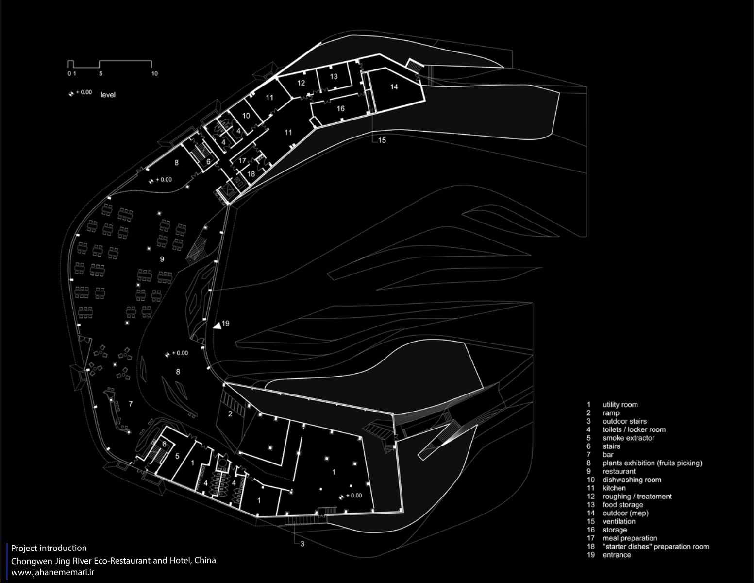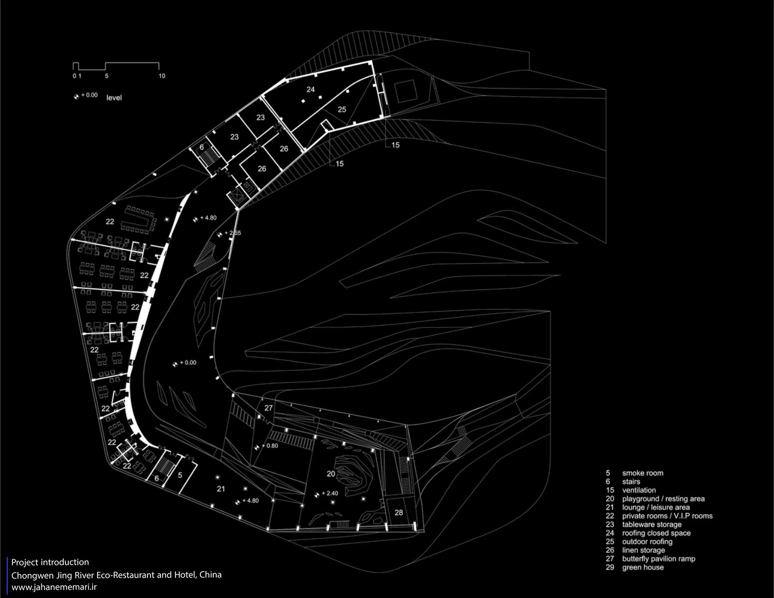هتل طراحیشده در سمت شمالی رستوران قرار گرفته است و چیدمان آن بهصورت چرخشی آینهای نسبت به رستوران است. برخلاف رستوران اکولوژیکی، بلوکهای پیوستهی هتل از نمای بیرونی باز میشوند تا بالکنهای باز اتاقها را شکل دهند. افزون بر این، انحنای بام بهصورت طبیعی به شکل مثلثهای زیگزاگی درآمده که از پیچش قویتر حجم بنا ناشی میشود.