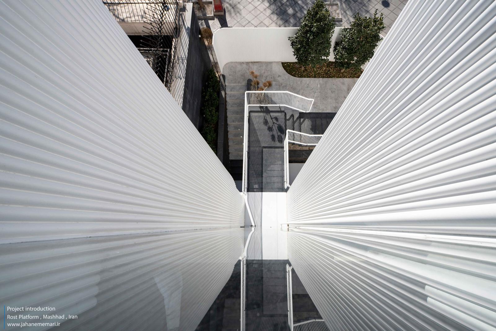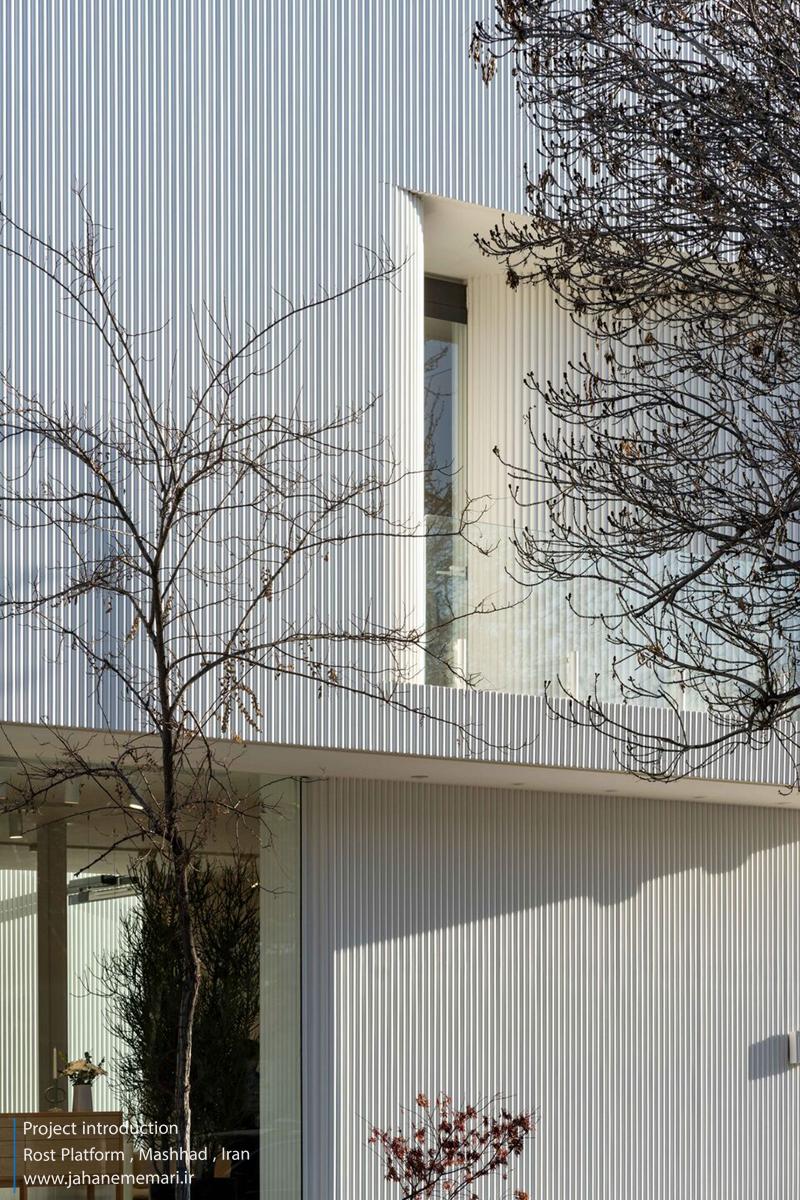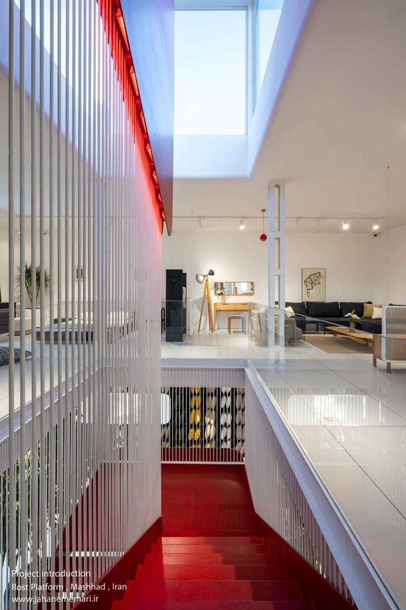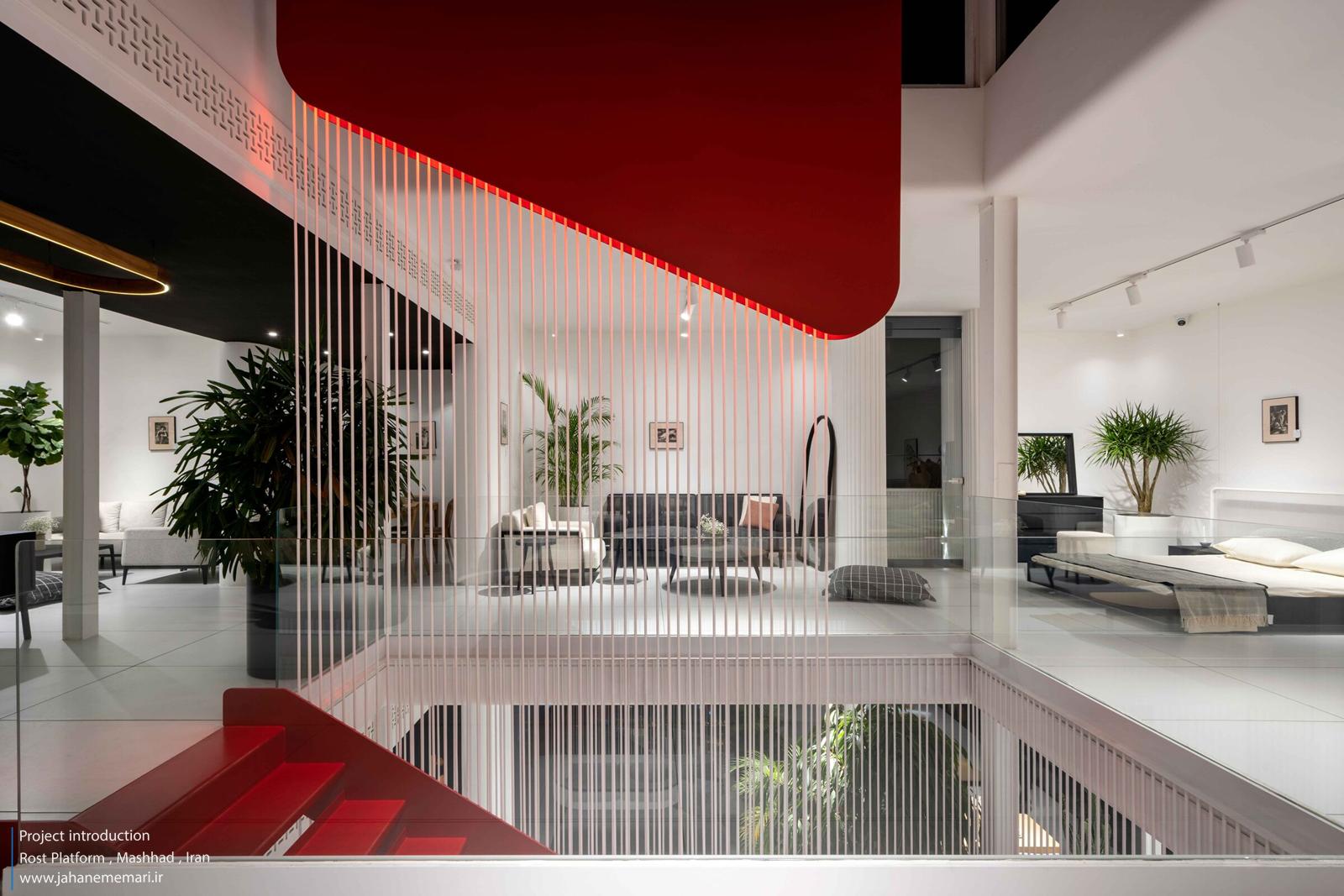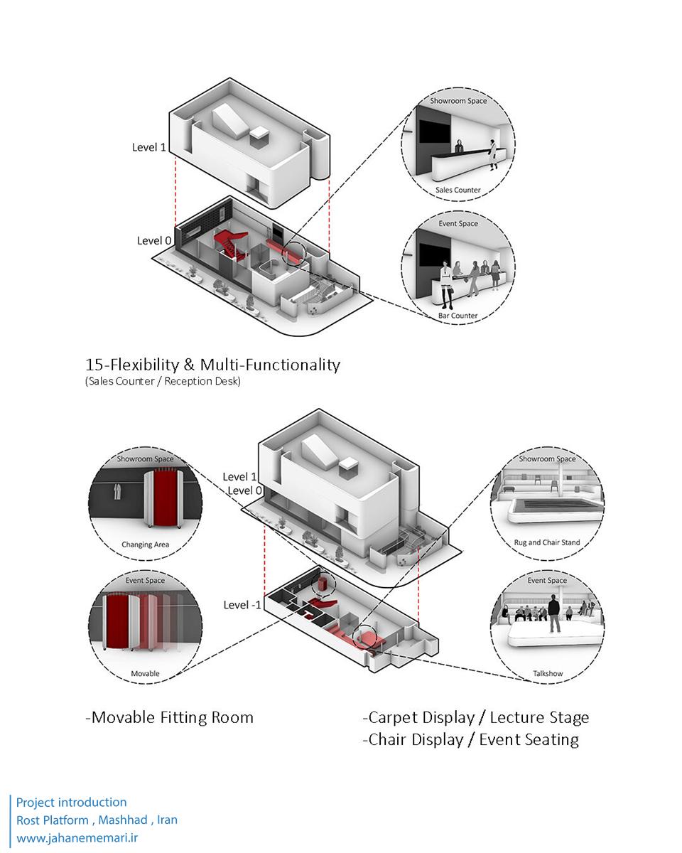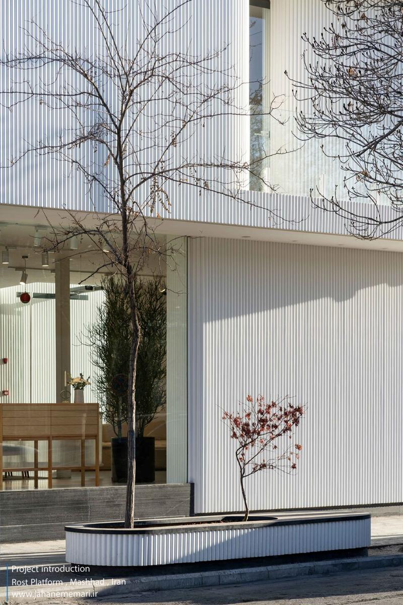 پلتفرم رُست خود را از ساختمانهای تجاری اطراف با سادگی و حذف اضافات متمایز میکند و موجب میشود که مخاطبان بهطور دقیقتری با آن درگیر شوند. این رویکرد نهتنها نقش اجتماعی پروژه را در شهر تقویت میکند بلکه فراتر از یک نمایشگاه معمولی قرار میگیرد. با فراهم کردن فضایی برای رویدادهای فرهنگی، پروژه خود را بهعنوان یک پلتفرم—فضایی پویا و در حال تحول که فراتر از کارکرد تجاری خود عمل میکند—تعریف میکند.