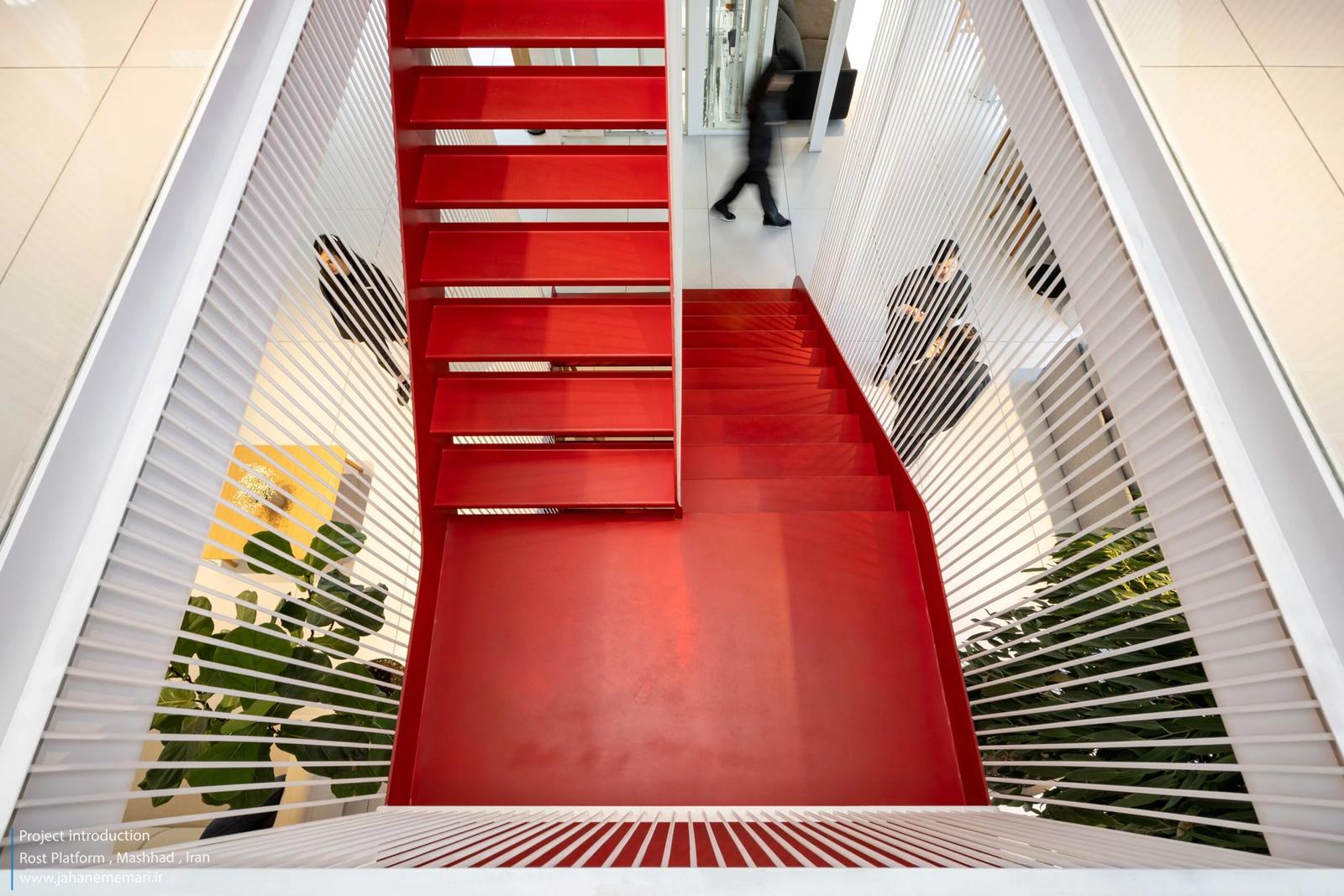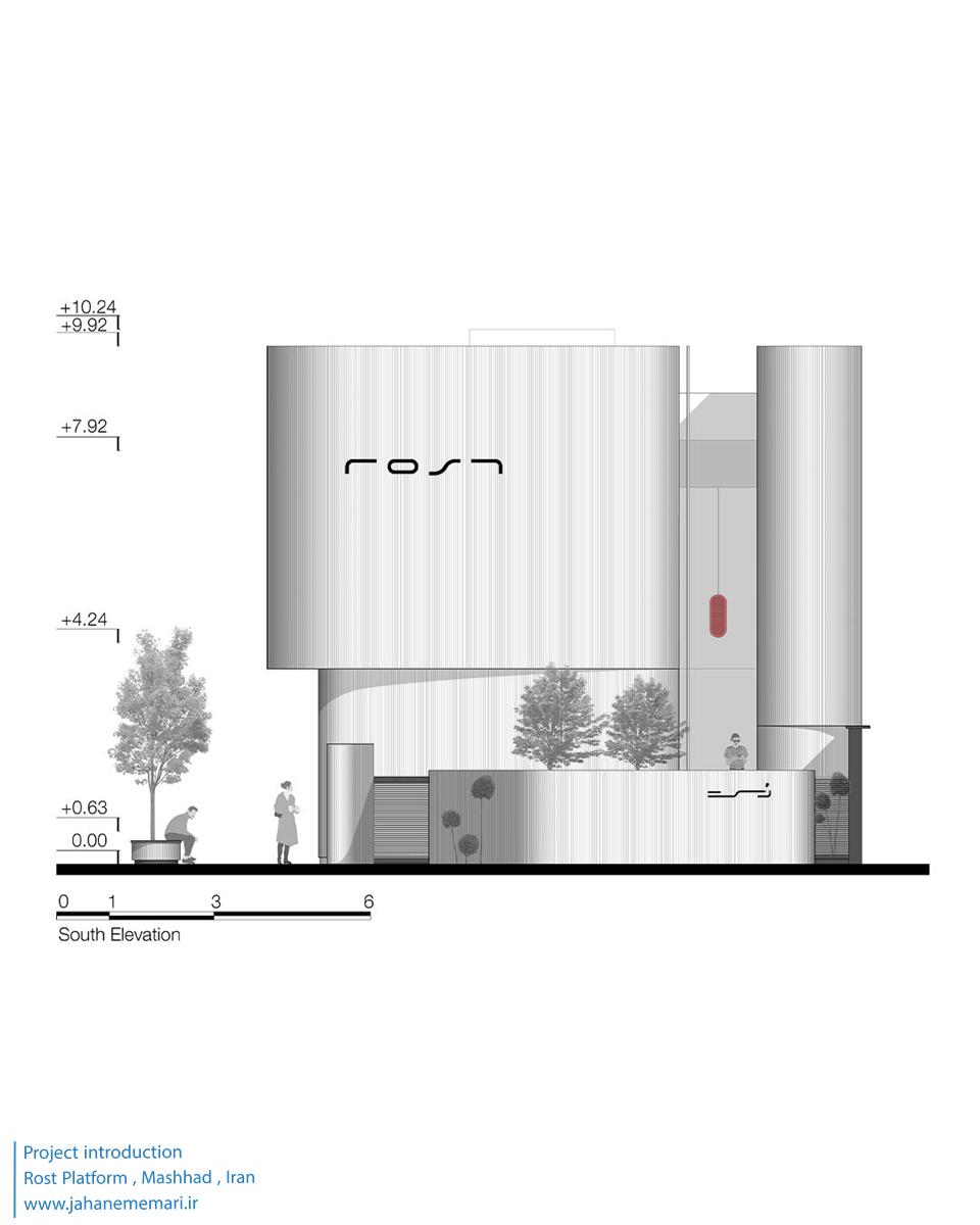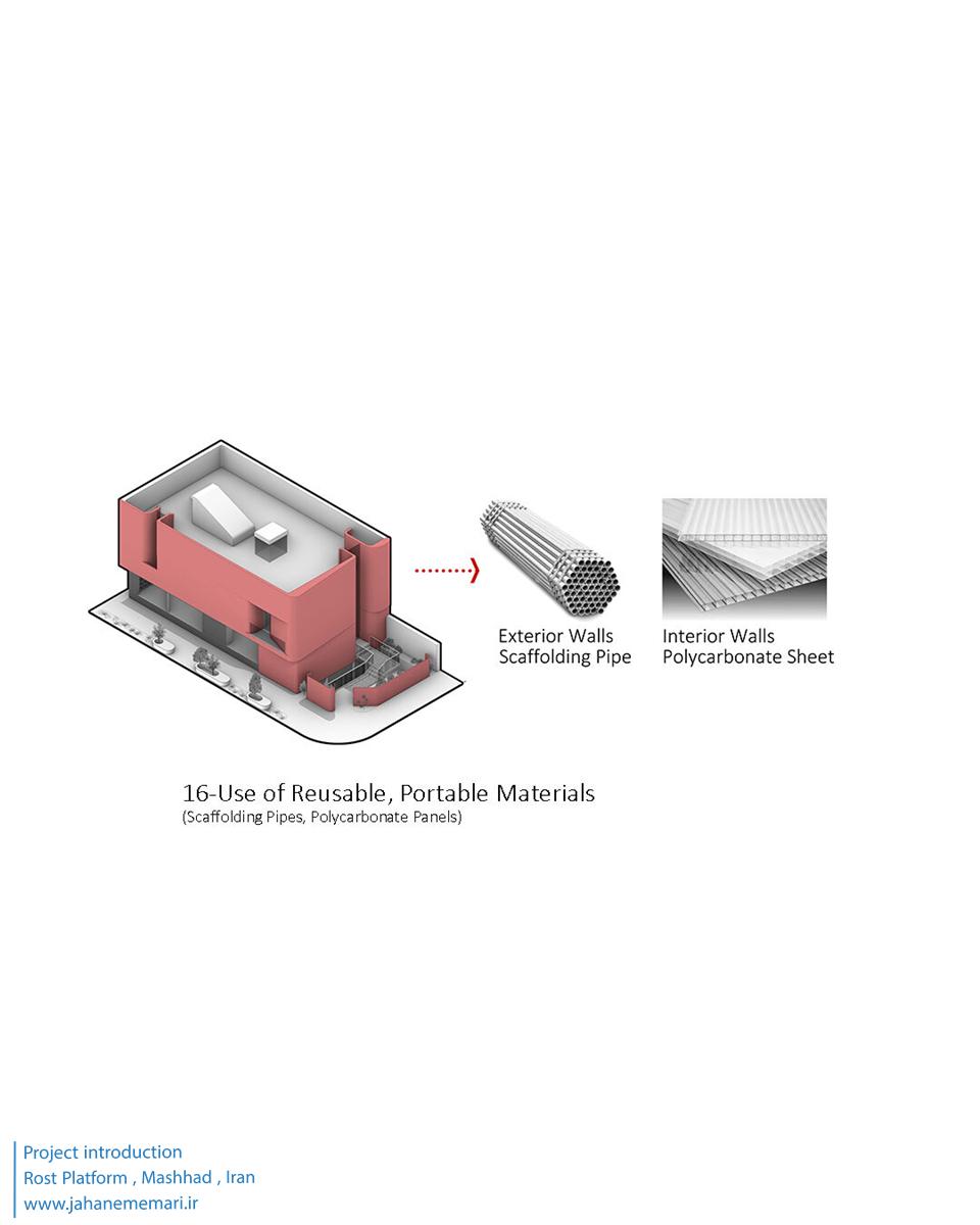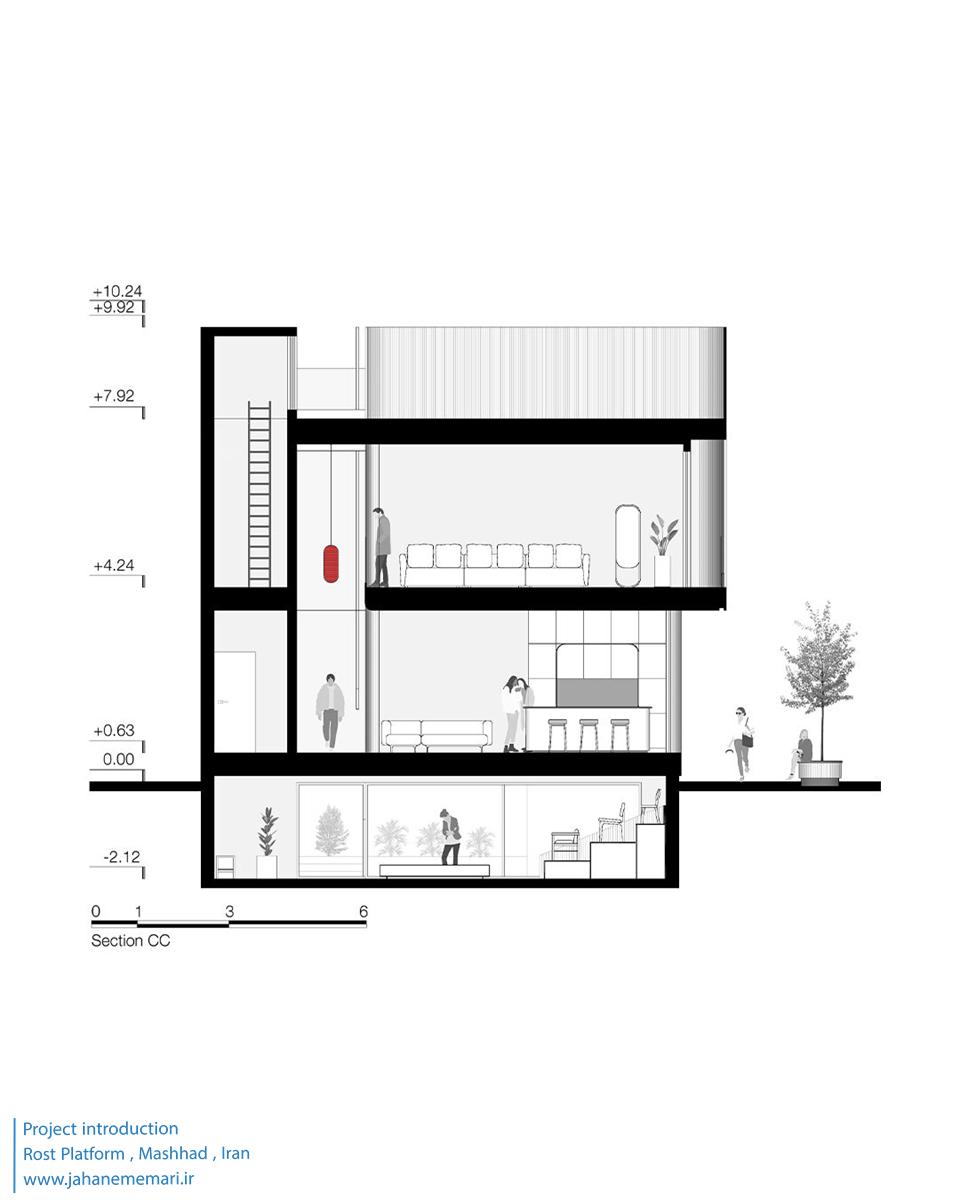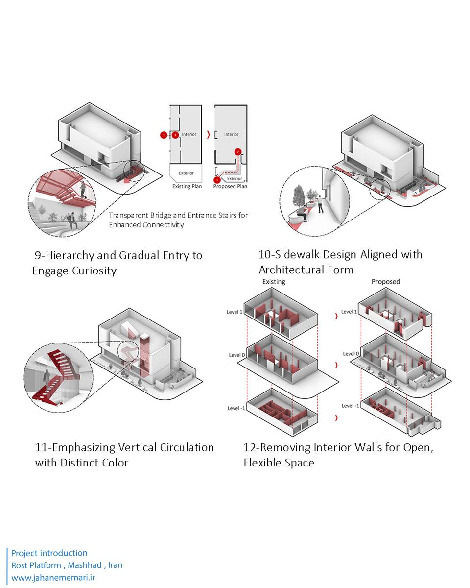 پلتفرم رُست خود را از ساختمانهای تجاری اطراف با سادگی و حذف اضافات متمایز میکند و موجب میشود که مخاطبان بهطور دقیقتری با آن درگیر شوند. این رویکرد نهتنها نقش اجتماعی پروژه را در شهر تقویت میکند بلکه فراتر از یک نمایشگاه معمولی قرار میگیرد. با فراهم کردن فضایی برای رویدادهای فرهنگی، پروژه خود را بهعنوان یک پلتفرم—فضایی پویا و در حال تحول که فراتر از کارکرد تجاری خود عمل میکند—تعریف میکند.