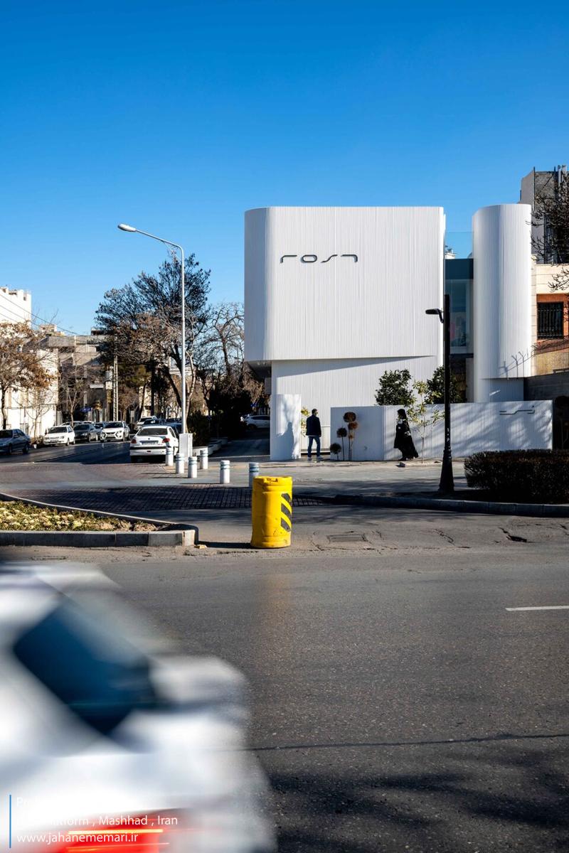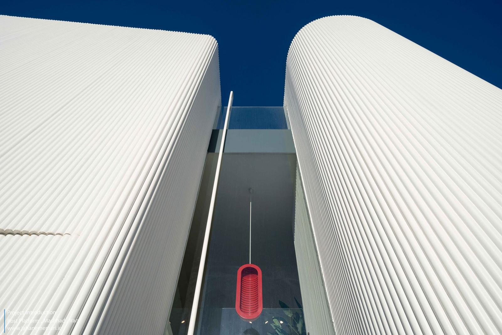 نمای خارجی نمایشگاه با رویکردی انتقادی طراحی شده است—فرم آن ساده، سفید و یکپارچه است که حداقل شفافیت و ابعاد کوچکی برای ویترینها دارد. باوجود سادگی، پانلهای نمای خارجی بهطور ملایم در گوشهها به سمت داخل خم میشوند و بهطور یکپارچه با دیوارهای داخلی که فضای نمایش محصولات را احاطه کردهاند، ترکیب میشوند. این رویکرد یکپارچه، هویتی را ایجاد میکند که از درون فضا سرچشمه گرفته و به حیطه عمومی امتداد مییابد.
