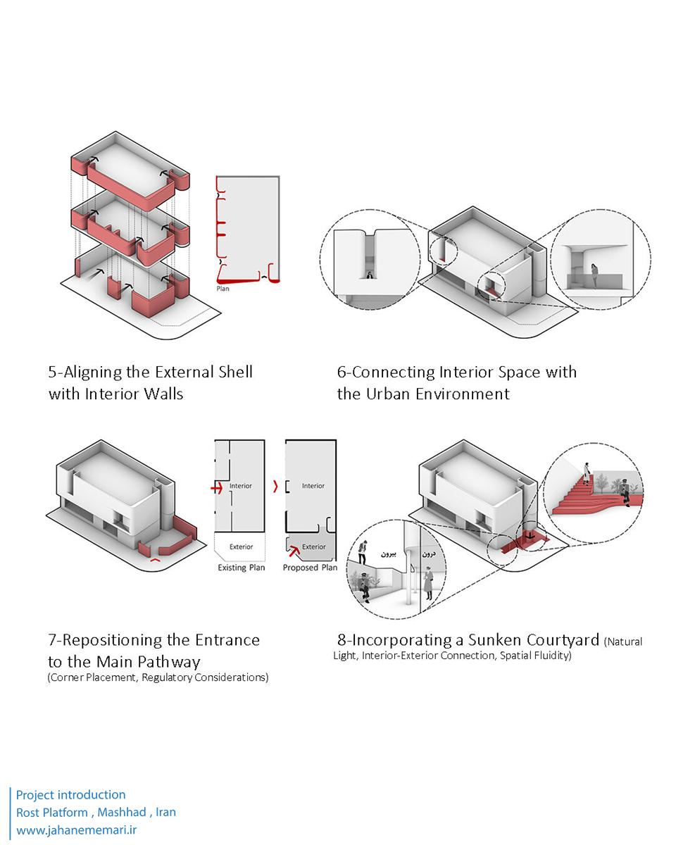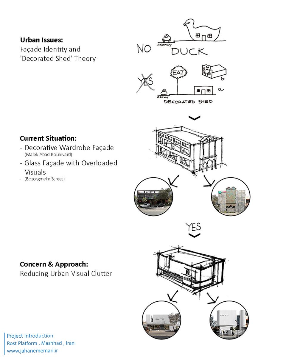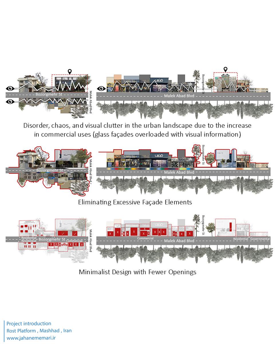 هر دو این رویکردها در معماری تجاری رایج هستند، اما به اختلال بصری و آشفتگی شهری کمک میکنند. رفع این مشکل بهعنوان یک دغدغه اصلی در طراحی پروژه مطرح شد.