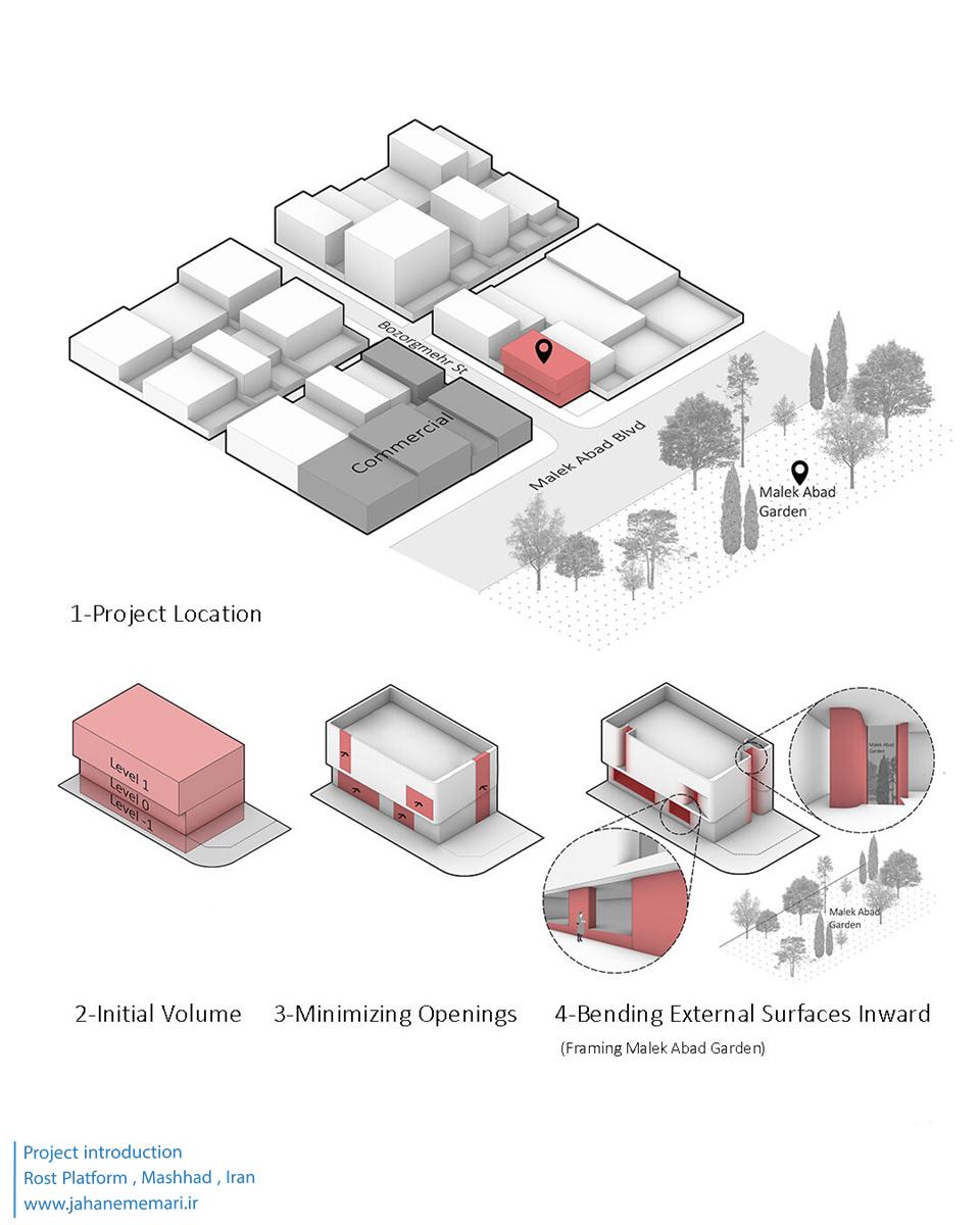 محل پروژه پیشتر یک فروشگاه مبلمان بوده است. در نمایی که رو به بلوار ملکآباد مشهد داشت، یک کمد بزرگ نصب شده بود که بهطور ضمنی یادآور نظریه «ساختمان تزیینی» رابرت ونچوری و دنیس اسکات براون است. این نظریه تأکید دارد که هویت یک ساختمان از طریق فرم و معماری آن شکل نمیگیرد بلکه از طریق تزئینات و یا تابلوهای گرافیکی در نمای ساختمان شکل میگیرد.
