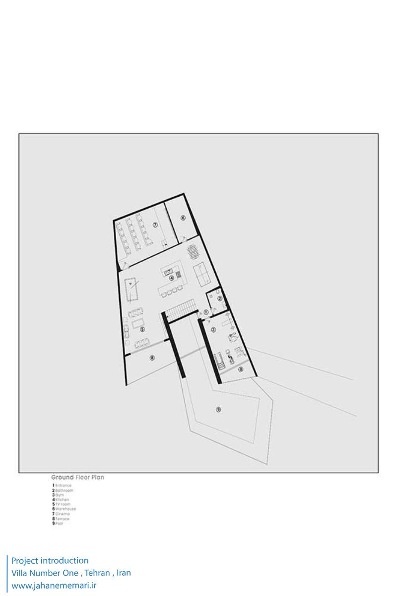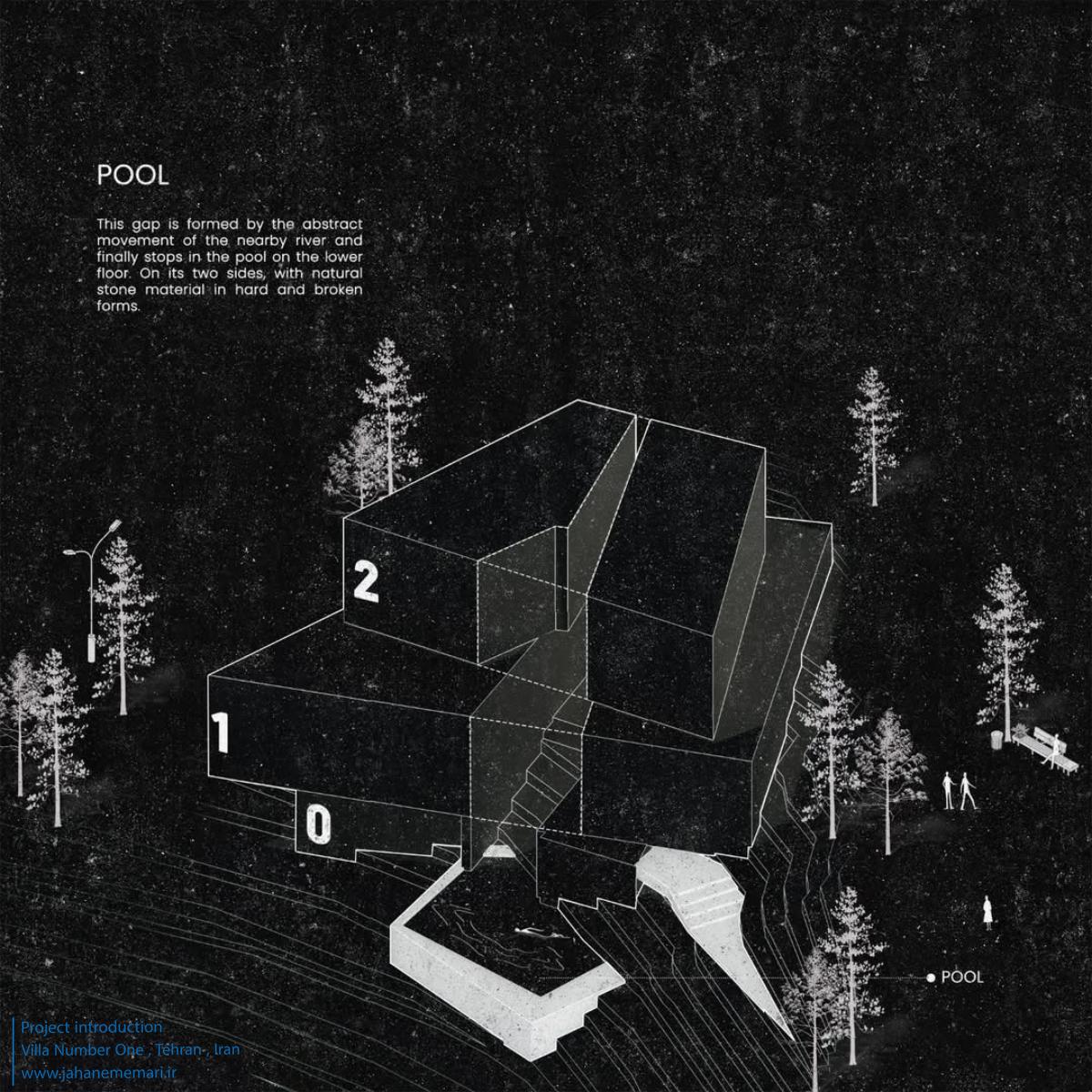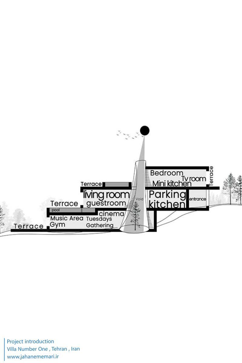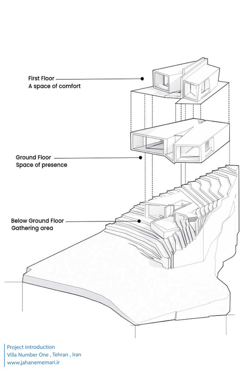 کاربری ها در سه طبقه اصلی شکل گرفته اند که شامل : فضای آسودگی-فضای حضور و فضای شادمانی هر کدام در کنش و واکنش با یکدیگر جانمایی شده اند. بخش حضور که کاربری های عمومی را در خود جای داده در فضای میانی قرار دارد و عنصری اتصال دهنده و هم دور کننده دو بخش آسودگی(لایه بالایی) و فضای شادمانی(لایه پایین)است. در طبقه حضور که هم ارتفاع با تراز ارتفاعی شمال سایت می باشد، کابری های عمومی مانند پارکینگ، فضای های ورودی، آشپزخانه ، فضای پذیرایی، نشیمن و یک سوییت مهمان جانمایی شده است. بخش آسودگی، فضاهای خواب ، تراس های جداگانه و یک نشیمن خصوصی را شامل می شود. فضای شادمانی که در طبقه پایین قرار گرفته و به واسطه شیب زمین دسترسی مستقیمی به محوطه دارد، شامل فضاهای دورهمی، استخر، فضای ورزشی و فضای تماشای فیلم می باشد.