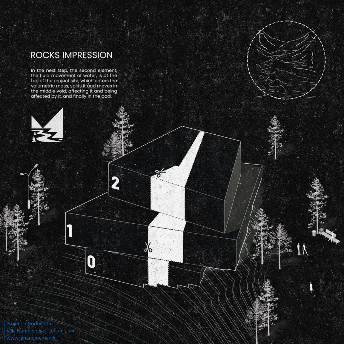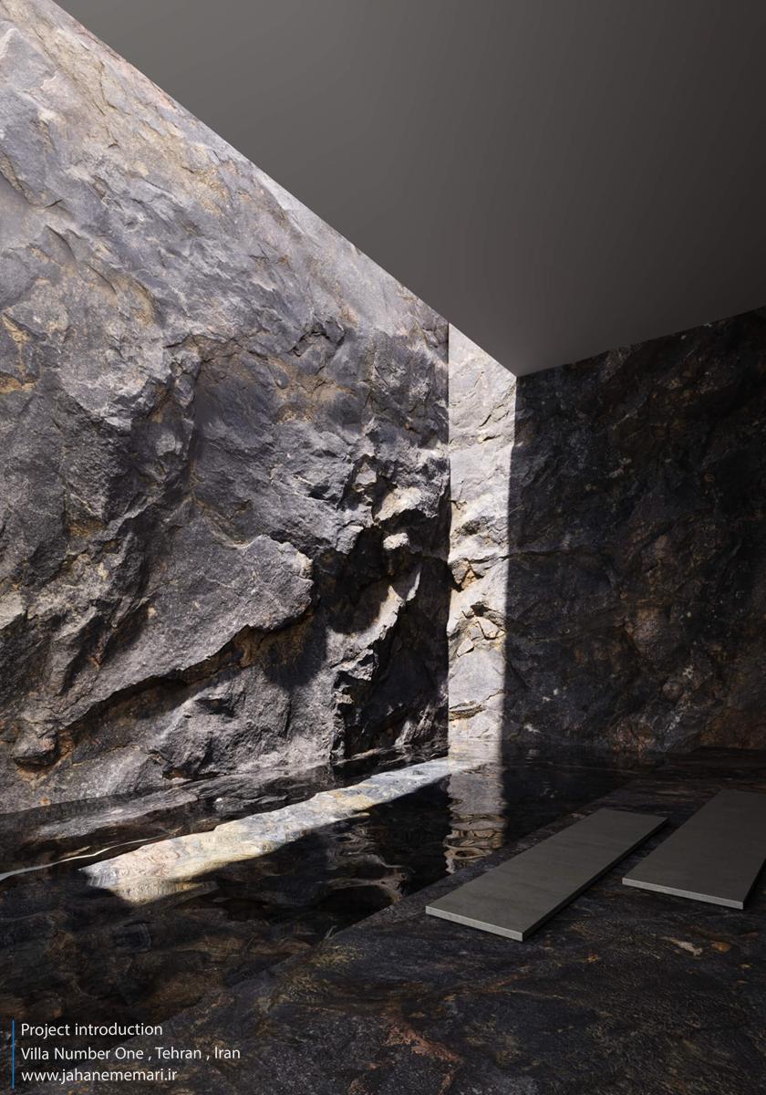 در گام بعد عنصر دوم،حرکت سیال آب،در بالاست سایت پروژه است که وارد توده ی حجمی می شود،آن را می شکافد و در وید میانی حرکت می کند و در آن تاثیر گذاشته و از آن تاثیر می پذیرد و در انتها در استخر در طبقه زیرین از حرکت می ایستد. این شکاف ایجاد شده که از حرکت انتزاعی رود مجاور شکل گرفته است در دو سمت خود با متریال سنگ طبیعی در فرم های سخت و شکسته بخش وید میانی را شکل می دهد که نمود بصری آن هم از نظر فرم و هم از نظر متریال در فضای بیرونی و داخلی پروژه ظاهر شده است. علاوه بر آن شکاف ایجاد شده باریکه ای از نور را به توده حجمی وارد می کند که در طول روز کیفیت های فضایی متفاوتی را با بازی نور و سایه به همراه دارد.