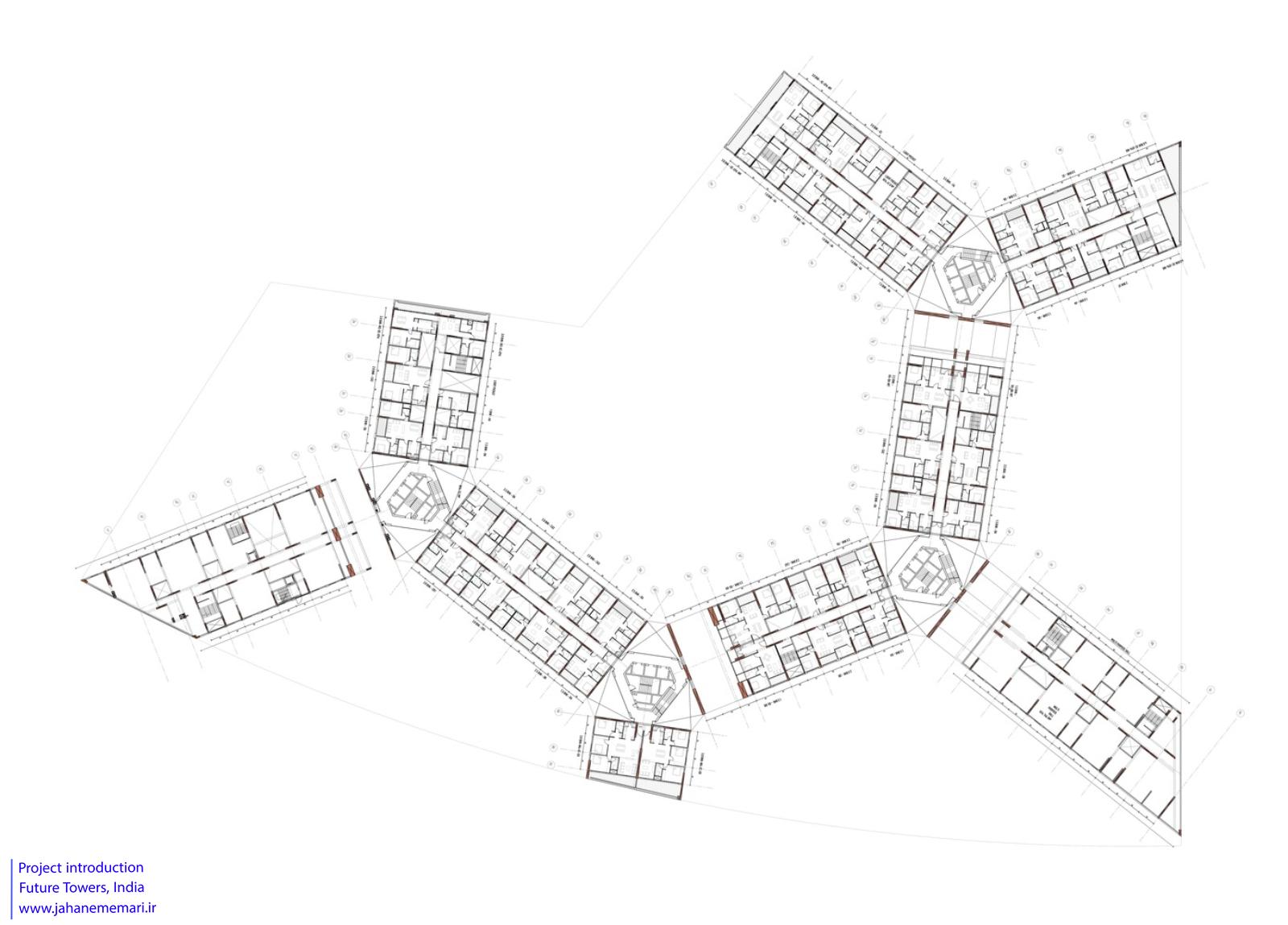 بر این اساس، طراحی شامل ۹ بال مسکونی با ارتفاعی بین ۱۷ تا ۳۰ طبقه است که پیرامون چهار هستهی ارتباطی مرکزی سازمان یافتهاند.