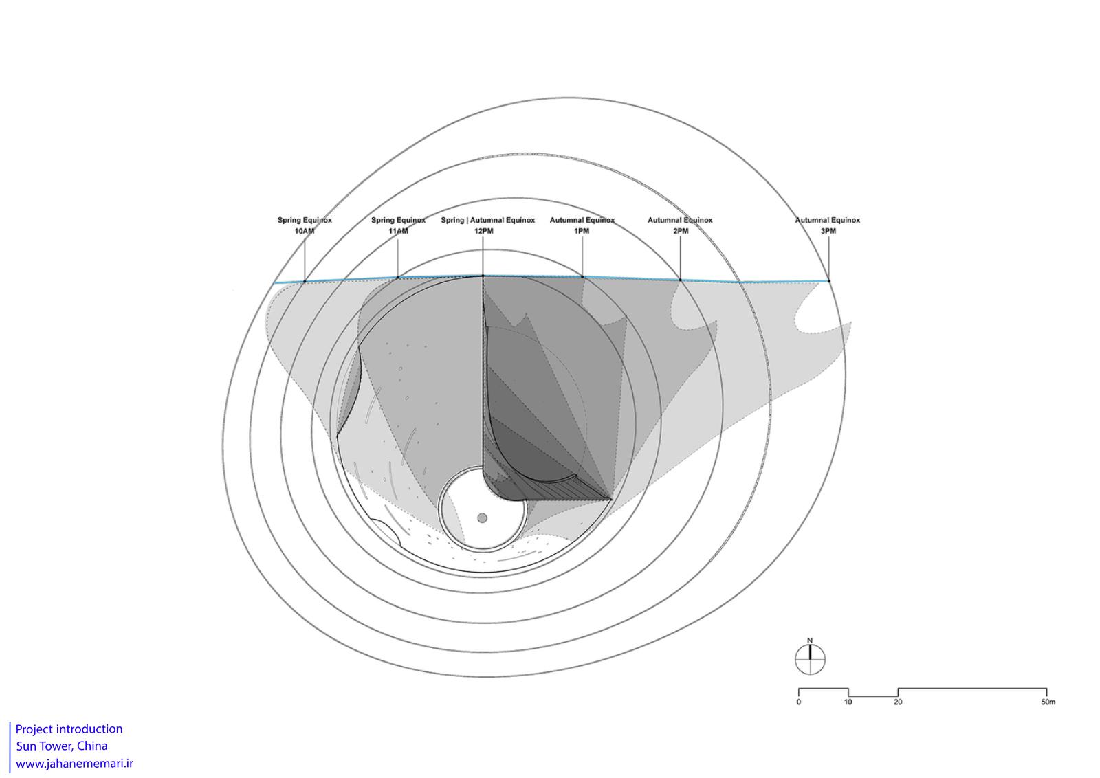 هندسهٔ برج خورشید بر اساس حرکت خورشید از دیدگاه محل پروژه شکل گرفته است. لبهٔ شمالی پوستهٔ بیرونی بنا با زاویهٔ تابش نور خورشید در هنگام ظهر در روزهای اعتدالین موازی است. محور تماشاخانهٔ روباز به سمت طلوع خورشید در جزیرهٔ افسانهای «ژیفو» در انقلاب تابستانی جهتگیری شده، در حالی که تونل ورودی بنا با مسیر غروب خورشید در انقلاب زمستانی همراستا است. دایرهٔ بام بر صفحهای قرار دارد که بر تابش خورشید در نیمروزِ انقلاب تابستانی عمود است.