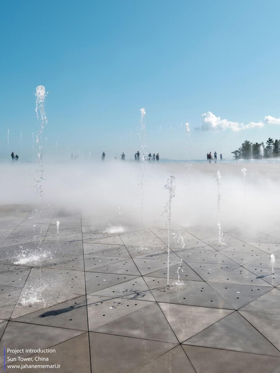 ساختمان بر روی میدانی بهشکل صدف دریایی قرار دارد. ردپای برج، در ترکیب با صحنهٔ تماشاخانهٔ روباز، دایرهای کامل را تشکیل میدهد. زمانی که صحنه برای اجرا استفاده نمیشود، به فضایی مملو از مه و فواره تبدیل میگردد. کف میدان از مرکز صحنه بهسوی دریا بالا میآید و یک آمفیتئاتر روباز بزرگ شکل میدهد. از مرکز میدان، حلقههای بیضوی متعددی بهصورت شعاعی گسترش مییابند و تصویری از مدار سیارات را تداعی میکنند. کانال آبیای که مماس با برج در سنگفرش حک شده، گذر زمان در روزهای اعتدالین را نشان میدهد — در این روزها، سایهٔ لبهٔ شمالی برج دقیقاً در امتداد این کانال حرکت کرده و هر ساعت، یکی از حلقههای بیضوی را قطع میکند. در بخشی از حلقهٔ بیرونی میدان، فوارههایی قرار دارند که ۲۴ «اصطلاح خورشیدی» (Solar Terms) تقویم سنتی قمری چین را جشن میگیرند. در روزهای عادی، پاشش فوارهها با جزر و مد دریا همزمان میشود.