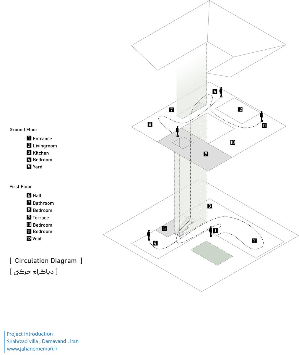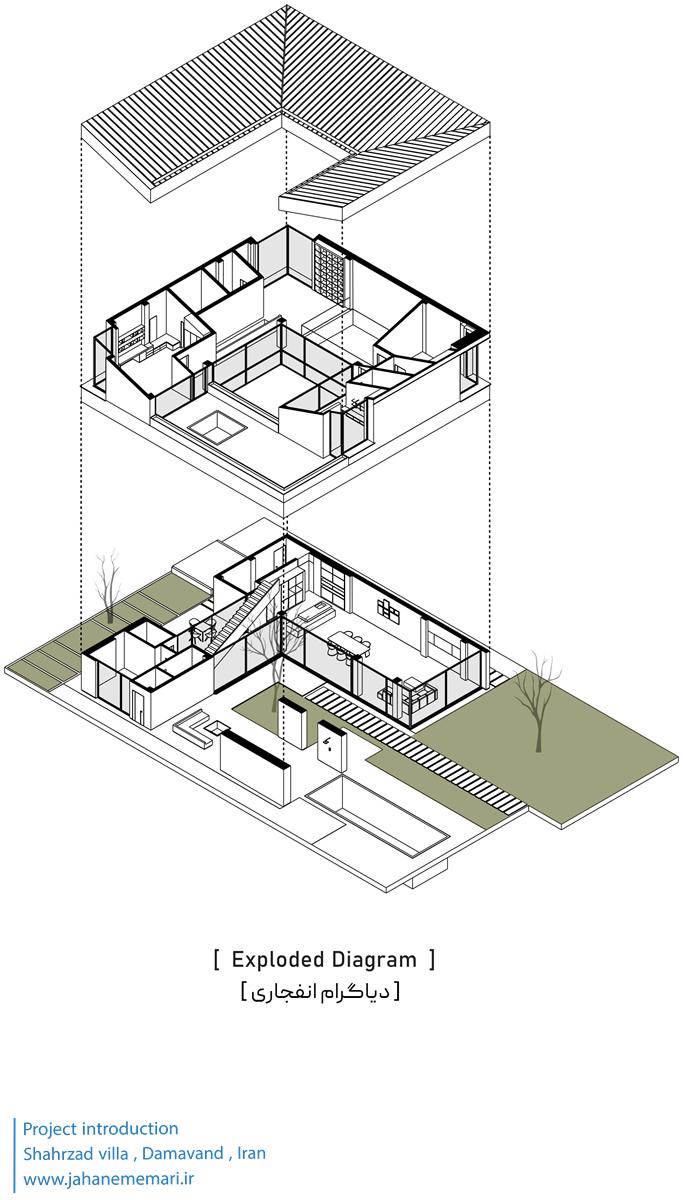 تقاطع فضاهای افقی، که در سراسر پلان لایه لایه شده اند، مستقیماً در مقاطع و اتصالات عمودی منعکس می شود و فضاهای پیش بینی نشده و غیرقابل پیش بینی را برای ساکنان ایجاد می کند. اوج این تعامل زمانی رخ می دهد که از میان فضاهای لایه لایه طبقه همکف و محیط حیاط مرکزی در طبقه اول عبور میکنیم و در نتیجه ترکیبهای فضایی و پرسپکتیوهای متنوعی ایجاد می شود. با توجه به موقعیت مکانی پروژه – و به تبع آن، خود ساختمان – به نظر می رسد که ویلا، در خلوت خود، ساکنان خود را به سکوتی سرشار از زندگی، به دور از سر و صدای روزانه، دعوت می کند.