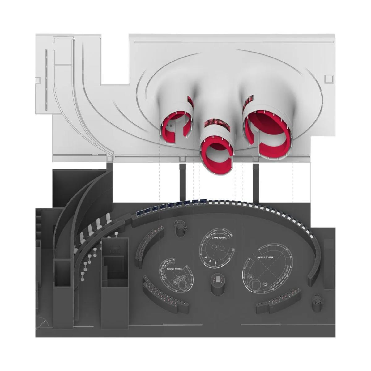 • سه ساختار استوانه‌ای از سقف آویزان شده‌اند که به عنوان «درگاه‌های تجربه» مشتریان را به تعامل مستقیم و زنده با محصولات دعوت می‌کنند.