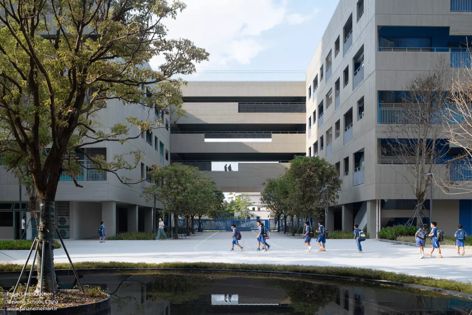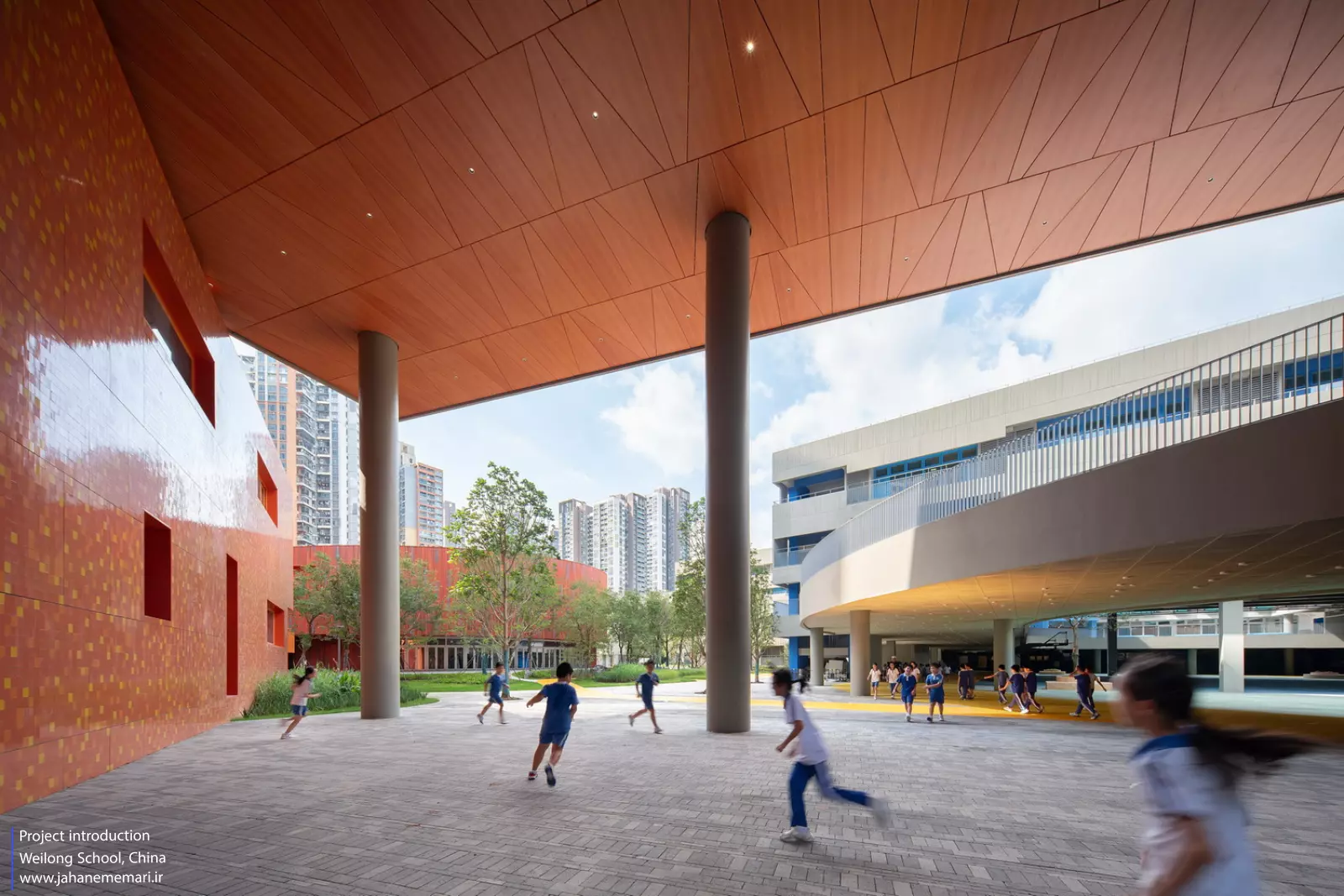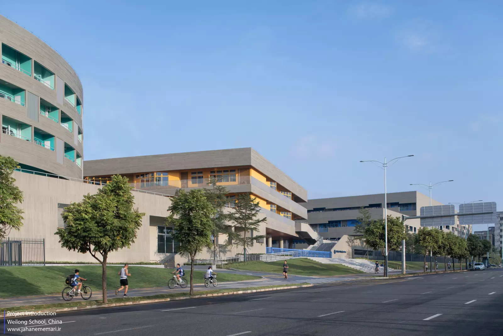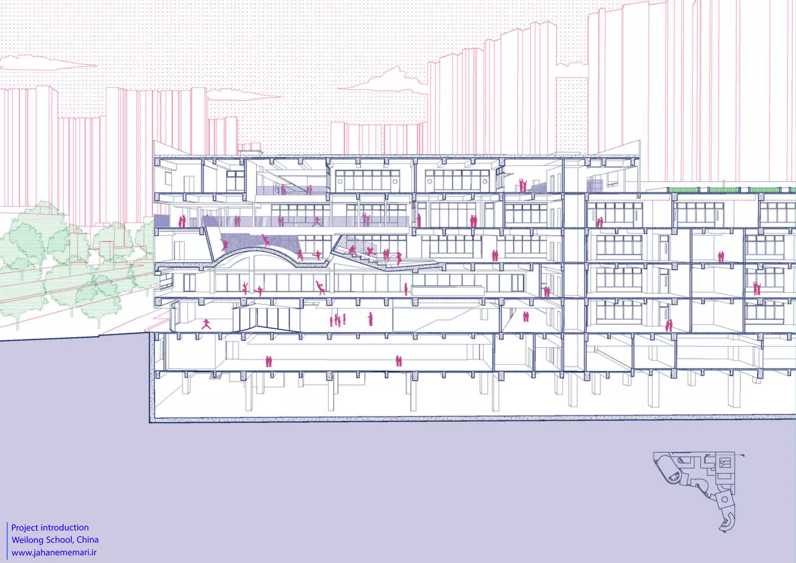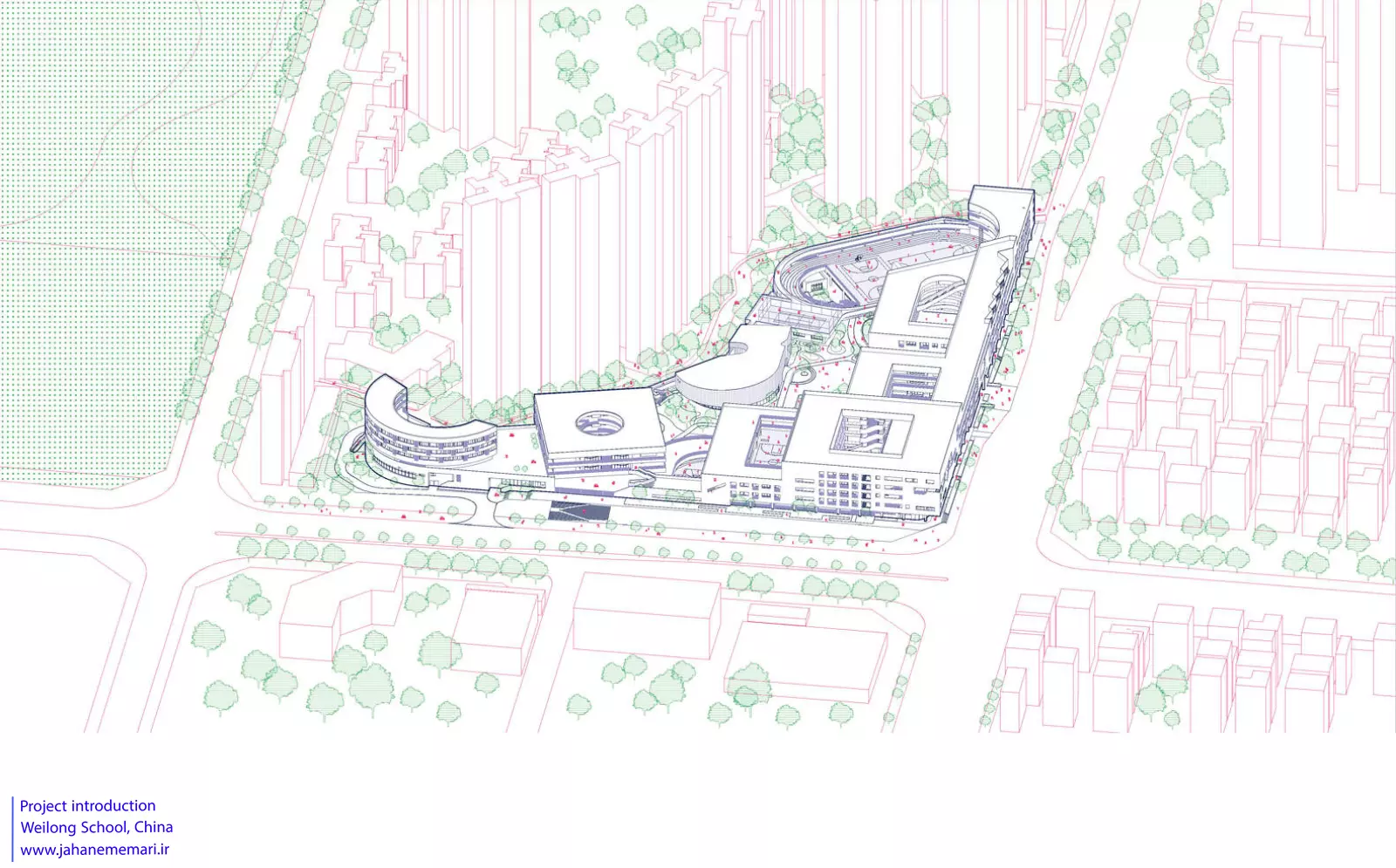 فضاهای عملکردی مشترک در امتداد لبه‌های سایت قرار گرفته‌اند؛ جبههٔ همکف ستون‌دار رو به خیابان به‌سوی شهر گشوده است و گذرگاه‌ها به سمت جامعه امتداد می‌یابند و واجد یک مرز ترکیبی میان مدرسه و محله می‌شوند. طراحی، مدل فضایی خلاقانهٔ «واحدهای مدرسه + خوشه‌های راهرو» را معرفی می‌کند؛ سیستمی که ساختار حیاط‌محور خانه‌های حصاردار را به چند واحد مستقل آموزشی تفکیک می‌کند، به‌گونه‌ای که هر واحد متناسب با مرحلهٔ یادگیری شکل گرفته است.