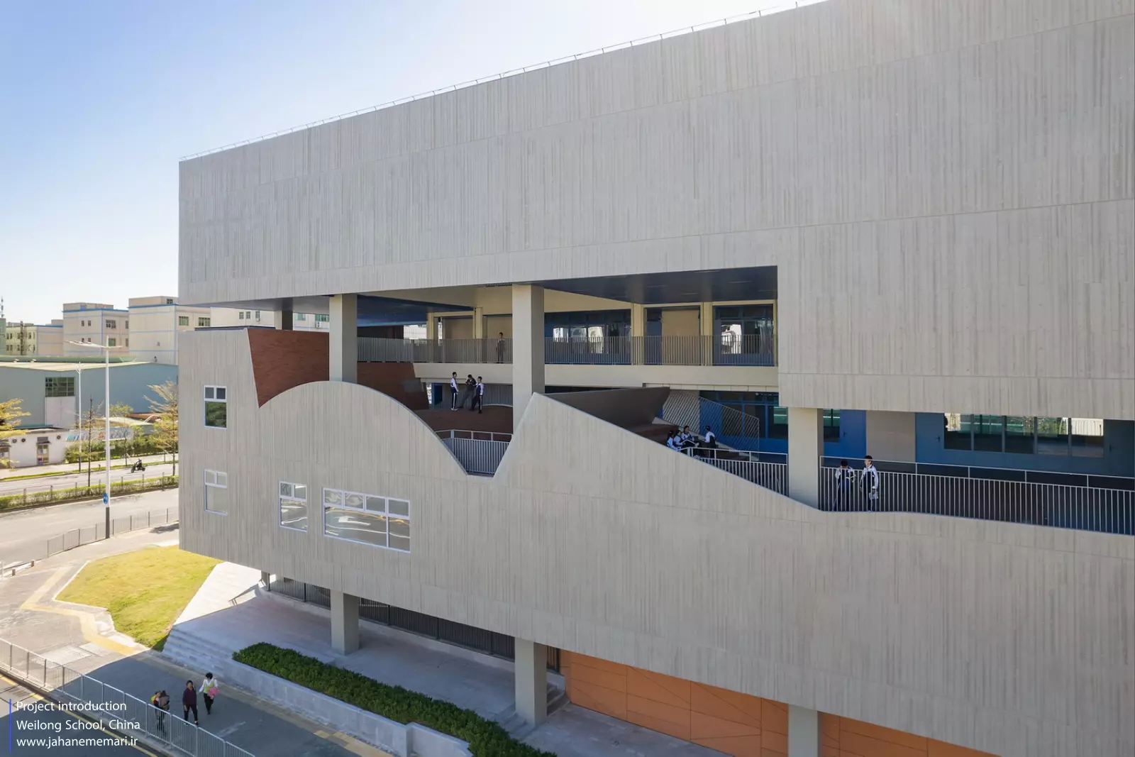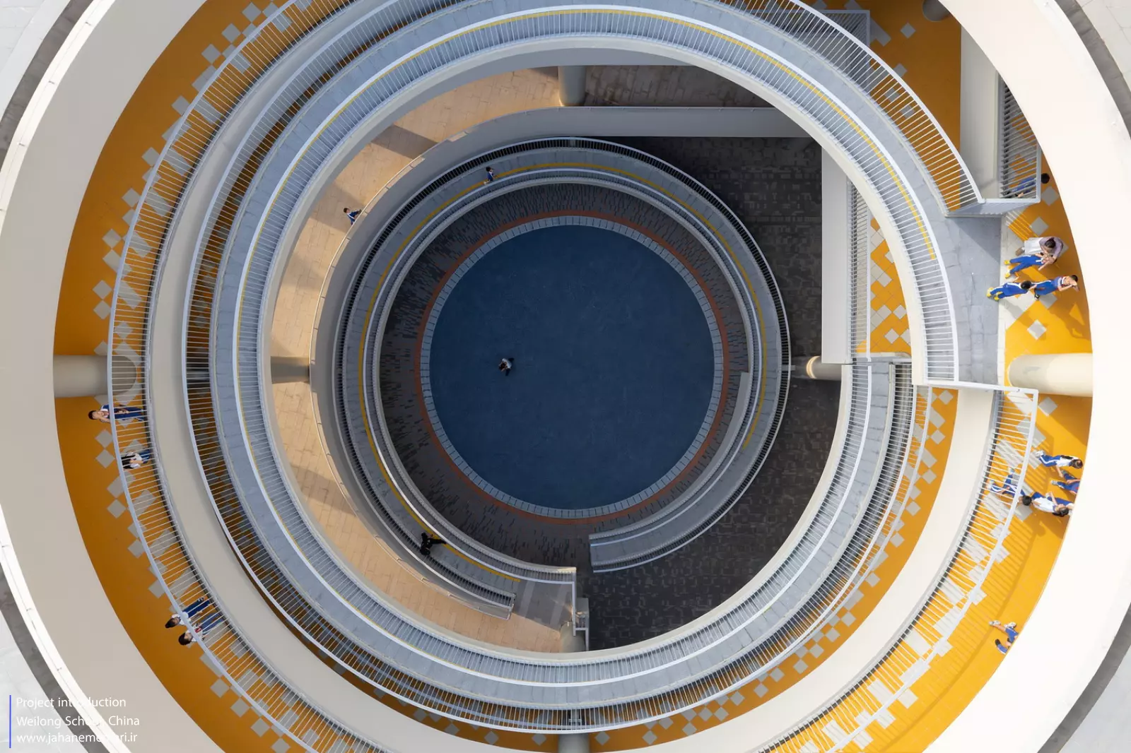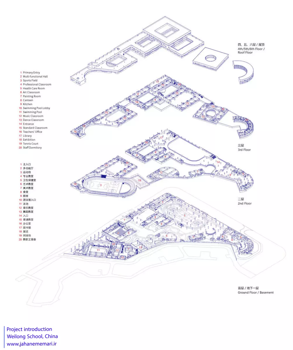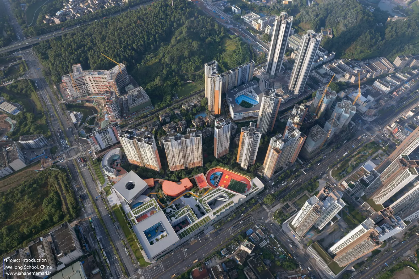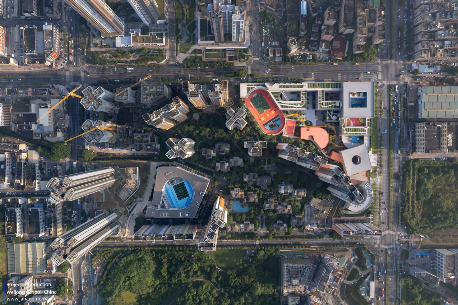 فضاهای عملکردی مشترک در امتداد لبه‌های سایت قرار گرفته‌اند؛ جبههٔ همکف ستون‌دار رو به خیابان به‌سوی شهر گشوده است و گذرگاه‌ها به سمت جامعه امتداد می‌یابند و واجد یک مرز ترکیبی میان مدرسه و محله می‌شوند. طراحی، مدل فضایی خلاقانهٔ «واحدهای مدرسه + خوشه‌های راهرو» را معرفی می‌کند؛ سیستمی که ساختار حیاط‌محور خانه‌های حصاردار را به چند واحد مستقل آموزشی تفکیک می‌کند، به‌گونه‌ای که هر واحد متناسب با مرحلهٔ یادگیری شکل گرفته است.
