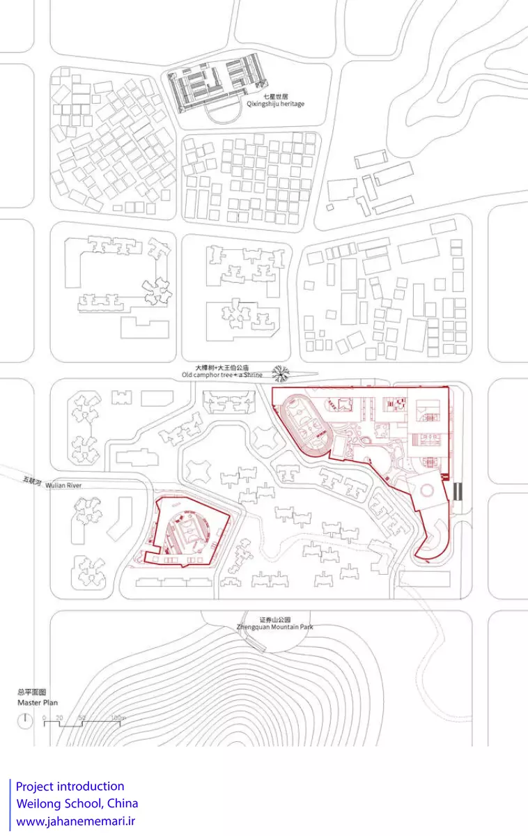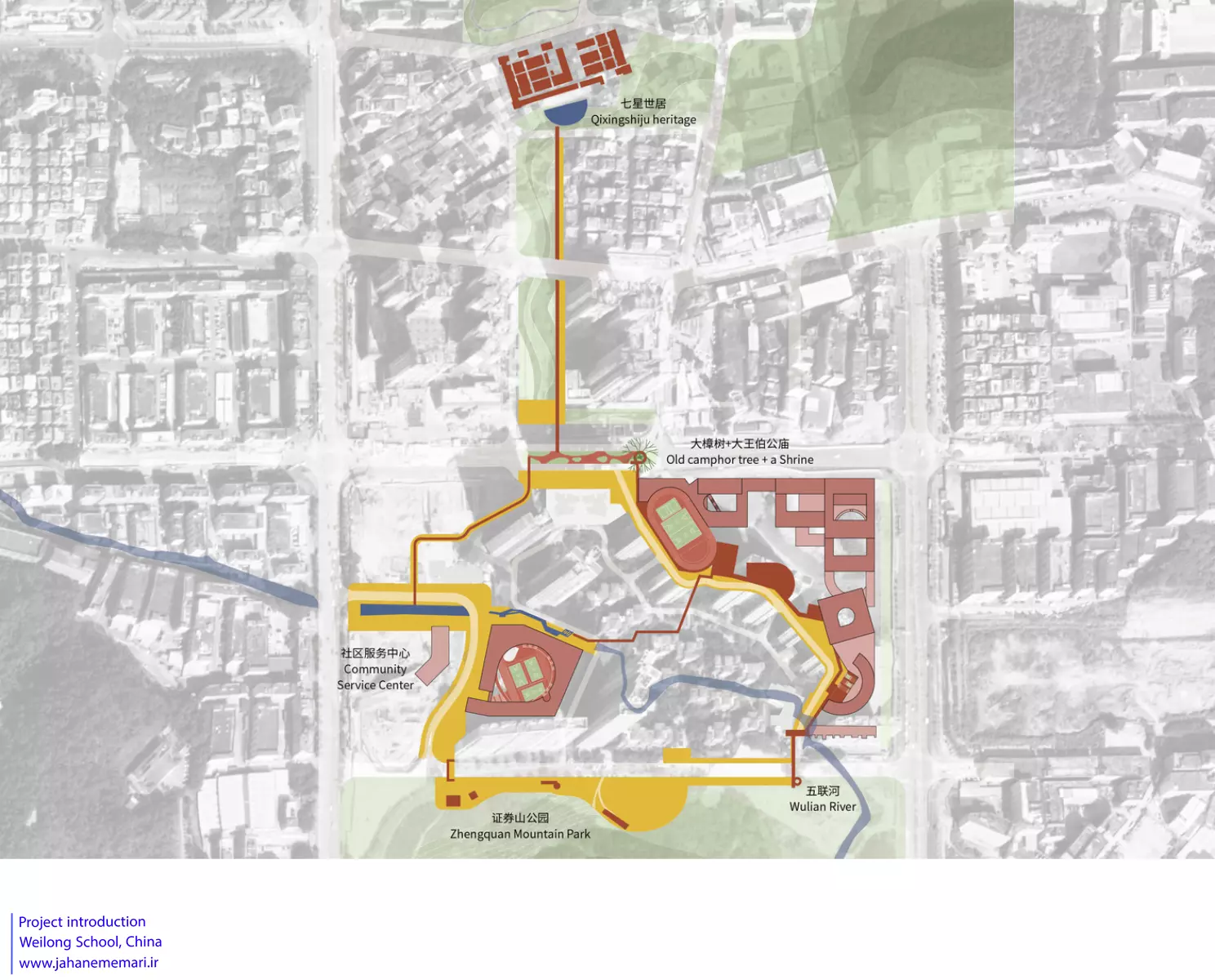 سایت پروژه از مناطق مسکونی، پارک‌های صنعتی و یک روستای شهری تشکیل شده است. در ورودی روستا، در معبد داوانگ بوگونگ و زیر درخت انجیر معابدِ صدساله، همچنان عود روشن است. چند صد متر شمال‌تر، «خانه‌های حصاردار هاکا»، یعنی اقامتگاه تاریخی «چی‌شینگ شیجو» قرار دارد. از شمال به جنوب، دو تپه و یک درخت تنها، محور ظریف شهری–طبیعی–فرهنگی را ترسیم می‌کنند. «مدرسه ویلُنگ» (ابتدایی و متوسطه) در گوشهٔ شمال‌شرقی و در کنار یک محور اصلی شهری قرار گرفته، در حالی‌که «مدرسه ویوو» (ابتدایی) در جنوب‌غربی واقع شده و رودخانه‌ای کوچک از میان آن عبور می‌کند و یک مجتمع مسکونی بلندمرتبه میان این دو قرار دارد.