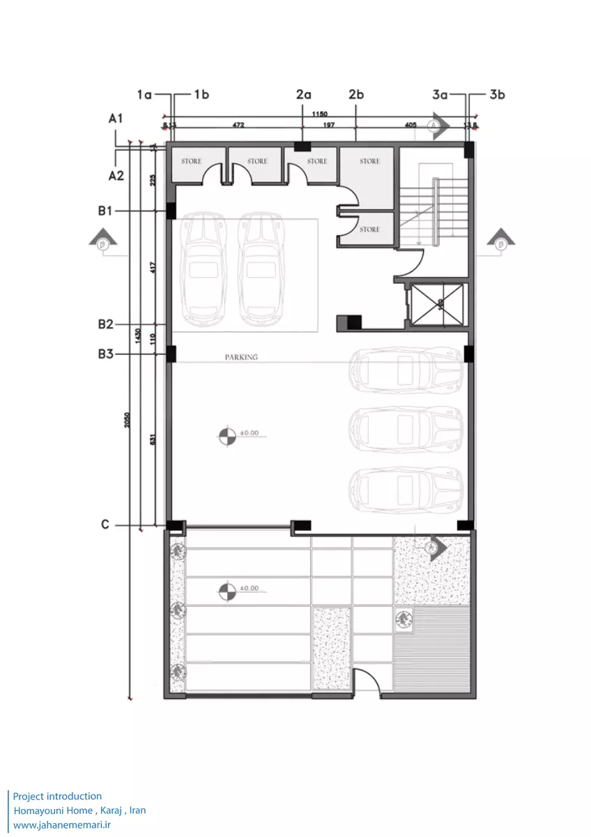 پارکینگ و ذخیره سازی: فضای پارکینگ با استفاده از تفاوت رنگ در متریال به دو قسمت جداگانه تقسیم می شود. وقتی به سمت انبارها می رویم، رنگ نارنجی که از رنگ قاب ها در نما الهام گرفته است، فضای گرمی ایجاد می کند. فضای حصیری در بخش ورودی ساختمان که زیبایی بازی سایه و نور را در ساعات و روزهای مختلف سال دو چندان خواهد کرد، به ایجاد تفاوت میان دو قسمت کمک زیادی کرده است.