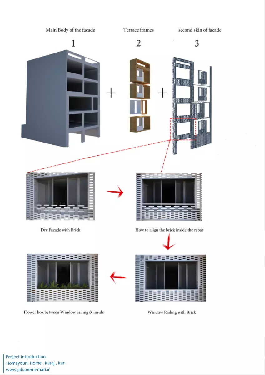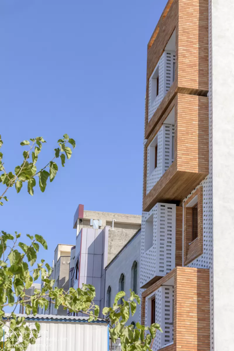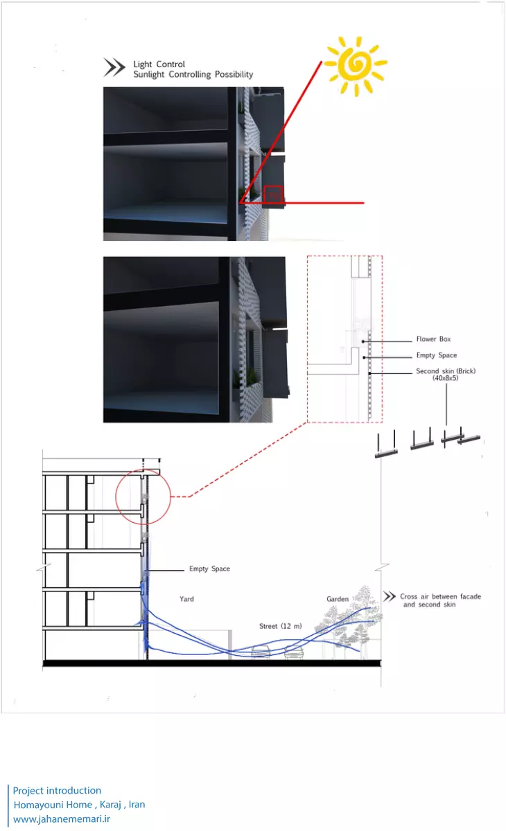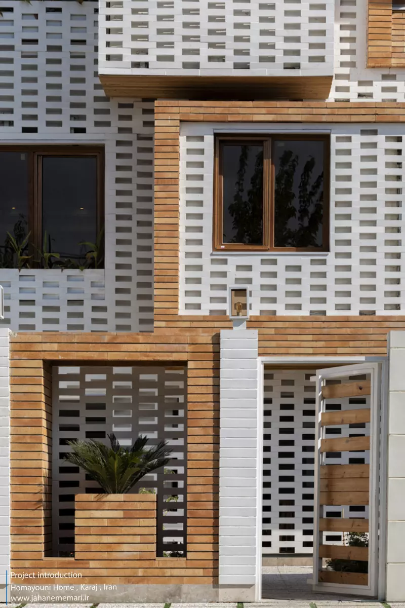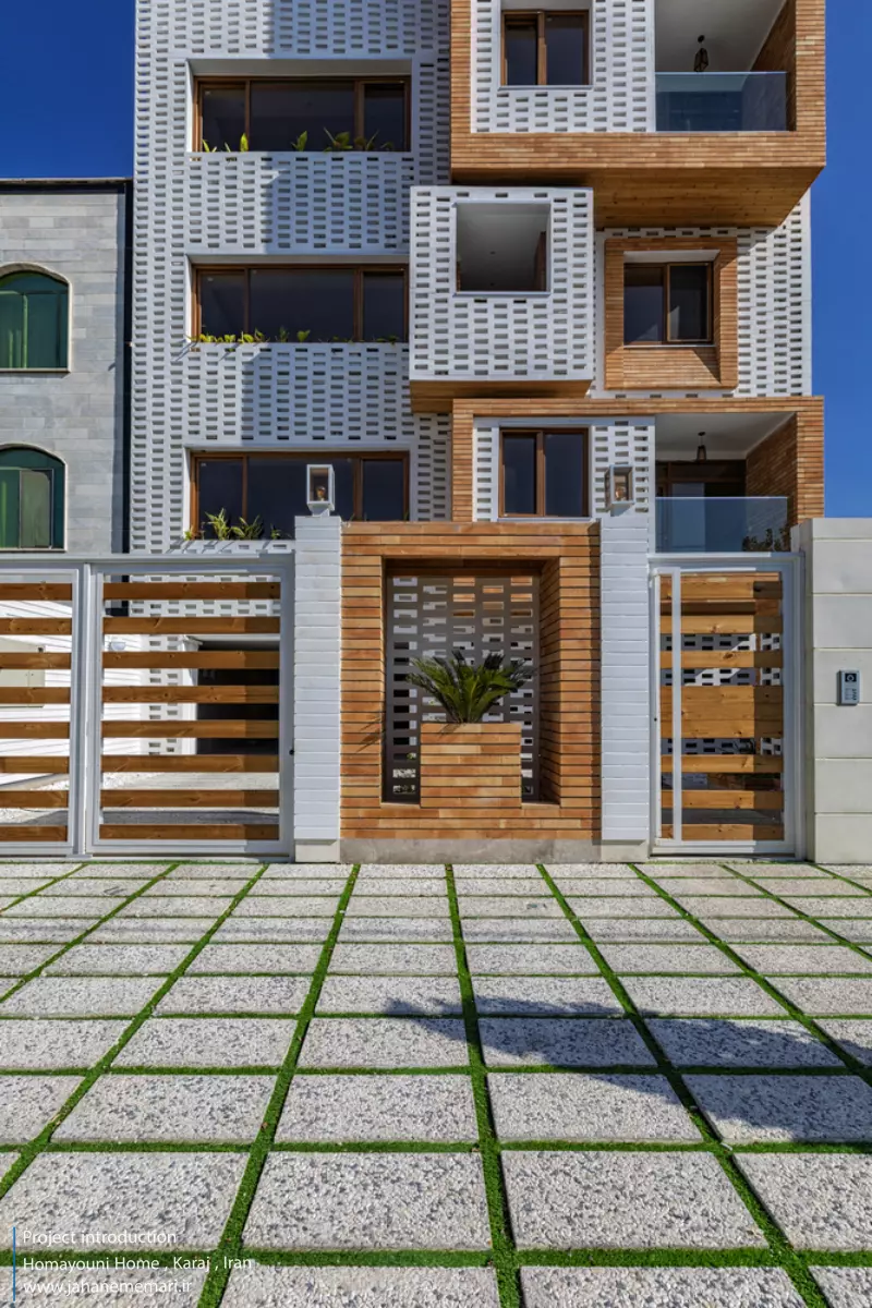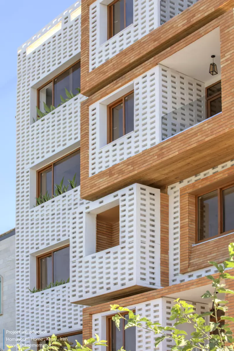 نمای پروژه: طراحی آجرهای مشبک ایرانی به همراه مکعب های تراس که از قلب ساختمان بر آمده اند، ترکیبی مناسب، استاندارد و چشم نوازی را ایجاد کرده اند. اجرای نما با آجرهای مشبک سفید در فاصله بیست سانتی متر از نمای اصلی که میل به ایجاد نمای دو پوسته را ایجاد می کند و با توجه به موقعیت مکانی باعث تهویه مناسب و ورود هوای تازه به فضا می شود. وجود آجرهای پنج سانتی متری با فاصله بیست سانتی متر مهار می شوند تا بدین ترتیب دیگر نیازی به استفاده مداوم از وسایل برودتی نباشد و انتخاب رنگ سفید حاکی از اصرار طراح بر میزان و تعادل دما و حتی صرفه جویی در هزینه های زندگی در ساختمان می باشد.